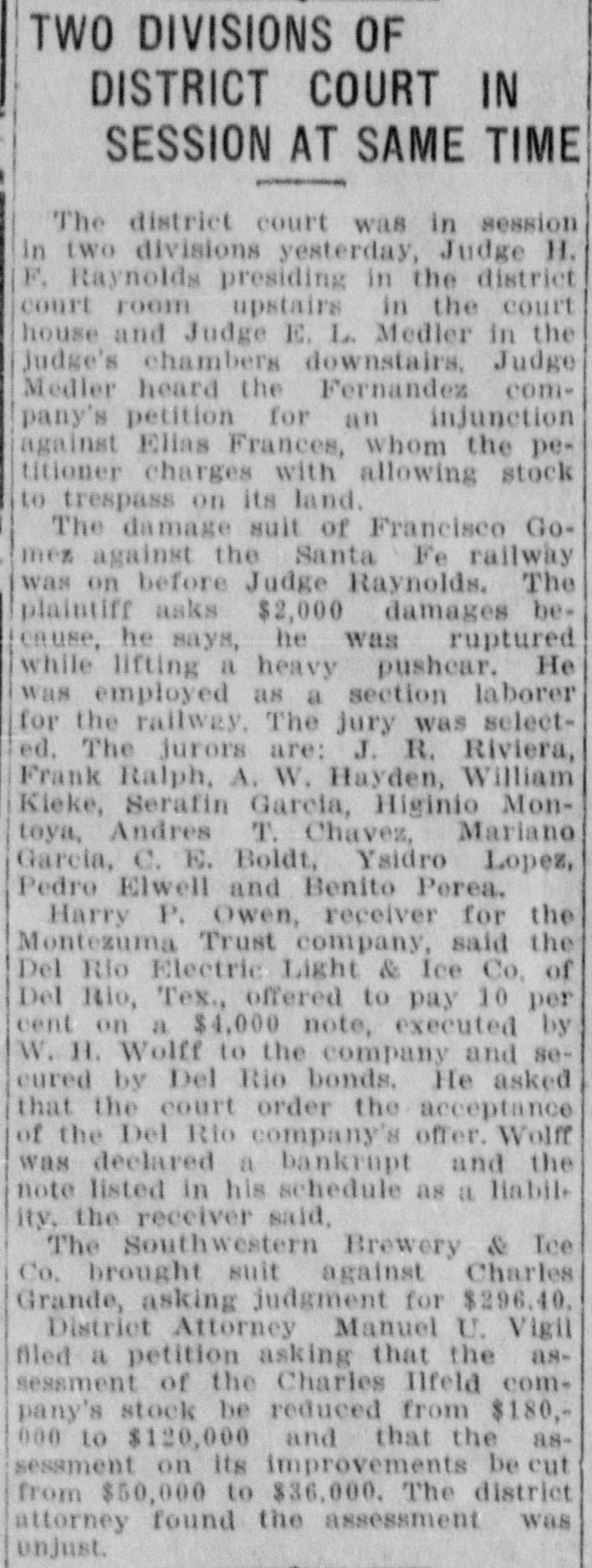 # TWO DIVISIONS OF # DISTRICT COURT IN # SESSION AT SAME TIME The district court was in session in two divisions yesterday, Judge H. F. Raynolds presiding in the district court room upstairs in the court house and Judge E. L. Medler in the Judge's chambers downstairs, Judge Medler heard the Fernandez company's petition for an injunction against Elias Frances, whom the petitioner charges with allowing stock to trespass on its land. The damage suit of Francisco Gomez against the Santa Fe railway was on before Judge Raynolds. The plaintiff asks $2,000 damages because, he says, he was ruptured while lifting a heavy pushcar. He was employed as a section laborer for the railway. The jury was selected. The jurors are: J. R. Riviera, Frank Ralph, A. W. Hayden, William Kieke, Serafin Garcia, Higinio Montoya, Andres T. Chavez, Mariano Garcia, C. E. Boldt, Ysidro Lopez, Pedro Elwell and Benito Perea. Harry P. Owen, receiver for the Montezuma Trust company, said the Del Rio Electric Light & Ice Co. of Del Rio, Tex., offered to pay 10 per cent on a $4,000 note, executed by W. H. Wolff to the company and secured by Del Rio bonds. He asked that the court order the acceptance of the Del Rio company's offer. Wolff was declared a bankrupt and the note listed in his schedule as a liability, the receiver said. The Southwestern Brewery & Ice Co. brought suit against Charles Grande, asking judgment for $296.40. District Attorney Manuel U. Vigil filed a petition asking that the assessment of the Charles Ilfeld company's stock be reduced from $180,000 to $120,000 and that the assessment on its improvements be cut from $50,000 to $36,000. The district attorney found the assessment was unjust.