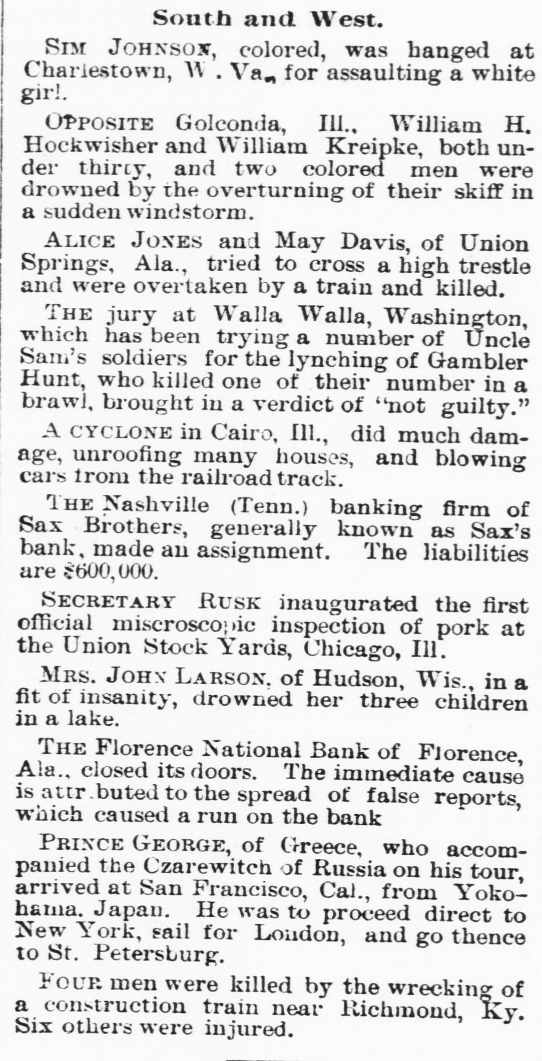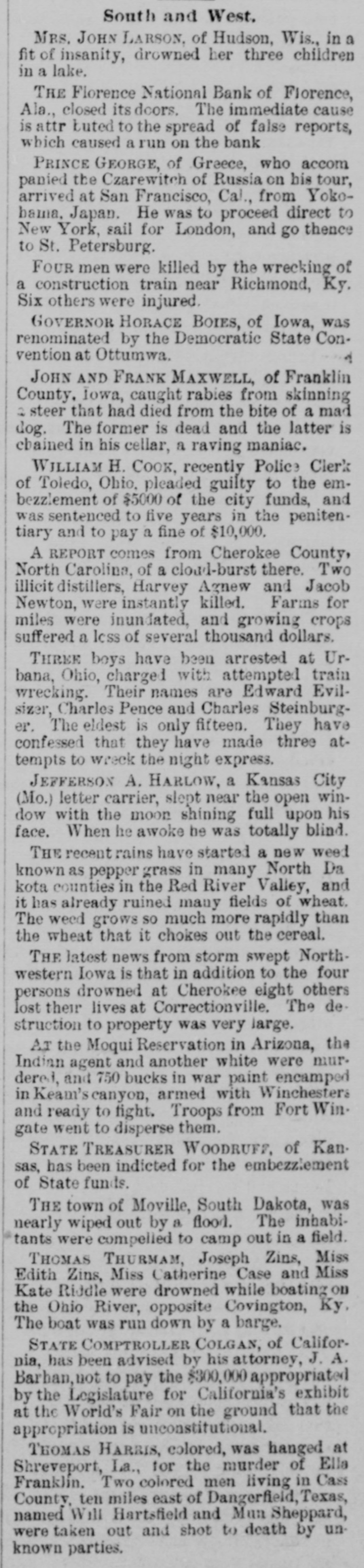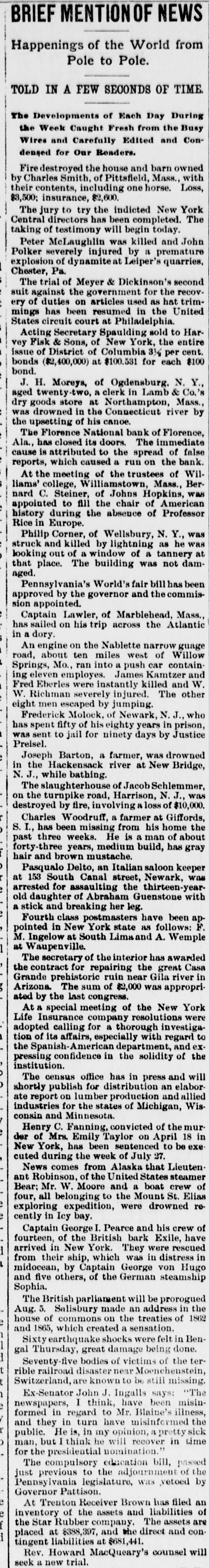NEWS IN BRIEF. n A Condensation of Interesting Items on Various Subjects. 1 Commencement at Yale college this week. , The Florence (Ala.) National bank has ) closed its doors. e The North American Turner Bund closed at Indianapolis. s Mrs. Lucy Broadly fell into an old well near Logansport, Ind., and was killed. t Henry S. Ives was in Wall street again Monday, looking pale, but chipper as ever. Mrs. Samuel Mather, of Cleveland, O., ) gave $75,000 to the Western Reserve uni) versity. I Houston O'Benchain shot H. N. Trout, a detective, at Troutville, Va., and then ) killed himself. A tornado in southern Kentucky destroyed about fifty houses and $35,000 worth of crops. It cost Pennsylvania over $85,000 to maintain and transport troops during the coke region riots. The country around Guilford, Ind., was storm-swept Saturday night, with a big loss of life of cattle. Francis H. Brown, the well known composer and author, died Tuesday, aged 73, at Stamford, Conn. Rioting Mishawka (Ind.) men took possession of a saloon and had a glorious time until stopped by officers. Frank Powell, a circus man, was drowned at Fort Wayne, Ind., while swimming in St. Mary's river. Four valuable horses belonging to William Seymour, near Newark, O., got on the railroad track and were killed. W. W. Cornell, of Newark, O., the father of a pretty daughter, shot William Shep ard, her lover, for courting her. Clara Delact. aged 10, of near Sidney, O., while playing in a hay field, had her right foot severed by a mowing-machine. William Caldwell was sentenced at Houston to be hanged July 31 for the mur der of Dr. Shamblin in August, 1888. S. B. Morris, proprietor of a drug store in north Denver, was mysteriously poisoned and robbed of $200 at Sterling, Colo. At Fostoria, O., Flynn Short was killed by being run over by a train at the Columbus, Hocking Valley and Toledo cross ing. Young Craig, son of Carroll Craig, of Smith's Grove, Ky., who was hurt by a binder in a runaway some days ago, is dead. Peter McLaughlin and John Polker, the latter a naturalized Italian, were killed at Chester, Pa., by a premature explosion of dynamite. The brickmakers' strike at Denver has been declared off. After months of waiting, the men were compelled to acknowledge defeat. At Sheepshead Bay Kingston made a new record for the Fut rity course, running the distance, a little short of six furlongs, in 1:08. S. B. Morris, a Denver druggist, disappeared with a roll of bills, and was found dead and robbed. A coroner's jury decided he was poisoned. Bill Elliott's paper, the Columbus (O.) Sunday Capital, was sold at receiver's sale for $450. Before Elliott's trouble it made him over $5,000 a year. The Old State bank, of Nashville, Messrs. Sax proprietor, has suspended. it is estimated that the nominal assets are about $600,000, with liabilities about the same, and is is stated that the de