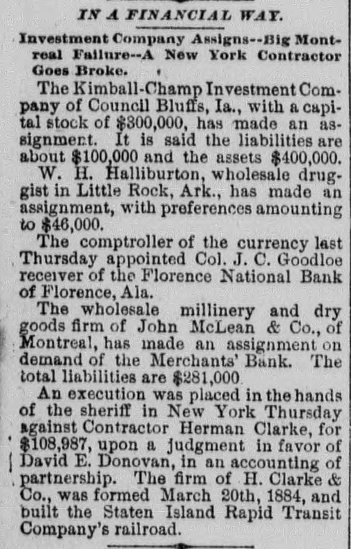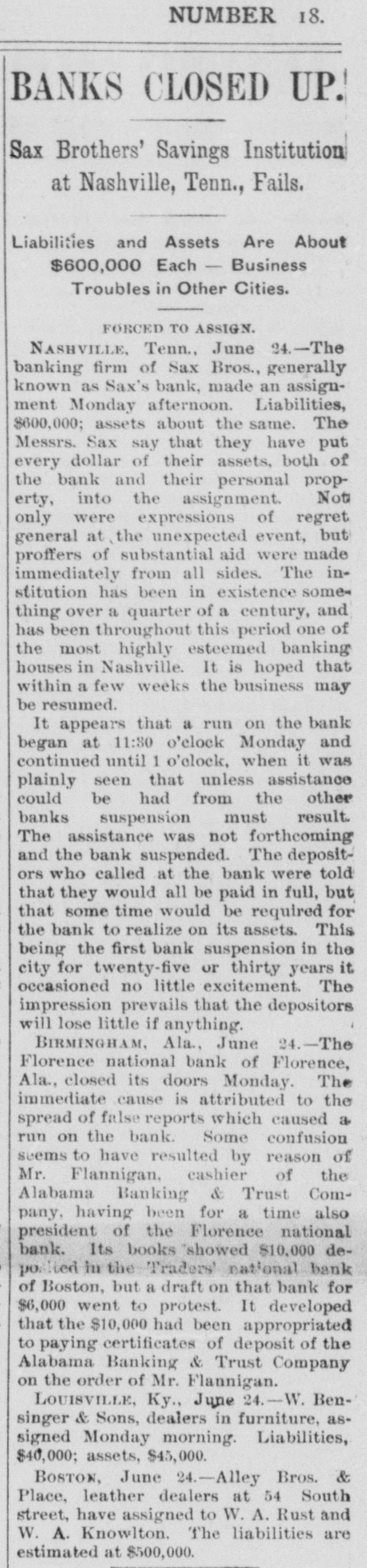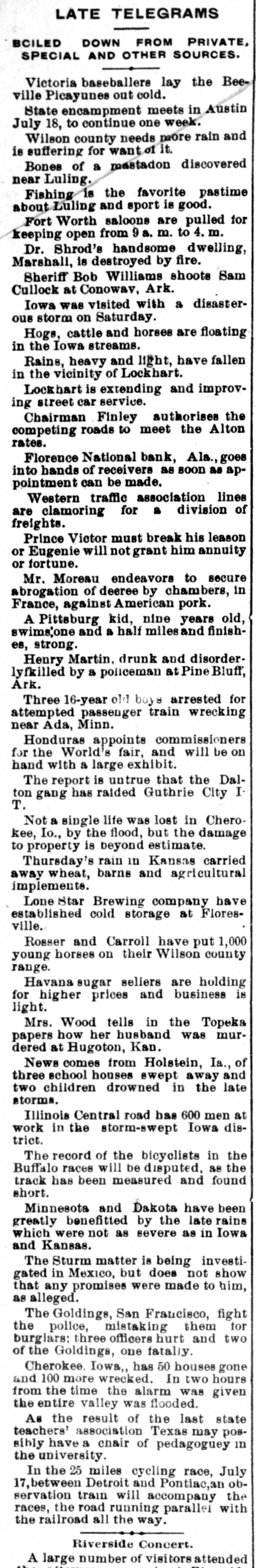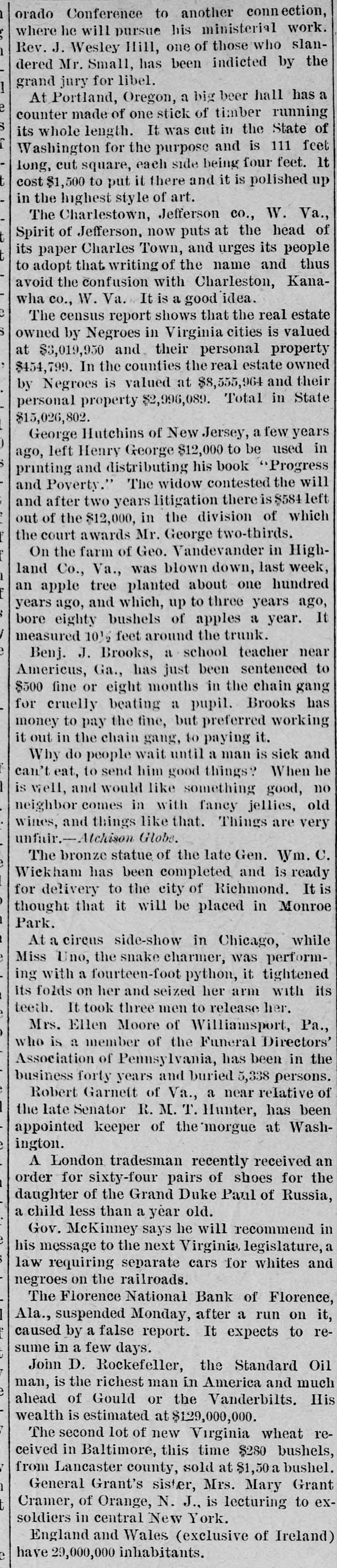 NEWS IN BRIEF. n A Condensation of Interesting Items on Various Subjects. 1 Commencement at Yale college this week. , The Florence (Ala.) National bank has ) closed its doors. e The North American Turner Bund closed at Indianapolis. s Mrs. Lucy Broadly fell into an old well near Logansport, Ind., and was killed. t Henry S. Ives was in Wall street again Monday, looking pale, but chipper as ever. Mrs. Samuel Mather, of Cleveland, O., ) gave $75,000 to the Western Reserve uni) versity. I Houston O'Benchain shot H. N. Trout, a detective, at Troutville, Va., and then ) killed himself. A tornado in southern Kentucky destroyed about fifty houses and $35,000 worth of crops. It cost Pennsylvania over $85,000 to maintain and transport troops during the coke region riots. The country around Guilford, Ind., was storm-swept Saturday night, with a big loss of life of cattle. Francis H. Brown, the well known composer and author, died Tuesday, aged 73, at Stamford, Conn. Rioting Mishawka (Ind.) men took possession of a saloon and had a glorious time until stopped by officers. Frank Powell, a circus man, was drowned at Fort Wayne, Ind., while swimming in St. Mary's river. Four valuable horses belonging to William Seymour, near Newark, O., got on the railroad track and were killed. W. W. Cornell, of Newark, O., the father of a pretty daughter, shot William Shep ard, her lover, for courting her. Clara Delact. aged 10, of near Sidney, O., while playing in a hay field, had her right foot severed by a mowing-machine. William Caldwell was sentenced at Houston to be hanged July 31 for the mur der of Dr. Shamblin in August, 1888. S. B. Morris, proprietor of a drug store in north Denver, was mysteriously poisoned and robbed of $200 at Sterling, Colo. At Fostoria, O., Flynn Short was killed by being run over by a train at the Columbus, Hocking Valley and Toledo cross ing. Young Craig, son of Carroll Craig, of Smith's Grove, Ky., who was hurt by a binder in a runaway some days ago, is dead. Peter McLaughlin and John Polker, the latter a naturalized Italian, were killed at Chester, Pa., by a premature explosion of dynamite. The brickmakers' strike at Denver has been declared off. After months of waiting, the men were compelled to acknowledge defeat. At Sheepshead Bay Kingston made a new record for the Fut rity course, running the distance, a little short of six furlongs, in 1:08. S. B. Morris, a Denver druggist, disappeared with a roll of bills, and was found dead and robbed. A coroner's jury decided he was poisoned. Bill Elliott's paper, the Columbus (O.) Sunday Capital, was sold at receiver's sale for $450. Before Elliott's trouble it made him over $5,000 a year. The Old State bank, of Nashville, Messrs. Sax proprietor, has suspended. it is estimated that the nominal assets are about $600,000, with liabilities about the same, and is is stated that the de