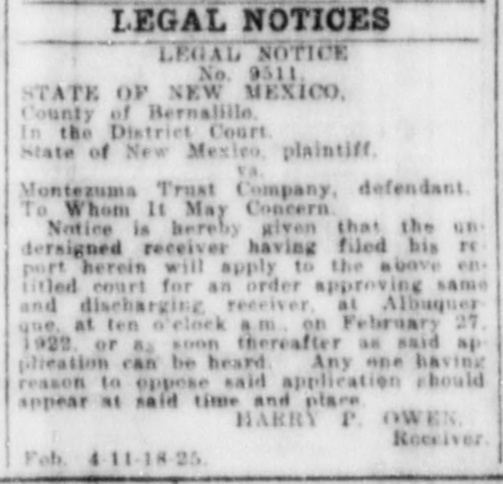 LEGAL NOTICES LEGAL NOTICE No. 9511. STATE OF NEW MEXICO County of Bernaliile In the District Court State of New Mexico plaintiff. Va Montezuma Trust Company defendant To Whom It May Concern Notice is hereby given that the GB. dersigned receiver having filed his " port herein will apply to the above enlitled court for an order approving same and discharging receiver at Albuquer are at ten o'clock a.m on February 27 1922 or 82 EOOB thereafter as said up pilication can be heard Any one having reason to oppose said application should appear at said time and place MARRY P. OWEN Receiver Feb. 4-11-18-25