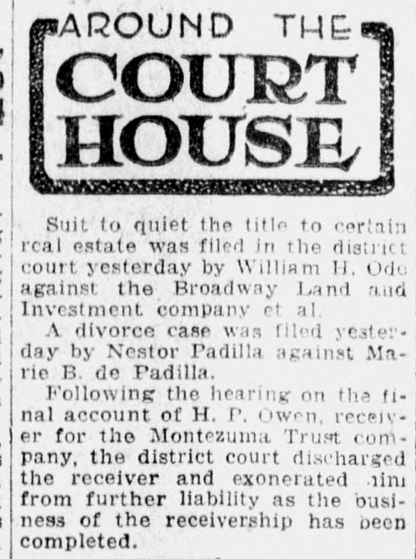 Suit to quiet the title to certain real estate was filed in the district court yesterday by William H. Ode against the Broadway Land and Investment company et al.