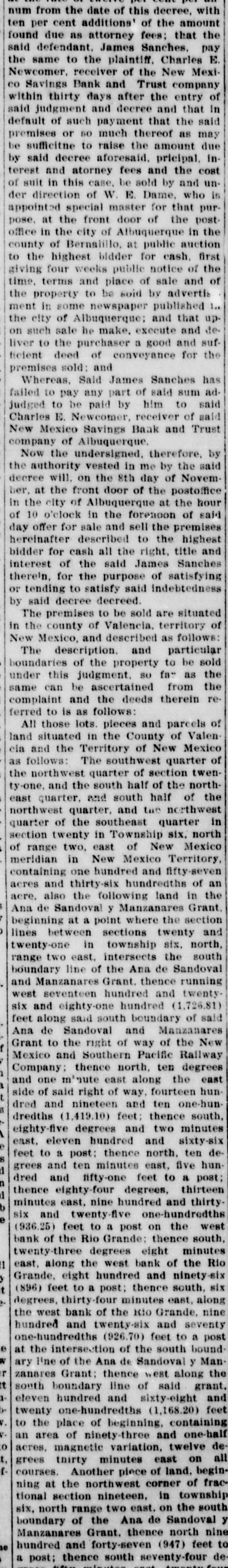 Now the undersigned, therefore, by the authority vested in me by the said decree will, on the 8th day of November, at the front door of the postoffice in the city of Albuquerque at the hour of 10 o'clock in the forenoon of said day offer for sale and sell the premises hereinafter described to the highest bidder for cash all the right, title and interest of the said James Sanches therein, for the purpose of satisfying or tending to satisfy said indebtedness by said decree decreed.