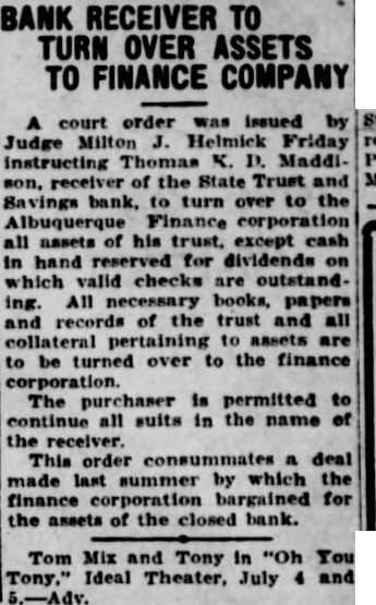 BANK RECEIVER TO TURN OVER ASSETS TO FINANCE COMPANY A court order was issued by Judge Milton J. Helmick Friday instructing Thomas K. D. Maddison, receiver of the State Trust and Savings bank, to turn over to the Albuquerque Finance corporation all assets of his trust, except cash in hand reserved for dividends on which valid checks are outstanding. All necessary books, papers and records of the trust and all collateral pertaining to assets are to be turned over to the finance corporation. The purchaser is permitted to continue all suits in the name of the receiver. This order consummates a deal made last summer by which the finance corporation bargained for the assets of the closed bank. Tom Mix and Tony in "Oh You Tony.' Ideal Theater, July 4 and 5.-Adv.