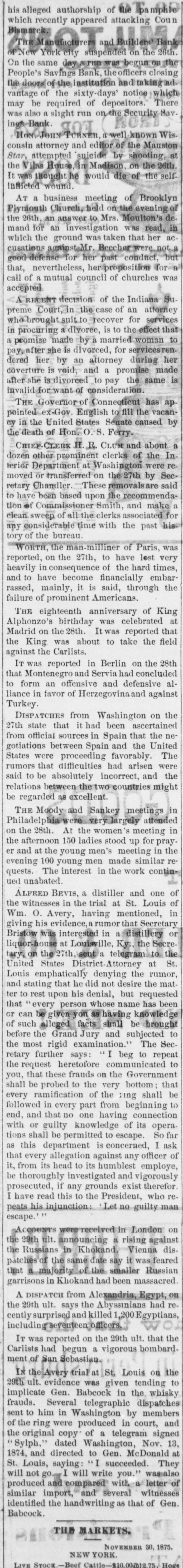 and Builders' Bank York city suspended on the 26th. On the same day arun was begun on the People's vings Bank, e officers closing doors of the institution and taking vantage of the sixty-days' notice which may be required of depositors. There was also a slight run on the Security ingt-Bank COST well known Wis. consin attorney and editor of the Mauston Star, attempted suicide by shooting, at the Vilas House, Madison on It was thought he would die of the inflicted wound AT a business meeting of Brooklyn Plymouth Church,held on the evening o the 26th, an answer to Mrs. Moulton's de mand for an investigation was read, in which the ground was taken that her accusations againstaMr Beecher were.not., good defense-for her past conduct, but that, nevertheless, her proposition for call of a mutual council of churches was accepted. A RECENT decision of the Indiana Su preme Court, in the case of an attorney wh@Gbrought.spi recover for services in procuring a divorce, is to the effect that a promise made by married-woman to pay after she is divorced, for services rendered her by an attorney during her coverture is void, and a promise made after she is divorced to pay the same is invalidafor want of consideration. THE Governor of Connecticut has ap pointed-ex4Gov. English fill the vacancy in the United States Senate caused by e death of Hon. O. S. Ferry. a CHIEF-CLERK H R. CLUM and about dozen other prominent clerks of the Interior Department at Washington were removed or transferred o he 27th by Secretary Chandler :These removals are said to have been based upon the recommenda tion of Commissioner Smith, and make clean sweep of all the clerks associated fo any considerable time with the past his tory of the bureau. WORTH, the man-milliner of Paris, was reported, on the 27th, to have lost very heavily in consequence of the hard times, and to have become financially embarrassed, mainly, it is said, through the failure of prominent Americans. THE eighteenth anniversary of King Alphonzo's birthday was celebrated at Madrid on the 28th. It was reported that the King was about to take the field against the Carlists. IT was reported in Berlin on the 28th that Montenegro and Servia had concluded to form an offensive and defensive alliance in favor of Herzegovina and against Turkey. DISPATCHES from Washington on the 27th state that it had been ascertained from official sources in Spain that the negotiations between Spain and the United States were proceeding favorably. The rumors that difficulties had arisen were said to be absolutely incorrect, and the relations between the two countries might be regarded as excellent. THE Moody and Sankey meetings in Philadelphia very_largely attended on the 28th. At the women's meeting in afternoon 150 ladies stood up for pray er and at the young men's meeting in the evening 100 young men made similar requests. The interest in the work continued unabated ALFRED BEVIS, a distiller and one of the witnesses in the trial at St. Louis of Wm. O. Avery, having mentioned, in giving his evidence,a rumor that Secretary Bristow was interested in a distillery or liquor-house at Louisville, Ky: the Secre tary, on the 27th, sent telegram to the United States District. -Attorney at St. Louis emphatically denying the rumor, and stating that he did not desire the mat ter to rest upon his denial, but requested that 'every person whose name has been or can be given you s having knowledge of such alleged facts shall be brought before the Grand Jury and subjected to the most rigid examination.' The Sec. retary further says: I beg to repeat the request heretofore communicated to you, that these frauds on the Government shall be probed to the very bottom: that every ramification of the ring shall be followed in every part from beginning to end, and that no one having connection with or guilty knowledge of its operations shall be permitted to escape. So far as this department is concerned, I ask that every allegation against any officer of it, from its head to its humblest employe, be thoroughly investigated and vigorously prosecuted, if any grounds exist therefor have read this to the President, who repeats his injunction: Let no guilty man escape. ACCOUNTS received in London on the 29th ult. announcing a rising against the Russians in Khokand, Vienna dis. patches of the same date say it was feared that a majority of the smaller Russian garrisons in Khokand had been massacred A DISPATCH from Alexandria, Egypt, on the 29th ult. says the Abyssinians had recently surprised and killed 200Egyptians, gerenteen offeets. IT was reported on the 29th ult. that the Carlists had begun a vigorous bombard ment of San Sebastian. IN the Avery trial St. Louis on the 29th ult. evidence was given tending to implicate Gen. Babcock in the whisky frauds. Several telegraphic dispatches sent to him in Washington by members of the ring were produced in court, and the original copy of a telegram signed Sylph," dated Washington, Nov. 13, 1874, and directed to Gen. McDonald at St. Louis, saying "I succeeded. They will not go.- will write you." was also produced and compared with a letter of similar import, and several witnesses identified the handwriting as that of Gen. Babcock. THE MARKETS. NOVEMBER 30, 1875. NEW YORK