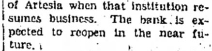 of Artesia when that institution resumes business. The bank is expected to reopen in the near future.