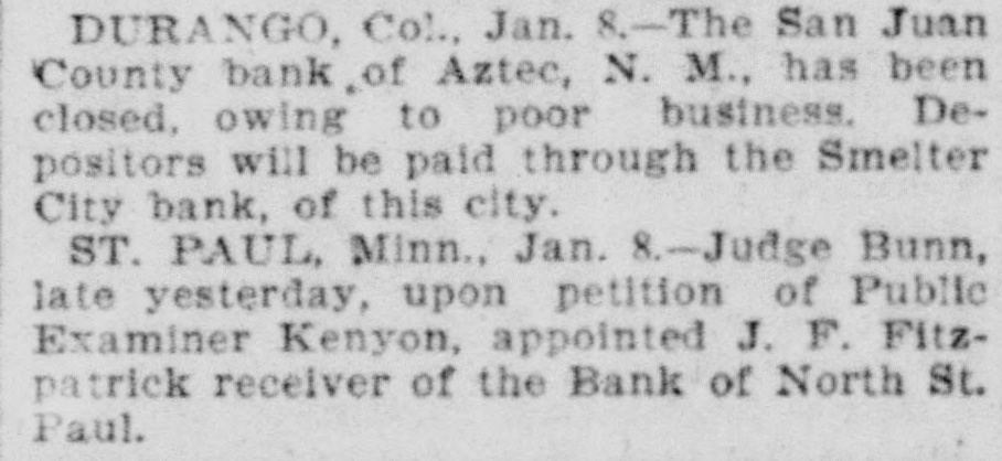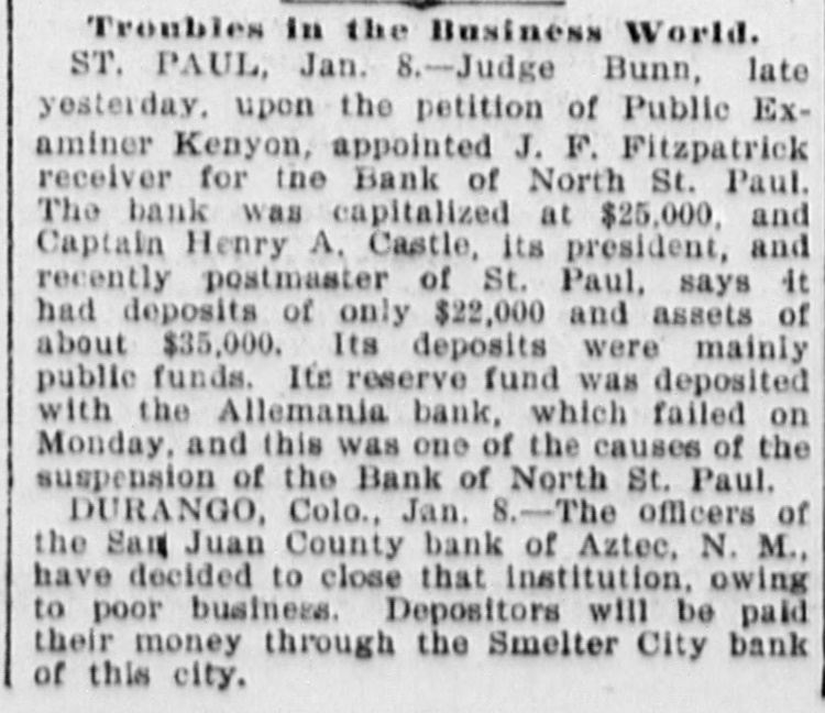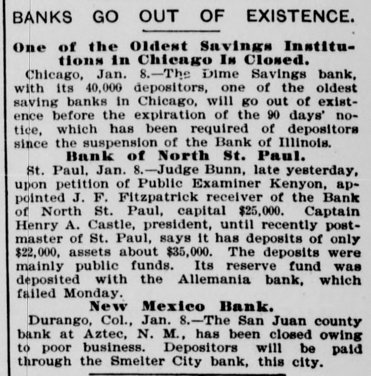 The Union Manufacturing company, iron and steel, at Boyertown, Pa., has confessed judgment for $9,000. It was incorporated in May, 1894, with a paid-in capital of $35,000. The Walker White Lead company, of Cincinnati, Ohio, has confessed judgment for $10,000, and was taken charge of by a deputy sheriff. The paid up capital of the company is $50,000. The officers of the San Juan county bank of Aztec, N. M., have decided to close that institution owing to poor business. Depositors will be paid through the Smelter City bank in Durango, Colorado. The Van Wagner-Henney Shoe company, of Sedalia, Mo., has given a trust deed. The business was started eighteen years ago and incorporated in Sept. ember, 1895, with a capital stock of $12,000. Owing to the delay in the appointment of a receiver Jacobs & Co., of New York, have attached the collateral of the defunct Columbia National Bank, of Minneapolis, Minn., on a claim of $10,000. The Bank of Canton, at Canton, Minn., with a capital $10,000, and the Citizens' bank, of Lanesboro, a small institution, both owned and operated by Field, Kelsey & Company, have suspended business. The Stewart Ceramic company, of New York, manufacturers of washtubs, basins, and ceramic ware, have assigned to Anthony R. Porter. The company was incorporated under the laws of New Jersey in 1892, with a capital stock of $200,000. Koch, Dreyfus & Co.. wholesale jewelers, of New York, have suspended. placing their affairs in the hands of attorneys to arrange a settlement with creditors. The amount involved is $200,000. The firm came from New Orleans in 1889. The stockholders of the Dansville Savings and Loan Association, at Dansville, N. Y., have been informed that the assets, $45,000, are exceeded by the lia bilities to the extent of at least n a thousand dollars. Those who will suffer for the most part are working girls. The Dime Savings bank, with 4,000 depositors, one of the old est exclusive banks in Chicago, will go out of existence before the expiration of the ninety-day day notice, which has been re quired of depositors since the suspension of the National bank of Illinois.