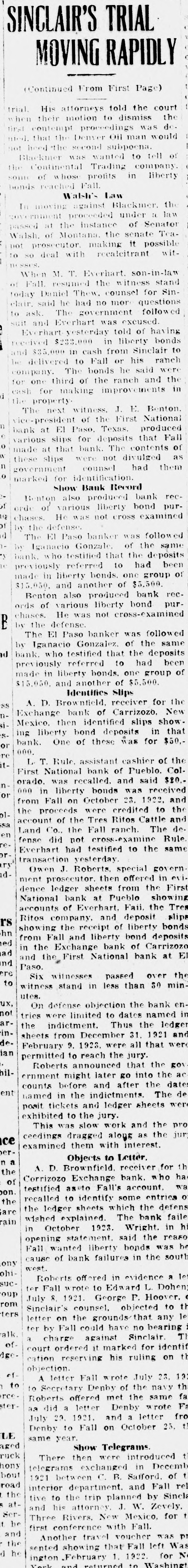 U e MOVING RAPIDLY (Continued From First Page) trial. His attorneys told the court the when their motion to dismiss first contempt proceedings was de nied. that the Denver Oil man would not need the second subpoena. Blackmen was wanted to tell of the "ontinental Trading company liberty sour of whose profits in bonds reached Fall. Waldi Law III moving against Blackmer. the government proceeded under a law passed at the instance of Senator Walsh. of Montana. the senate Teanot prosecutor. making it possible witto so deal with reenleitrant mosses. When M. T. Everhart. son-in-law of Fall. resumed the witness stand today Daniel Thew. counsel for Sinclair. said he had no mor questions to ask. The government followed suit and Everhart was excused. Everhart yesterday told of having received $233,000 in liberty bonds to and $35,000 in cash from Sinclair be delivered to Fall or his ranch company. The bonds he said were for one third of the ranch and the in d cash for making improvements the property The next witness. J. E. Benton. n rice-president of the First National bank at El Paso. Texas. produced le various slips for deposits that Fall o made at that bank. The contents of " these slips were not divulged as In government counsel had them o marked for identification. show Bank Record : Benton also produced bank rec. of orde of various liberty bond pur19 chases. He was not cross examined of by the defense d The El Paso banker was followed - in Igamacio Gonzale, of the same ty bank. who testified that the deposits " previously referred to had been of made in liberty bends. one group $15,050. and another of $5,500. Benton also produced bank records of various liberty bond purchases. He was not cross-examined E by the defense. The El Paso banker was followed by Iganacio Gonzalez. of the same d bank. who testified that the deposits been previously referred to had of made in liberty bonds. one group $15,050. and another of $5,500. Identifies Slips ss A. D. Brownfield, receiver for the n. Exchange bank of Carrizozo. New siMexico. then identified slips show. that ing liberty bond deposits in 01 s- bank. One of these was for $50.re it. 000. L.T. Rule. assistant cashier of the First National bank of Pueblo. Col. n orado. was recalled. and said $20.or 000 in liberty bonds was received from Fall on October 23. 1922. and olproceeds were credited to the sa account the of the Tres Ritos Cattle and en Land Co., the Fall ranch. The derefense did not cross-examine Rule or Everhart had testified to the same transaction yesterday ry dOwen J. Roberts. special govern ment prosecutor. then offered in evi. dence ledger sheets from the First National bank at Pueblo showing accounts of Everhart. Faii. the slips Tres Ritos company. and deposit rs hn showing the receipt of liberty bonds ed from Fall and liberty bond deposits ad in the Exchange bank of Carrizozo nd and the First National bank at El ere Paso. Six witnesses passed over the to witness stand in less than 30 minux, utes. On defense objection the bank ennot tries were limited to dates named in arthe indictment. Thus the ledger insheets from December 31. 1921 and deian February 9. 1923. were all that were permitted to reach the jury. Roberts announced that the 50 bilernment might later go into the ac counts before and after the dates ent named in the indictments The were de pasit tickets and ledger sheets exhibited to the jury. This was slow work and the pro ce ceedings dragged alous as the jur examined them with interest. erObjects to Letter. In a the A.D. Brownfield receiver for ha th of Corrizozo Exchange bank. who bon. testified assto Fall's account. wa o the recalled to identify some entries are the ledger sheets which the defens rain wished explained. The bank faile October 1923. Wright. in hi opening in statement. said the reaso be Fall wanted liberty bonds was ony cause of bank failures in the south ohisucwest. Roberts offered in evidence a 10 oup Fall wrote to Edward L. Dohen o rom July ter 8. 1921. George P. Hoover. th ters Sinclair's counsel. objected to le letter on the grounds/that any talk ter by Fall could have no bearing T i charge against Sinclair. of dgecourt ordered it marked for identif th cation reserving his ruling on of objection. A letter Fall wrote July 23. 19 to Secretary Denby of the navy th ree sterto Roberts offered met the same Fa fa as did a letter Denby wrote fro July 22. 1921. and a letter t Denby to Fall on October 25. LE same year. aged Show Telegrams. t ruck There then were introduced hony bout telegrams exchanged in Decemb , 1921 between C. R. Safford. of road the interior department. and Fall rel Sincla tive to the trip planned by Serand his attorney. J. W. Zevely. t be Three Rivers. New Mexico, for first conference with Fall. and the Another travel voucher was D d he sented showing that Fall left Was No February 1. 1922 for ington returned to Washingt