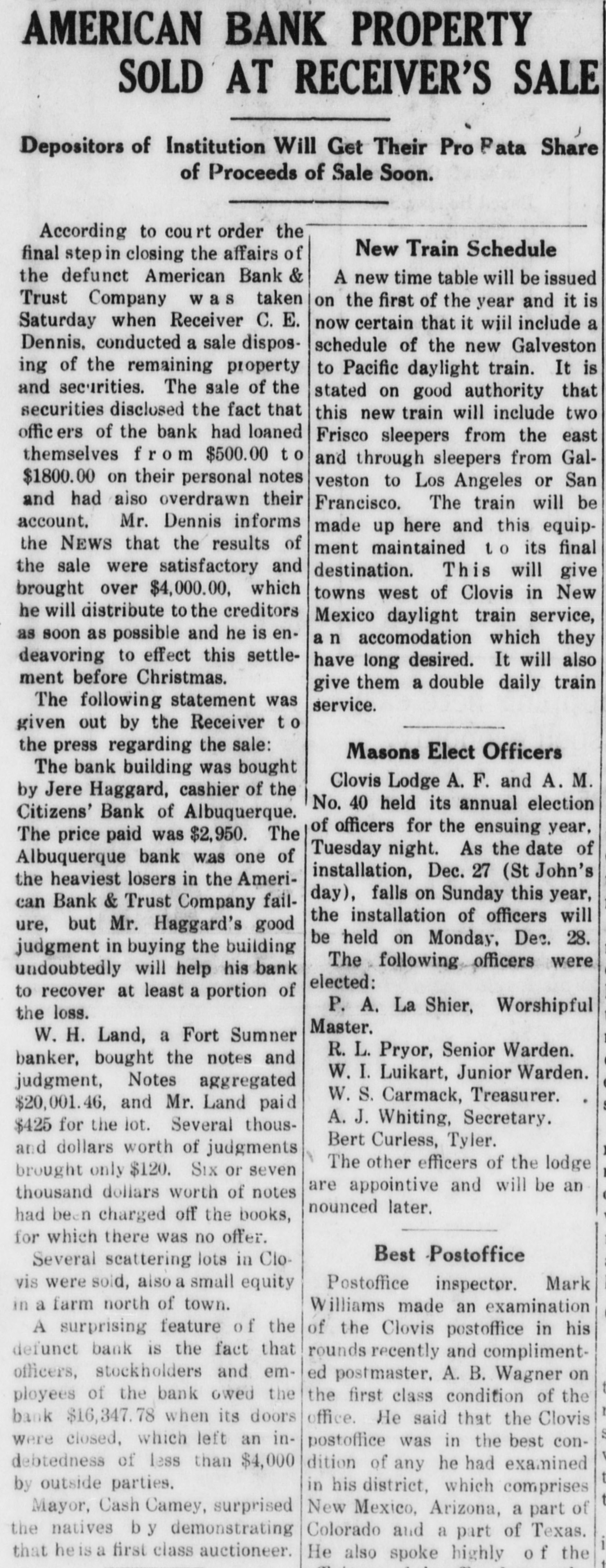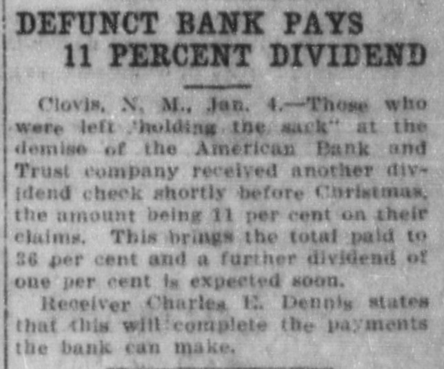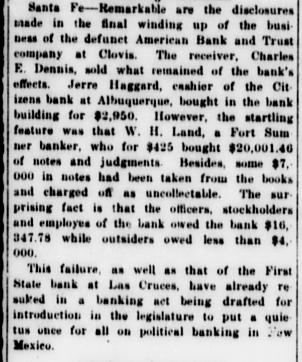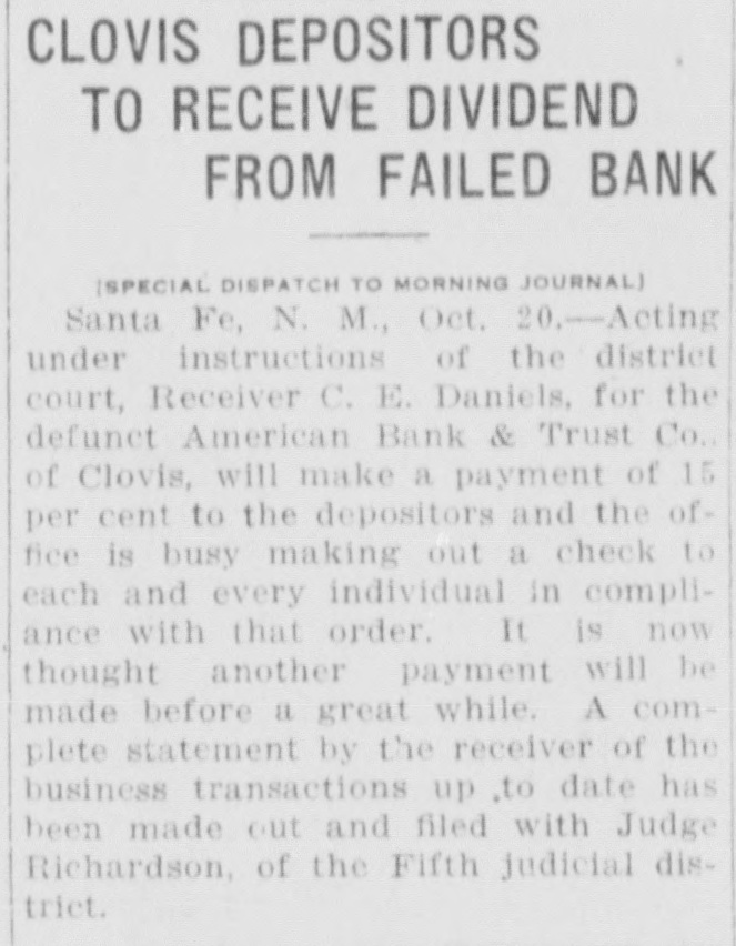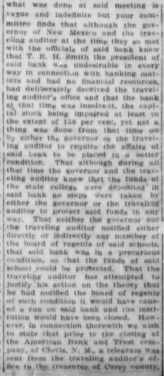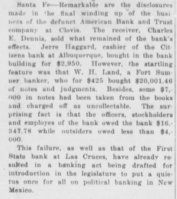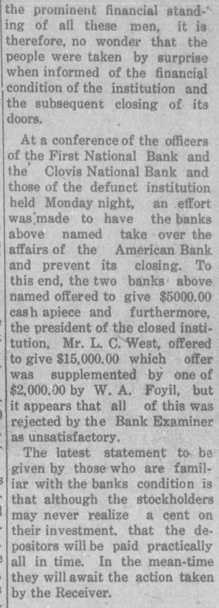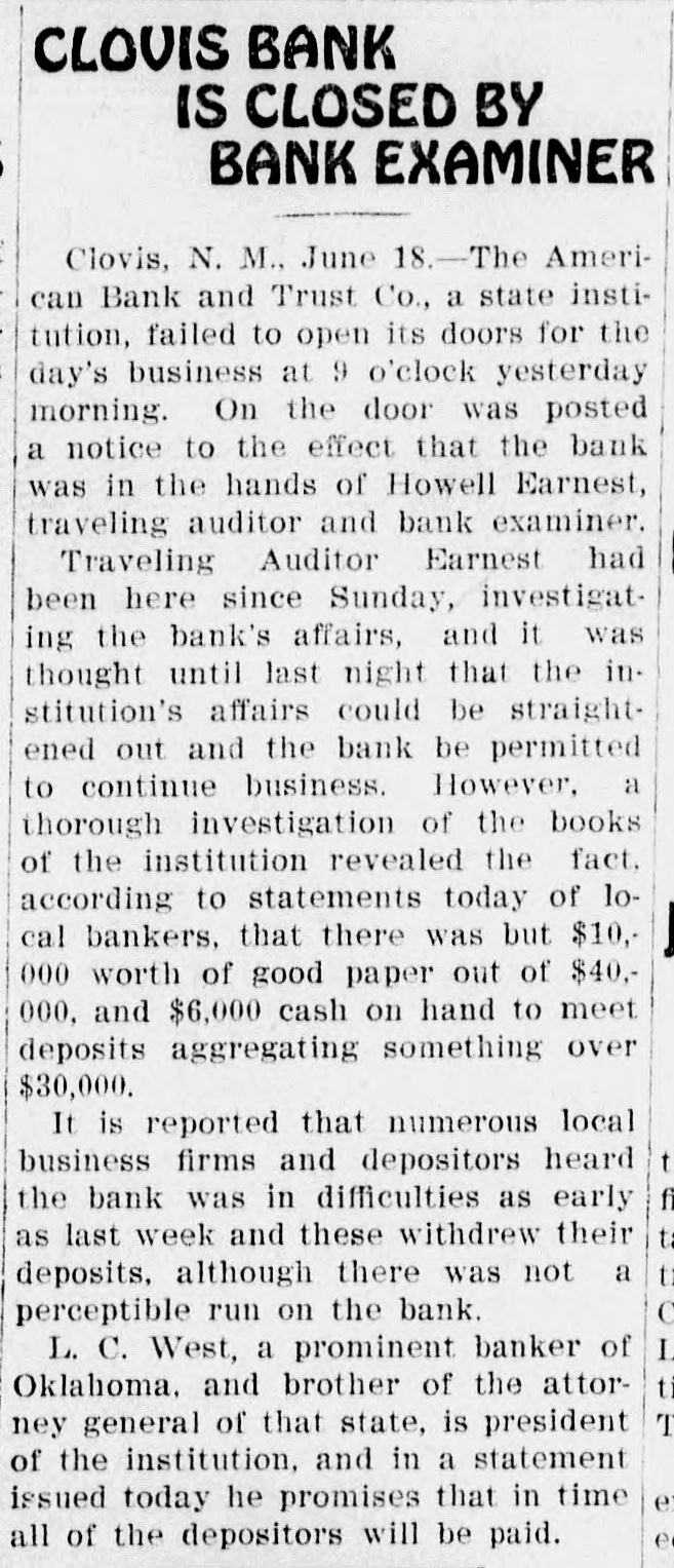 CLOUIS BANK IS CLOSED BY BANK EXAMINER Clovis, N. M., June 18.-The American Bank and Trust Co., a state institution, failed to open its doors for the day's business at 9 o'clock yesterday morning. On the door was posted a notice to the effect that the bank was in the hands of Howell Earnest, traveling auditor and bank examiner. Traveling Auditor Earnest had been here since Sunday, investigating the bank's affairs, and it was thought until last night that the institution's affairs could be straightened out and the bank be permitted to continue business. However, a thorough investigation of the books of the institution revealed the fact. according to statements today of local bankers, that there was but $10,000 worth of good paper out of $40,000, and $6,000 cash on hand to meet deposits aggregating something over $30,000. It is reported that numerous local business firms and depositors heard the bank was in difficulties as early as last week and these withdrew their deposits, although there was not a perceptible run on the bank. L. C. West, a prominent banker of t Oklahoma, and brother of the attorT ney general of that state, is president of the institution, and in a statement issued today he promises that in time e e all of the depositors will be paid.