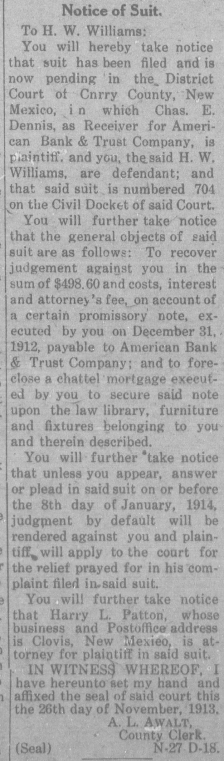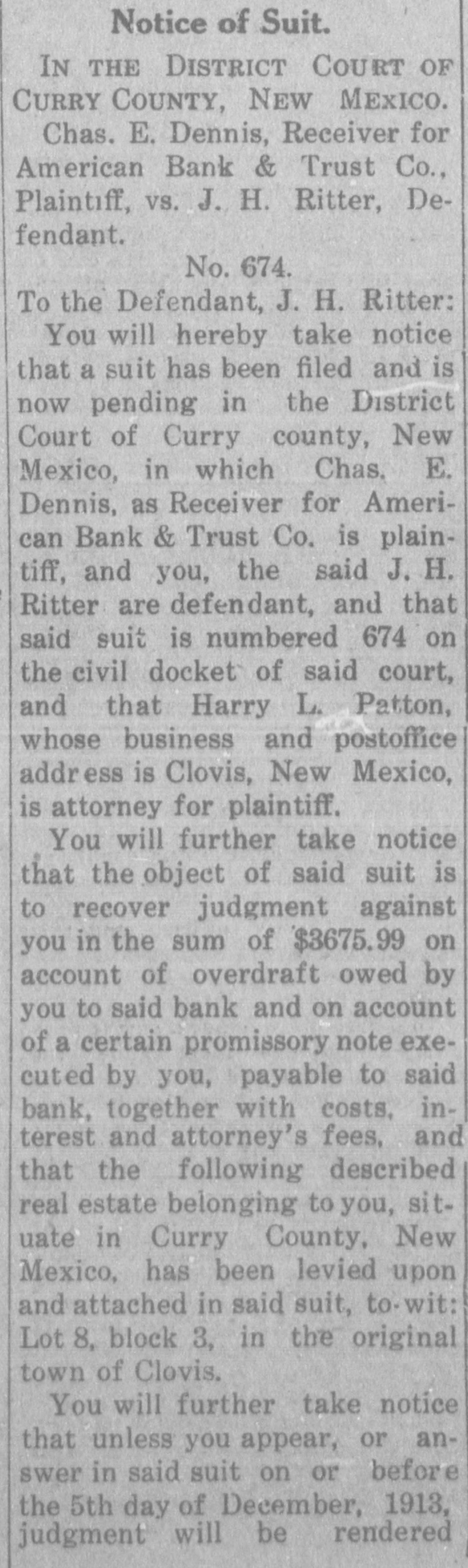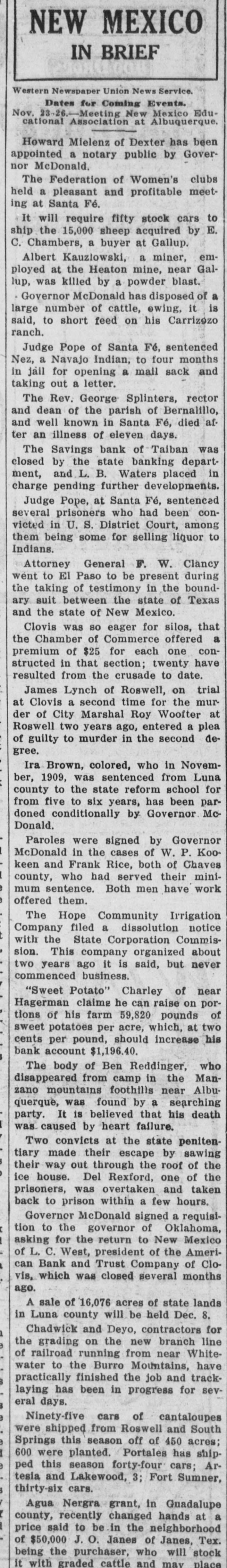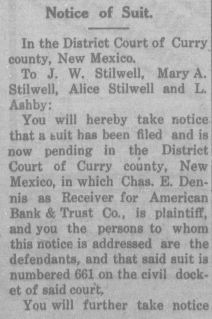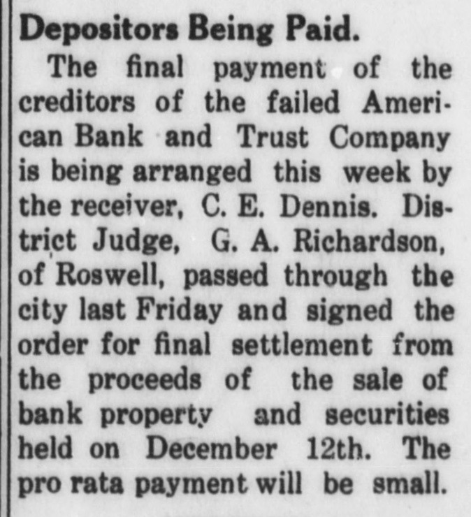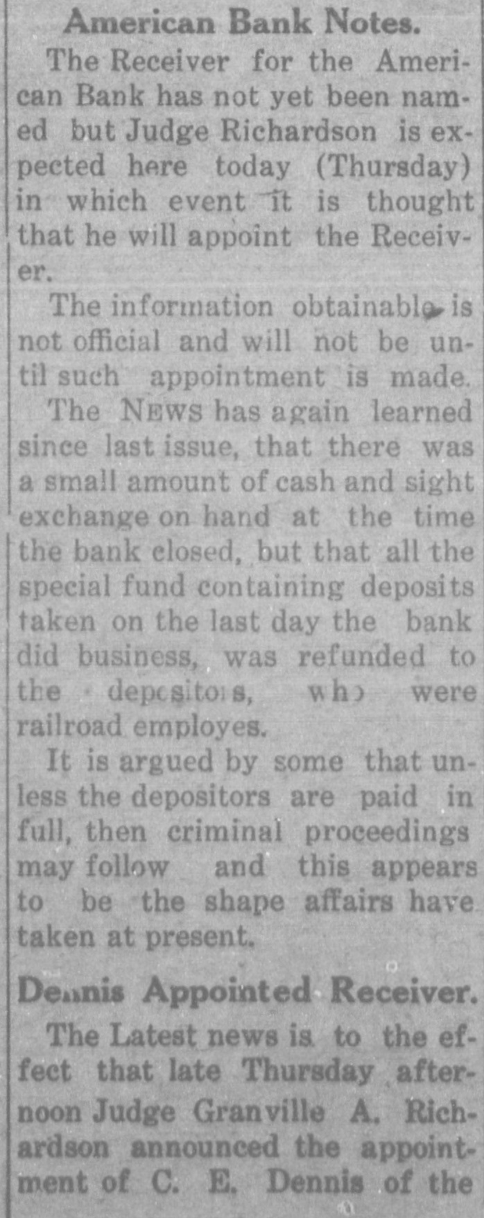 CLOUIS BANK IS CLOSED BY BANK EXAMINER Clovis, N. M., June 18.-The American Bank and Trust Co., a state institution, failed to open its doors for the day's business at 9 o'clock yesterday morning. On the door was posted a notice to the effect that the bank was in the hands of Howell Earnest, traveling auditor and bank examiner. Traveling Auditor Earnest had been here since Sunday, investigating the bank's affairs, and it was thought until last night that the institution's affairs could be straightened out and the bank be permitted to continue business. However, a thorough investigation of the books of the institution revealed the fact. according to statements today of local bankers, that there was but $10,000 worth of good paper out of $40,000, and $6,000 cash on hand to meet deposits aggregating something over $30,000. It is reported that numerous local business firms and depositors heard the bank was in difficulties as early as last week and these withdrew their deposits, although there was not a perceptible run on the bank. L. C. West, a prominent banker of t Oklahoma, and brother of the attorT ney general of that state, is president of the institution, and in a statement issued today he promises that in time e e all of the depositors will be paid.