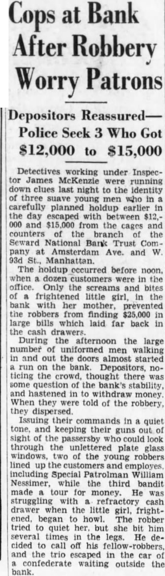 Bank Cops at After Robbery Worry Patrons Depositors Reassured— Police Seek Got $12,000 to $15,000 Detectives working under InspecJames McKenzie were running down clues last night to the identity of three suave young men who in carefully planned holdup earlier day escaped with between $12,from the cages and counters branch the Seward National Bank Trust Company Amsterdam Ave. and 93d The holdup occurred before noon, dozen customers were in the office. Only the screams and bites frightened little girl, in the bank with her mother, prevented the robbers from finding $25,000 large bills which laid far back cash During the afternoon the large number of uniformed men walking in and out the doors almost started run on the bank. Depositors, ticing the crowd, thought there was some question the bank's stability, and in withdraw money When they were told of the robbery, they dispersed. Issuing their commands in quiet tone. and keeping their guns out of sight the passersby look through the plate glass windows, of the young robbers lined the and employes. including Special William Nessimer, while the third bandit made tour for money. He was struggling with cash drawer when the little girl, frightened. began howl. The robber tried to quiet her. but she bit him several times the legs. He cided call off his and the trio escaped in the car confederate waiting outside the bank.
