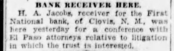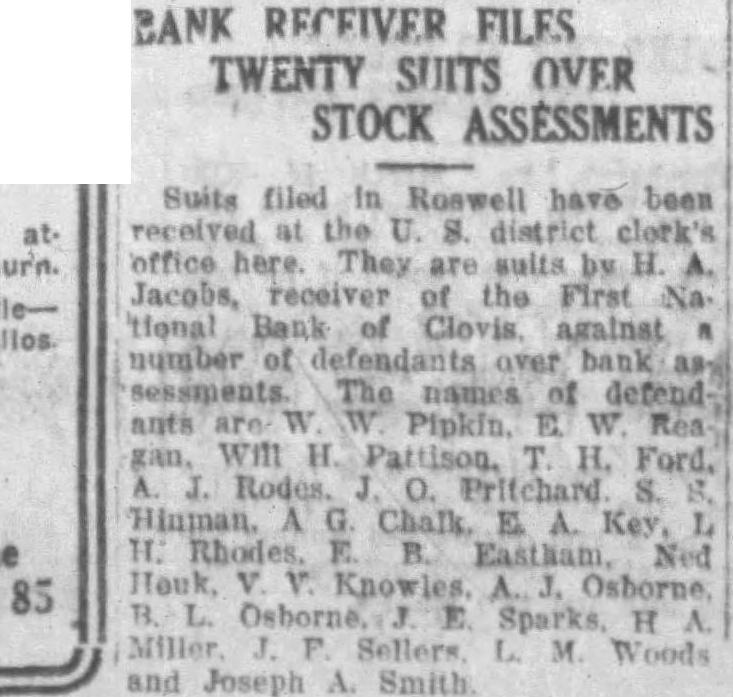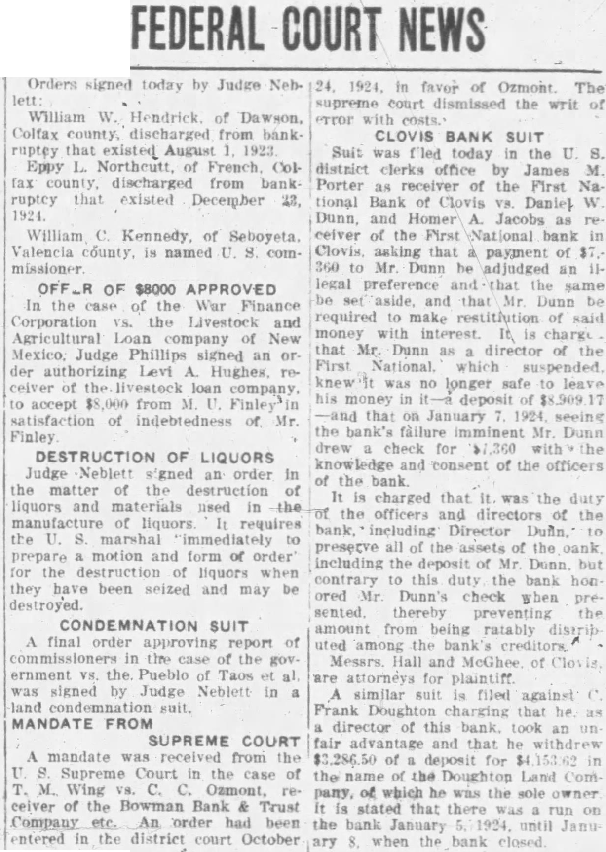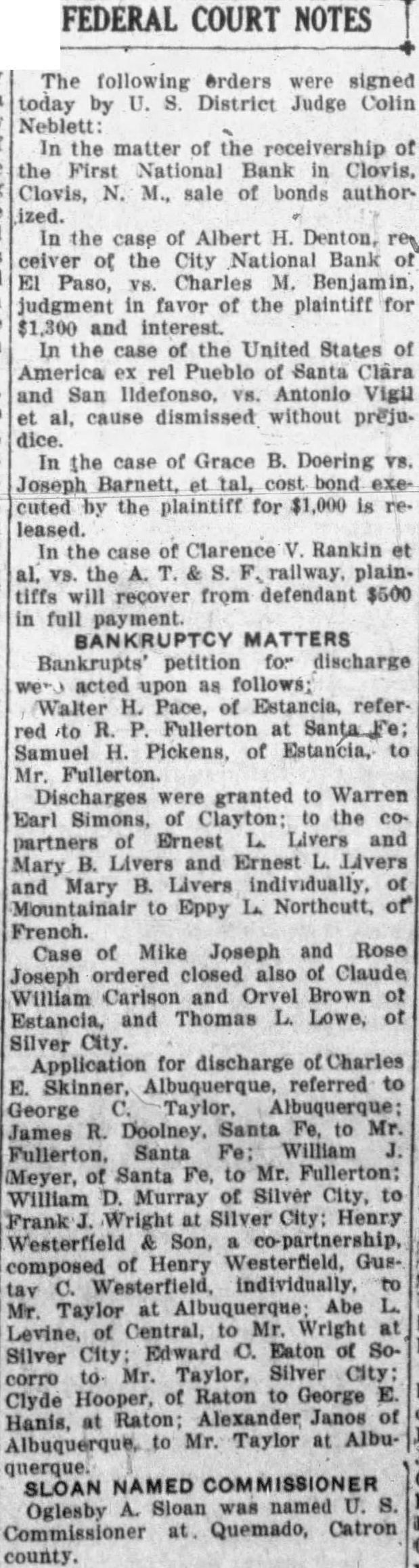 The following orders were signed today by U. District Judge Colin Neblett: In the matter of the receivership of the First National Bank in Clovis, Clovis, N. M., sale of bonds authorized. In the case of Albert H. Denton, ceiver of the City National Bank Paso, Charles M. judgment in favor of the plaintiff for and interest. In the case of the United States of America rel Pueblo of Santa Clara and San Ildefonso. Antonio Vigil cause dismissed without prejudice. In the case of Grace B. Doering VS. Joseph Barnett, et tal, cost bond executed by the plaintiff for $1,000 is released. In the case of Clarence Rankin et the plaintiffs will reçover from defendant $500 in full payment. BANKRUPTCY MATTERS Bankrupts' petition for discharge acted upon as Walter H. Pace, of referred to Fullerton at Samuel Pickens, of Estancia, to Mr. Fullerton. Discharges granted Warren Earl Simons, of Clayton; to the coof Ernest Livers and partners Mary B. Livers and Ernest Livers and Mary B. Livers individually, of Mountainair to Eppy L. Northcutt, French. Case of Mike Joseph and Rose Joseph ordered closed also of Claude William Carlson and Orvel Brown of Estancia, and Thomas L. Lowe, of Silver City. Application for discharge Charles Skinner, Albuquerque, referred to George Taylor, James R. Doolney. Santa Fe. to Mr. Fullerton, Santa Fe: William Meyer, of Santa Fe, to Mr. Fullerton: William Murray of Silver City, to Frank Wright Silver City: Henry Westerfield Son, co-partnership, composed of Henry Westerfield, GusTaylor at Albuquerque: Abe of to Wright at Silver City Edward C. Eaton of Socorro Mr. Taylor, Silver City: Clyde Hooper, of Raton to George Alexander Janos of Hanis, at to Mr. Taylor Albuquerque. SLOAN NAMED COMMISSIONER Sloan was named U. Oglesby Commissioner at. Quemado, Catron county.
