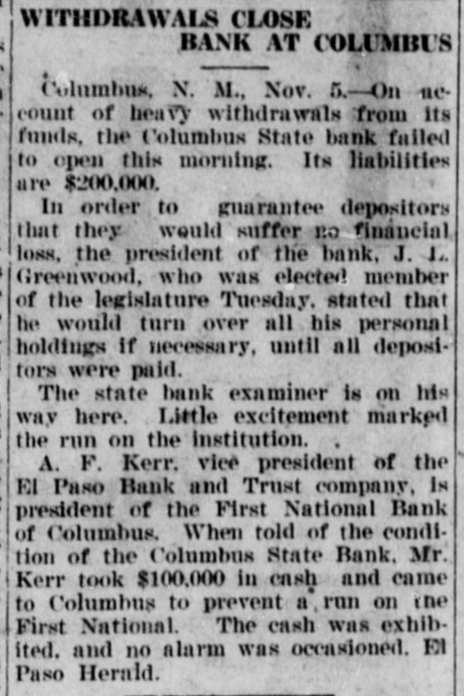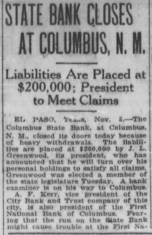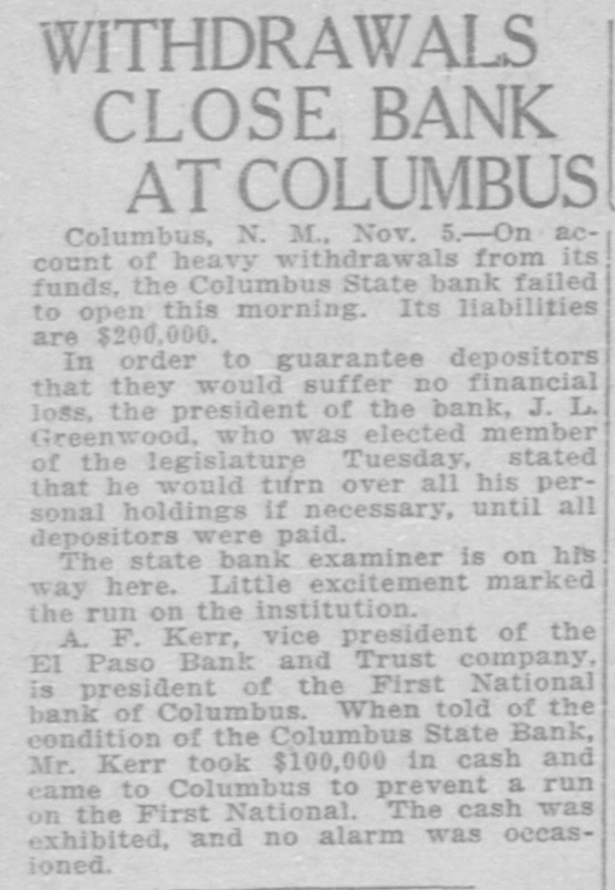 WITHDRAWALS CLOSE BANK AT COLUMBUS Columbus, N. M., Nov. 5.-On account of heavy withdrawals from its funds, the Columbus State bank failed to open this morning. Its liabilities are $200,000. In order to guarantee depositors that they would suffer no financial loss, the president of the bank, J. L. Greenwood, who was elected member of the legislature Tuesday, stated that he would turn over all his personal holdings if necessary, until all depositors were paid. The state bank examiner is on his way here. Little excitement marked the run on the institution. A. F. Kerr, vice president of the El Paso Bank and Trust company, is president of the First National bank of Columbus. When told of the condition of the Columbus State Bank, Mr. Kerr took $100,000 in cash and came to Columbus to prevent a run on the First National. The cash was exhibited, and no alarm was occasioned.