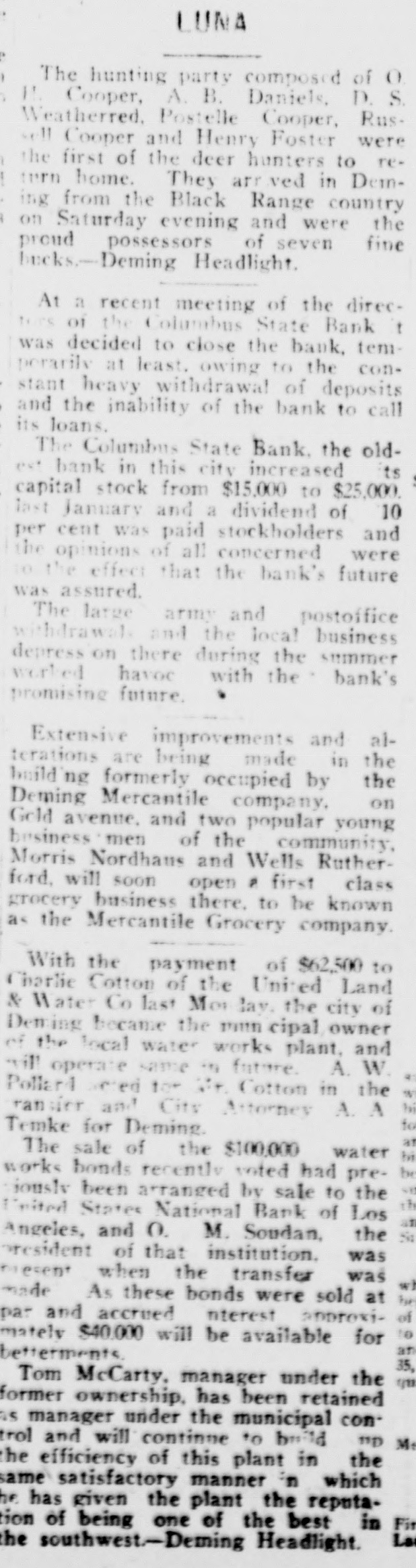 LUNA The hunting party composed of 0 H. Cooper, A. B. Daniels, D. S. Weatherred. Postelle Cooper, Ruswill Cooper and Henry Foster were the first of the deer hunters to return home. They arr ved in Deming from the Black Range country on Saturday evening and were the proud possessors of seven fine bucks.-Deming Headlight. At a recent meeting of the directhis of the Columbus State Bank 1 was decided to close the bank. temperarily at least. owing to the constant heavy withdrawal of deposits and the inability of the bank to call its loans. The Columbus State Bank. the oldest bank in this city increased ts capital stock from $15,000 to $25,000. last January and a dividend of 10 per cent was paid stockholders and the opinions of all concerned were the effect that the bank's future was assured. The large army and postoffice withdrawals and the local business depress on there during the summer worked havoc with the bank's promising future. Extensive improvements and alterations are being made in the building formerly occupied by the Deming Mercantile company, on Gold avenue, and two popular young business men of the community, Morris Nordhaus and Wells Rutherford, will soon open P first class grocery business there, to be known as the Mercantile Grocery company. With the payment of $62,500 to Charlie Cotton of the United Land & Water Co last Moi lay. the city of Deming became the mum cipal owner of the local water works plant, and will operate same 11) future. A. W. * Pollard ced for it Cotton in the ransier and City Attorney A. A Temke for Deming. The sale of the $100,000 water works bonds recently voted had preiouslv been arranged by sale to the United States National Bank of Los Angeles, and O. M. Soudan, the X president of that institution. was Diesent when the transfer was made As these bonds were sold at par and accrued nterest approximately $40.000 will be available for betterments. 35, Tom McCarty, manager under the former ownership, has been retained as manager under the municipal control and will continue to build "D he efficiency of this plant in the ame satisfactory manner in which IF, has given the plant the reputation of being one of the best in Fir La he southwest-Deming Headlight.