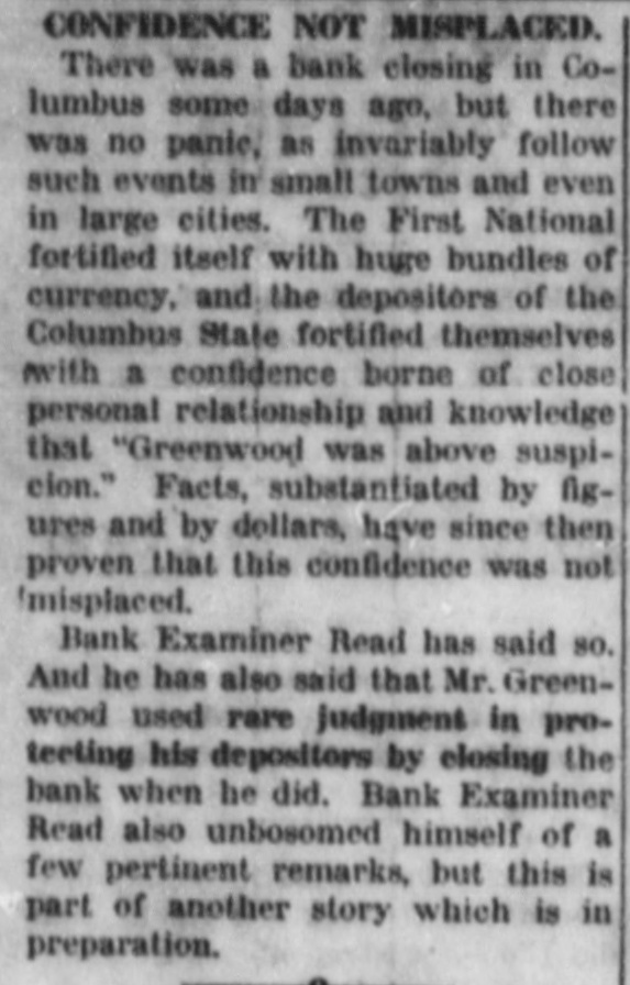 CONFIDENCE NOT MISPLACED. There was a bank closing in Columbus some days ago, but there was no panic, as invariably follow such events in small towns and even in large cities. The First National for-itled itself with huge bundles of currency, and the depositors of the Columbus State fortifled themselves with a confidence borne of close personal relationship and knowledge that "Greenwood was above suspicion." Facts, substantiated by figures and by dollars, have since then proven that this confidence was not 'misplaced. Bank Examiner Read has said so. And he has also said that Mr. Greenwood used rare judgment in proteeting his depositors by closing the bank when he did. Bank Examiner Read also unbosomed himself of a few pertinent remarks, but this is part of another story which is in preparation.