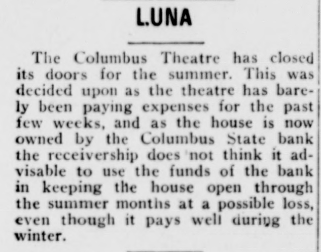# L.UNA The Columbus Theatre has closed its doors for the summer. This was decided upon as the theatre has barely been paying expenses for the past few weeks, and as the house is now owned by the Columbus State bank the receivership does not think it advisable to use the funds of the bank in keeping the house open through the summer months at a possible loss, even though it pays well during the winter.