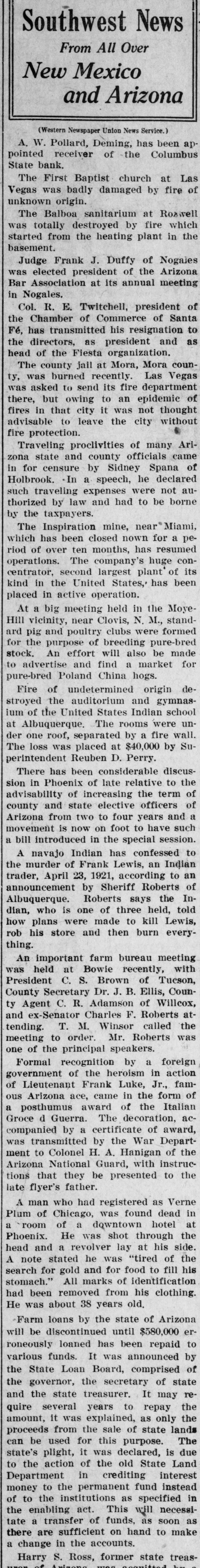 Southwest News From All Over New Mexico and Arizona (Western Newspaper Union News Service.) A. W. Pollard, Deming, has been appointed receiver of the Columbus State bank. The First Baptist church at Las Vegas was badly damaged by fire of unknown sanitarium at was fire The totally Balboa origin. destroyed by Roswell which started from the heating plant in the basement. Judge Frank J. Duffy of Nogales was elected president of the Arizona Bar Association at its annual meeting in Nogales. Col. R. E. Twitchell, president of the Chamber of Commerce of Santa his to as as Fé, the has directors, transmitted president resignation and head of the Fiesta organization. county jail at Mora, Mora county, was recently. Las The asked burned Vegas was to send its fire department owing to an of city it was not there, fires in but that epidemic thought advisable to leave the city without fire protection. Traveling proclivities of many Arizona state and county officials came in for censure by Sidney Spana of Holbrook. In a speech, he declared expenses were not auby law and had such thorized traveling to be borne by the taxpayers. mine, which The has Inspiration near"Miami, been closed nown for a period over ten months, has The operations. centrator, of second company's huge resumed conlargest plant of its kind in the United States, has been placed in active operation. At a big meeting held in the Moyenear Clovis, N. poultry clubs were ard Hill pig vicinity, and M., formed standpurpose of An effort will also to stock. for advertise the breeding pure-bred be made and find a market for pure-bred Poland China hogs. Fire of undetermined origin destroyed the auditorium and United States Indian at The rooms ium Albuquerque. of the were gymnas- school under one roof, separated by a fire wall. was placed at by SuReuben D. perintendent The loss $40,000 Perry. There has been considerable discussion in Phoenix of late relative to the advisability of increasing the term of county and state elective officers of Arizona from two to four years and movement is now on foot to have such a bill introduced in the special session. A navajo Indian has confessed to the murder of Frank Lewis, an Indian trader, April 23, 1921, according to an announcement by Sheriff Roberts of Roberts the is one of three Albuquerque. dian, how plans who says held, told Inwere made to kill Lewis, rob his store and then burn everything. An important farm bureau was at Bowie President held recently, meeting with C. S. Brown of Tucson, Dr. J. B. R. Adamson of and ty County Agent Secretary C. Ellis, Willcox, Counex-Senator Charles F. Roberts atM. Winsor to order. Mr. tending. meeting of T. Roberts called was the one the principal speakers. recognition by a government Formal foreign of the heroism in action of Lieutenant Frank ous ace, came in the posthumus Arizona Luke, Jr., form fam- of a award of the Italian Groce d Guerra. The decoration, accompanied by a certificate of award, was transmitted by the War Department to Colonel H. A. Hanigan of the Arizona National Guard, with instructions that they be presented to the late flyer's father. A man who had registered as Verne Plum of Chicago, was found in a room a of downtown hotel dead at Phoenix. He was shot the a revolver lay at stated he was head A search note and "tired through his of side. the for gold and for food to fill his All marks of identification had stomach." been removed from his clothing. He was about 38 years old. Farm loans by the state of Arizona will be discontinued until $580,000 erroneously loaned has been repaid to various funds. It was announced by the State Loan Board, governor, the secretary of and the the comprised state of state treasurer. It may require several years to repay the amount, it was explained, as only the proceeds from the sale of state lands can be used for this purpose. The state's plight, it was declared, is due to the action of the old in Department money to the crediting State interest Land permanent fund instead of to the institutions as specified in the enabling act. This will necessitate a transfer of funds, as soon as there are sufficient on hand to make a change in the accounts. Harry S. Ross, former state treasArizona was accuitted