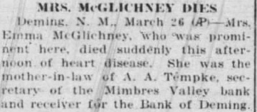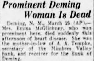 Prominent Deming Woman 18 Dead March 25 died suddenly heart disease. was the Tempke, secretary the Mimbres Valley bank, receiver for the Bank Deming