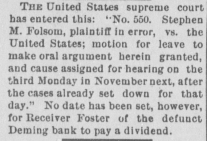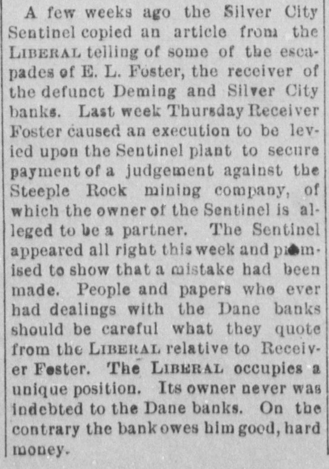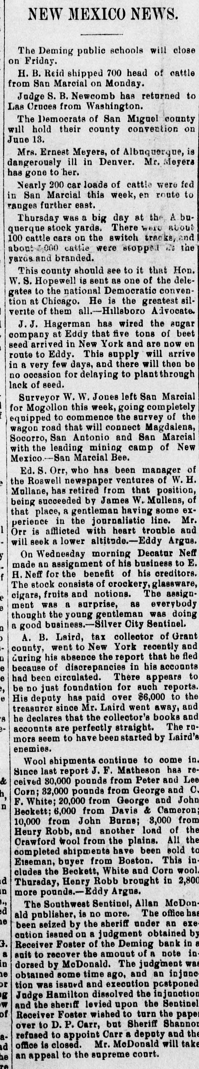 NEW MEXICO NEWS. The Deming public schools will close on Friday. H. B. Reid shipped 700 head of cattle from San Marcial on Monday. Judge S. B. Newcomb has returned to Las Cruces from Washington. The Democrats of San Miguel county will hold their county convention on June 13. Mrs. Ernest Meyers, of Albuquerque, is dangerously ill in Denver. Mr. Meyers has gone to her. Nearly 200 car loads of cattle were fed in San Marcial this week, en route to ranges further east. Thursday was a big day at the A buquerque stock yards. There WETO about 100 cattle cars on the switch tracks, and about 000 cattle were stopped the the yards and branded. This county should see to it that Hon. W. .S. Hopewell is sent as one of the delegates to the national Democratic convention at Chicago. He is the greatest silverite of them all.-Hillsboro Advocate J.J. Hagerman has wired the augar company at Eddy that five tons of beet seed arrived in New York and are now en route to Eddy. This supply will arrive in a very few days, and there will then be no occasion for delaying to plant through lack of seed. Surveyor W. W. Jones left San Marcial for Mogollon this week, going completely equipped to commence the survey of the wagon road that will connect Magdalena, Socorro, San Antonio and San Marcial with the leading mining camp of New Mexico.-San Marcial Bee. Ed. S. Orr, who has been manager of the Roswell newspaper ventures of W. Mollane, has retired from that position, being succeeded by James W. Mullens, of that place, a gentleman having some experience in the journalistic line. Mr. 1 Orr is afflicted with heart trouble and will seek 8 lower altitude.-Eddy Argus. On Wednesday morning Decatur Neff y made an assignment of his business to E. H. Neff for the benefit of his creditors. f The stock consists of crockery,glassware, cigars, fruits and notions. The assigne ment was a surprise, as everybody e thought the young gentleman was doing a good business.-Silver City Sentinel. n A. B. Laird, tax collector of Grant D county, went to New York recently and n during his absence the report that he fled e because of discrepancies in his accounts e had been circulated. There appears to be no just foundation for such reports. , e His deputy has paid over $6,000 to the treasurer since Mr. Laird went away, and he declares that the collector's books and 8 accounts are perfectly straight. The rumors seem to have been started by Laird's enemies. Wool shipments continue to come in Since last report J. F. Matheson has re& ceived 30,000 pounds from Peter and Lee Corn; 32,000 pounds from George and C. h, F. White; 20,000 from George and John n Beckett; 6,000 from Davis & Cameron 10,000 from John Burne; 3,000 from Henry Robb, and another load of the Crawford wool from the plains. All the completed shipments have been sold to Eiseman, buyer from Boston. This in cludes the Beckett, White and Corn wool. d Thursday, Henry Robb brought in 2,800 in more pounds.-Eddy Argus. ., The Southwest Sentinel, Allan McDond ald publisher, is no more. The office has he been seized by the sheriff under an exe oution issued on a judgment obtained by G. Receiver Foster of the Deming bank in a a suit to recover the amount of a note in in dorsed by McDonald. The judgment was he obtained some time ago, and an injune or tion was issued and execution postponed g Judge Hamilton dissolved the injunction w and the sheriff levied upon the Sentinel of Receiver Foster wished to turn the paper over to D. P. Carr, but Sheriff Shannor refused to appoint Carr a deputy and the aoffice is closed. Mr. McDonald will take d he an appeal to the supreme court. re