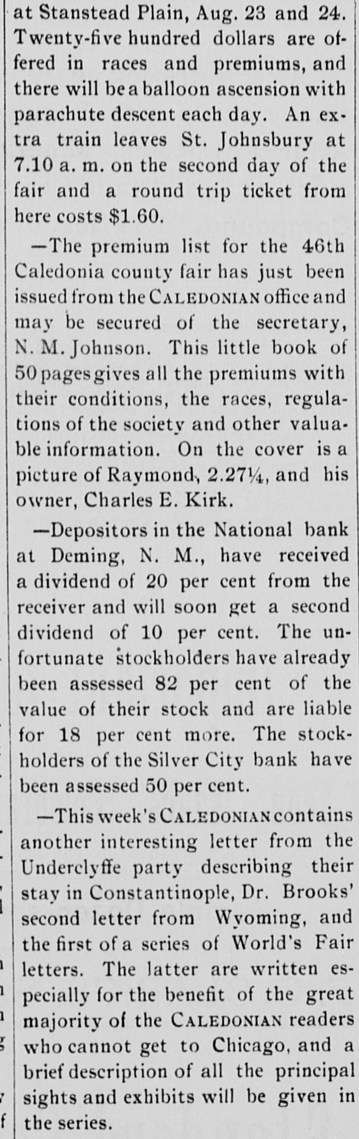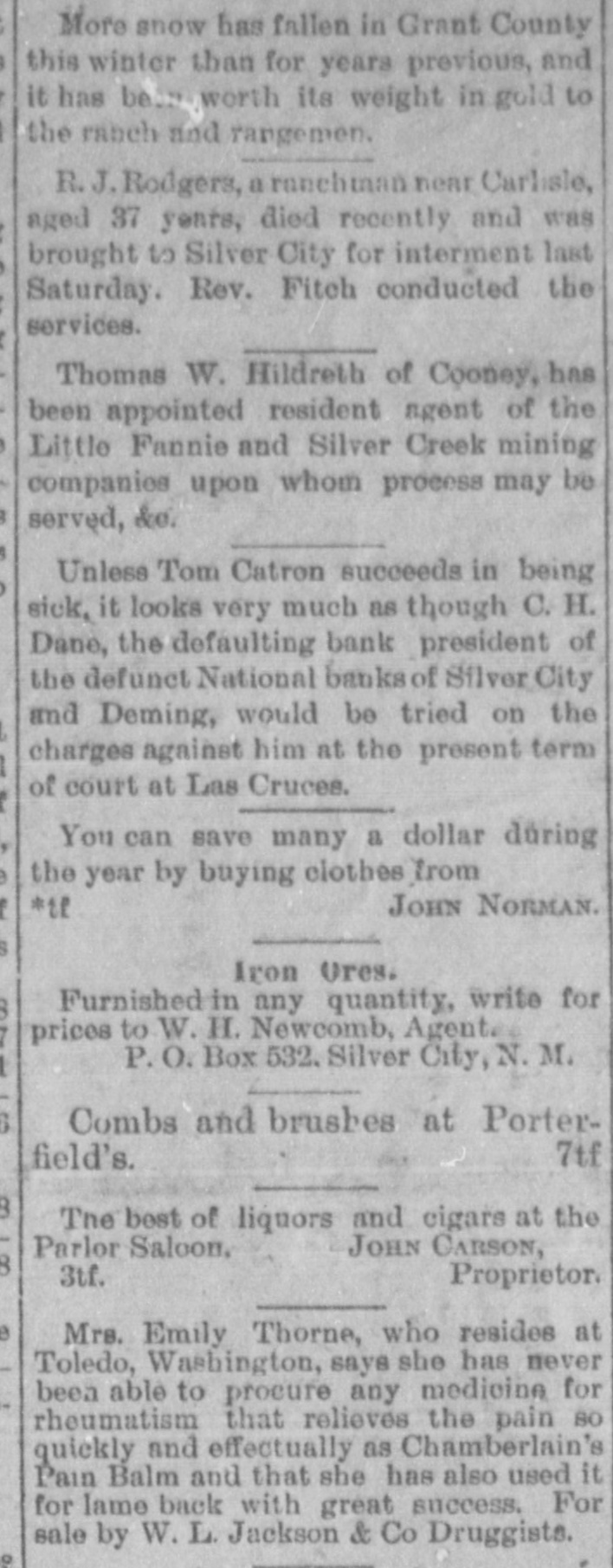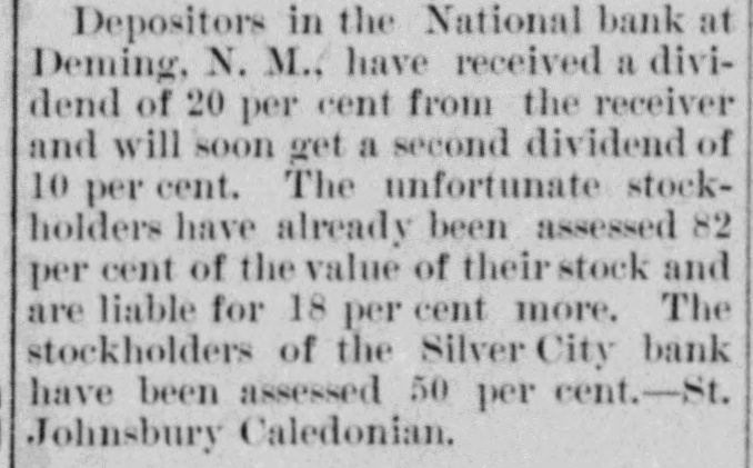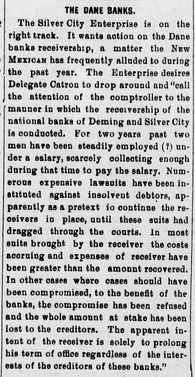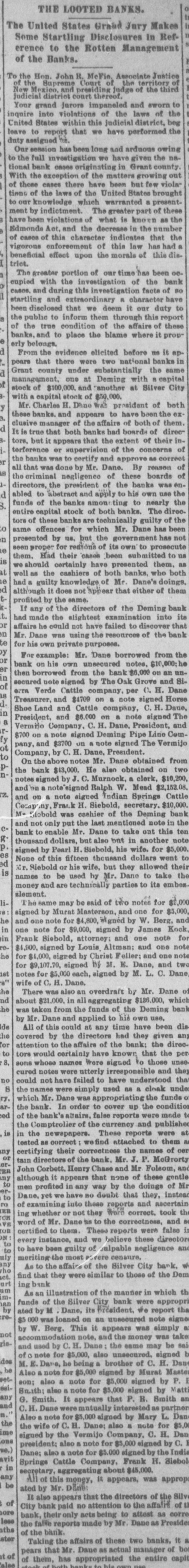 THE LOOTED BANKS. The United States Grand Jury Makes Some Startling Disclosures In Reference to the Rotten Management of the Banks. To of the Hon. John R. McFie, Associate Justice New the Supreme Court of the territory of Mexico, and presiding judge of the third judicial district court thereof. Your grand jurors impaneled and sworn to inquire into violations of the laws of the United States within this judicial district, beg leave to report that we have performed the duty assigned the. Our session has been long and arduous owing to the full investigation we have given the na. tional bank cases originating in Grant county With the exception of the matters growing out of those cases there have been but few viola tiens of the laws of the United States brought to our knowledge which warranted a present ment by indictment. The greater part of thee have been violations of what is known as the Edmonds Act, and the decrease in the number of cases of this character indicates that the vigorous enforcement of this law has had beneficial triot. effect upon the morals of this dis The greater portion of our time has been 00 enpied with the investigation of the bank cases. and during this investigation facts of B startling and extraordinary R character have been disclosed that we deem it our duty t the public to inform them through this repor of the true condition of the affairs of thes banks, and to place the blame where it prop erly belongs. From the evidence elicited before no it ap pears that there were two national banks d Grant county under substantially the sam of management, one at Deming with capits stock of $100,000. and "another at Silver Cit with R capital stock of $50,000. Mr. Charles H. Dane was president of bot these banks. and appears to have been the or clusive manager of the affairs of both of them d It is true that both banks had boards of direc tore, but it appears that the extent of their it terference or supervision of the concerns r the banks was to certify and approve as correo all that was done by Mr. Dane. By reason 18 the criminal negligence of these boards directors, the president of the banks was er d abled to abstract and apply to his own use th S. funds of the banks amou ting to nearly th entire capital stock of both banks. The dire tors of these banks are technically guilty of th to same offences for which Mr. Dane has bee n presented by no, but the government has no 18 seen proper for reasons of its own to prosecut them. Had their cases been submitted to IS we should certainly have presented them. at well as the cashiers of both banks. who bot had a guilty knowledge of Mr. Dane's doing d although it does not sppear that either of the profited by the same. If any of the directors of the Deming ban had made the elightest examination into i or affairs he could not have failed to discover the in Mr. Dane was using the resources of the ban to for his own private purposes. y For example: Mr. Dane borrowed from ti or or bank on his own unsecured notes, $10,000;) then borrowed from the bank $6,000 on an un in secured note signed by The Oak Grove and 8 of erra Verde Cattle company, per O. H. Dar is Treasurer, and $4709 on a note signed Hor Shoe Land and Cattle company, C. H. Dan in President, and $6,000 on a note signed TI a Vermino Company, C. H. Dane. President, an $700 on a note signed Deming Pipe Line Con pany, and $3700 on a note signed The Vermi ot Company, by C. H. Dane, President. to On the above notes Mr. Dane obtained fro pthe bank $43,000. He also obtained on tv D' notes signed by J. C. Murnock, a clerk, $10.20 and on a note signed Ralph W. Mead $2,152.0 z. and on a note signed Indian Springs Catt Comp Frank H. Siebold, secretary. $10.00 M- Siebold was cashier of the Deming bar and not only put the last mentioned note in tl cbank to enable Mr. Dane to take out this to be thousand dollars, but also but in another no p. signed by Pearl H. Biebold, his wife. for $5.00 88 None of this fifteen thousand dollars went ed Mr. Siebold or his wife, but they allowed the is names to be used by Mr. Dane to take t slement. money and are technically parties to its embe liThe same may be said of two notes for : signed by Murat Masterson, and one for $5.00 he and one note for $4,800, *igned by W. Berg, a in one note for $9,000, signed by James Koc in Frank Siebold, attorney; and one note f & $4,900, signed by Louis Altman: and one no he for $4,000, signed by Christ Feller: and one no for $9,107.70, signed by M. E. Dane, and t ist notes for $5,000 each, signed by M. L. C. Dar 8" wife of C, H. Dane. he There was also an overdraft by Mr. Dane nd about $21,000, in all aggregating $186,000, whi he was taken from the funds of the Deming ba by Mr. Dane and applied to his own use, de All of this could at any time have been d he covered by the directors had they given a for attention to the affairs of the bank: the dire to tors would certainly have known that the P 8, sons whose names were signed to those une cured notes were utterly irresponsible and th no could not have failed to have understood the S the names were simply used as a cloak und ry. which Mr. Dane was appropriating the funds arthe bank. In order to cover up the conditi ed of the bank's abairs. false reports were made the Comptrolier of the currency and publish is in the newspapers. These reports were tested as correct wefind attached to them my certifying their correctness the names of o or tain directors of the bank. Mr. J. P. McGror orER John Corbett, Henry Chase and Mr Folsom, a my although it appears that none of these gent to men profited in any way by the doings of B to Dane, yet we have no doubt that they, inste of examining into these reports and ascertai ER ing whether or not they were correct. took t VE word of Mr. Dane as to the correctness, and OR certified to them. These reports were false every instance, and we believe these directo to to to have been guilty of Julpable negligence a uly meriting the most overe cens