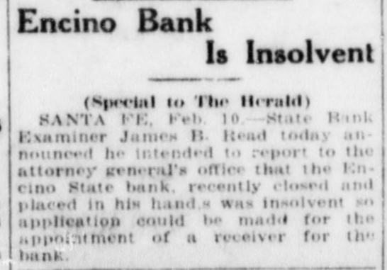 Encino Bank Is Insolvent (Special to The Herald) SANTA FE, Feb. 10 State Bank Examiner James B. Read today announeed he intended to report to the attorney general's office that the Encino State bank. recently closed and placed in his hands was insolvent so application could be madd for the appointment of a receiver for the bank.