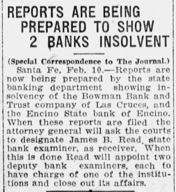 REPORTS ARE BEING PREPARED TO SHOW 2 BANKS INSOLVENT (Special Correspondence to The Journal.) Santa Fe, Feb. ).-Reports are now being prepared by the state banking department showing insolvency of the Bowman Bank and Trust company of Las Cruces, and the Encino State bank of Encino. When these reports are filed the attorney general will ask the courts to designate James B. Read. state bank examiner, as receiver. When this is done Read will appoint two deputy bank examiners, each to have charge of one of the institutions and close out its affairs.