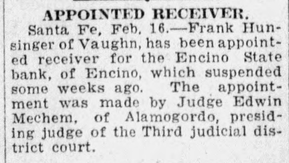 APPOINTED RECEIVER. Santa Fe, Feb. 16. - -Frank Hunsinger of Vaughn, has been appointed receiver for the Encino State bank, of Encino, which suspended some weeks ago. The appointment was made by Judge Edwin Mechem, of Alamogordo, presiding judge of the Third judicial district court.