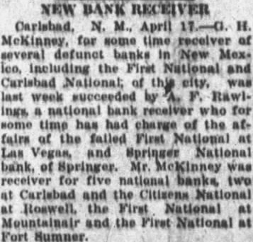 NEW BANK RECEIVER McKinney, for some time receiver of several defunct banks in New Mex. leo, including the First National and Carlsbad National; of this city, was last week succeeded by A. F. RawlIngs, a national bank receiver who for some time has had charge of the at. fairs of the falled First National at Las Vegas, and Springer National bank, of Springer. Mr. McKinney was receiver for five national banks two at Carlsbad and the Citizens National at Roswell, the First National at Mountainair and the First National at Fort Summer.