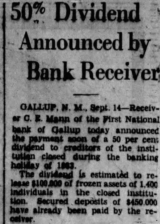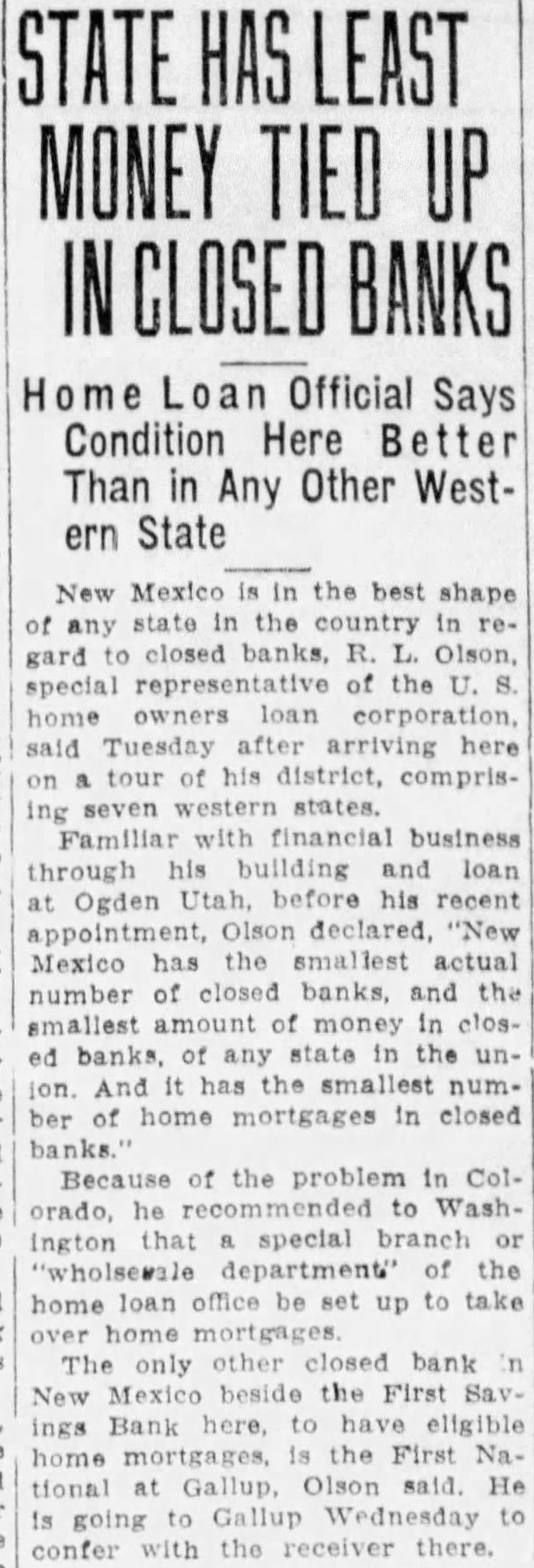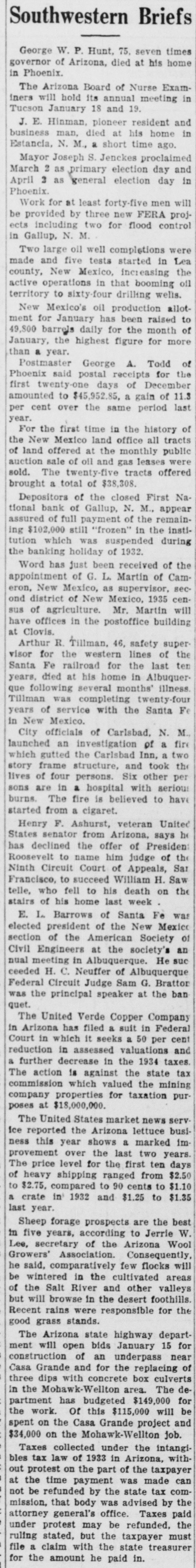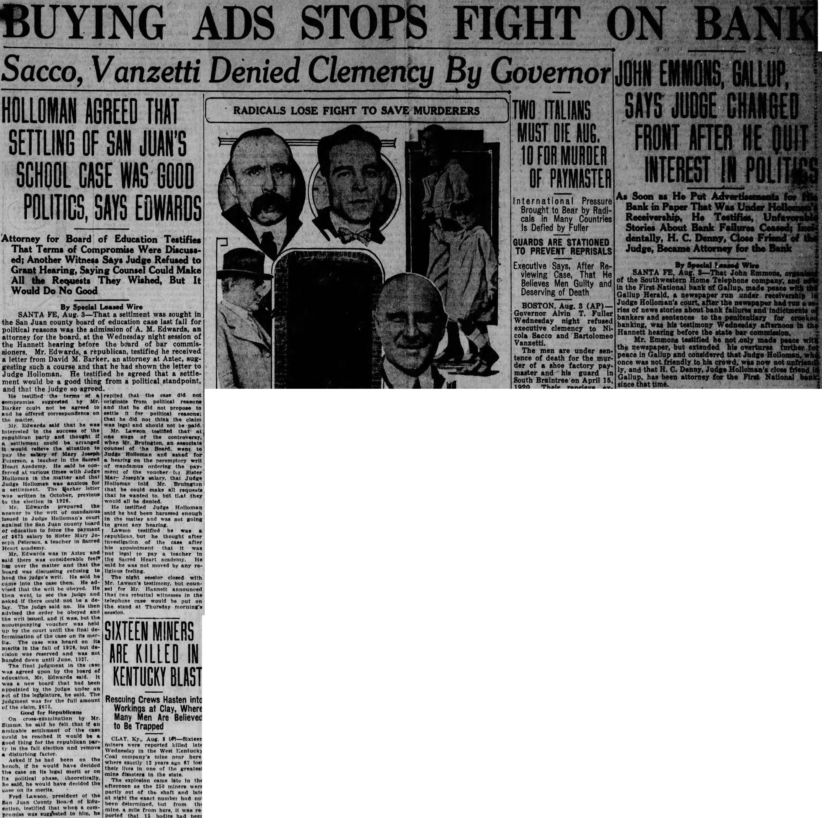 BUYING ADS STOPS FIGHT ON BANK Sacco, Vanzetti Denied Clemency By Governor JOHN EMMONS, GALLUP, SAYS JUDGE CHANGED HOLLOMAN AGREED THAT RADICALS LOSE FIGHT TO SAVE MURDERERS TWO ITALIANS MUST DIE AUG. FRONT AFTER HE QUIT SETTLING OF SAN JUAN'S MURDER INTEREST IN POLITICS SCHOOL CASE WAS GOOD OF POLITICS, SAYS EDWARDS Attorney for Board of Education Testifies That Terms of Compromise Were Discussed; Another Witness Says Judge Refused to Grant Hearing, Saying Counsel Could Make All the Requests They Wished, But It Would Do No Good By Special Leased Wire SANTA FE, Aug. 3-That settlment was sought in the San Juan board of education case last fall for county political reasons was the admission of A. M. Edwards, an attorney for the board, at the Wednesday night session of the Hannett hearing before the board of bar commissioners. Mr. Edwards, republican, testified he received a letter from David M. Barker, an attorney at Aztec, suggesting such a course and that he had shown the letter to Judge Holloman. He testified he agreed that a settlement would be a good thing from a political standpoint, and that the judge so agreed. He testified the of replied that the case did not terms compromise suggested by Mr. originate from political reasons Barker could agreed to and that he did not to propose and he offered correspondence on settle for political the matter. that he did not think the claim Mr. Edwards said that he was legal and should not be paid. Interested in the success of the Mr. Lawson testified that at republican party and thought If one stage the controversy, settlement could be arranged when Mr. Bruington, an associate would relieve the situation counsel of the Board. went to the salary Mary Joseph Judge Holloman and asked for pay Peterson. teacher In the Sacred hearing on the peremptory writ Heart Academy. He said he con- of mandamus ordering the payferred at various times with Judge ment of the voucher for Sister Holloman in the matter and that Mary Joseph's salary, that Judge Judge Holloman was anxious for Holloman told Mr. Bruington settlement. The Barker letter that he could make all requests was written in October, previous that he wanted to. but that they to the election in 1926 would all be denied. Mr. Edwards prepared the He testified Judge Holloman answer to the writ of mandamus said he had been harassed enough issued in Judge Holloman's court in the matter and was not going against the San Juan county board to grant hearing any of education to force the payment Lawson testified he was $675 to Sister Mary Joof salary republican, but he thought after seph Peterson. teacher in Sacred investigation of the case after Heart his appointment that It was Mr. Edwards was in Aztec and not legal to pay teacher said there was considerable feel the Sacred Heart academy. He 110% over the matter and that the he was not moved by any reboard discussing refusing to ligious feeling. heed the judge's He said he The night sessior closed with came Into the case then. He ad- Mr. Lawson's testimony. but counvised that the writ be obeyed. He sel for Mr. Hannett announced the judge and that two rebuttal witnesses in the then went to see there could not be de- telephone would be put on asked judge said no. He then the stand at Thursday morning's lay. The advised the order be obeyed and the writ Issued. and was, but the voucher was held by the court until the final de- SIXTEEN MINERS termination of the case on its merits. The was heard on its case merits in the fall of 1926, but decision was reserved and was not ARE KILLED IN handed down until June. 1927. The final judgment the case by the board of agreed upon education, Mr. Edwards said. It KENTUCKY BLAST new board that had been appointed the judge under an legislature, he said. The of the judgment was for the full amount Rescuing Crews Hasten into of the Workings at Clay, Where Good for Republicans On by Mr. Many Men Are Believed Simms. he said he felt that If an to Be Trapped amicable settlement of the case could reached it would CLAY, Ky., Aug. good thing for the republican parminers reported killed late ty in the fall election and remove Wednesday in the West Kentucky disturbing factor. Coal company's mine near here, Asked If he had been on the where exactly 12 years ago 67 lost bench, If he would have decided their lives in one of the greatest the case on its legal merit or on disasters in the state. its political phase, theoretically. The explosion came late In the he said, he would have decided the afternoon as the 250 miners were on merits. partly out of the shaft and late Fred Lawson. president of the night the exact number had not San Juan County Board of Edubeen determined. but from the eation, testified that when commine. mile from here, It was repromise was suggested to him. he ported that 15 bodies had been As Soon He Put as Bank in Paper That Was Under Receivership, He Testifies, Stories About Bank Failures Ceased; dentally, H. C. Denny, Close Friend of Judge, Became Attorney for the Bank By Special Leased Wire SANTA FE, Aug. John Emmons, of the Southwestern Home Telephone company, and in the First National bank of Gallup, made peace with Gallup Herald, a newspaper run under receivership Judge Holloman's court, after the had ries of news stories about bank failures and indictments bankers and sentences to the for banking, was his testimony ednesday afterhoon in Hannett hearing before the state bar commission. Mr. Emmons testified he not only made peace the newspaper, but extended his overtures further peace in Gallup and considered that Judge Holloman, once was not friendly to his crowd, now not ly, and that H. C. Denny, Judge Holloman's close friend Gallup, has been attorney for the First National since that time.
