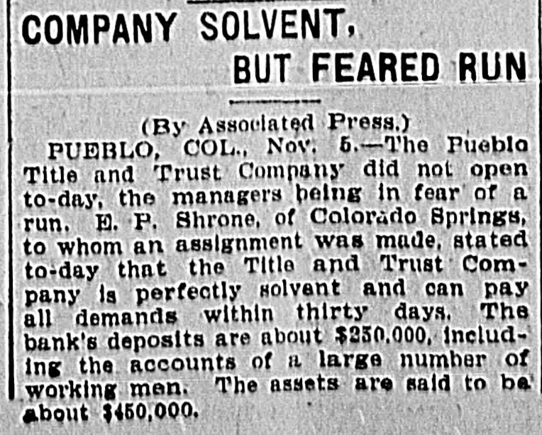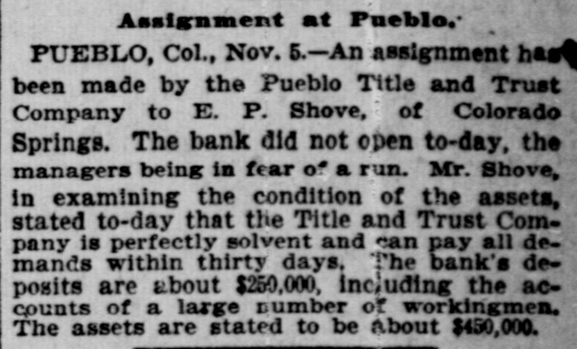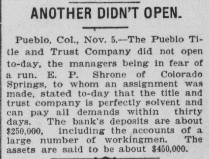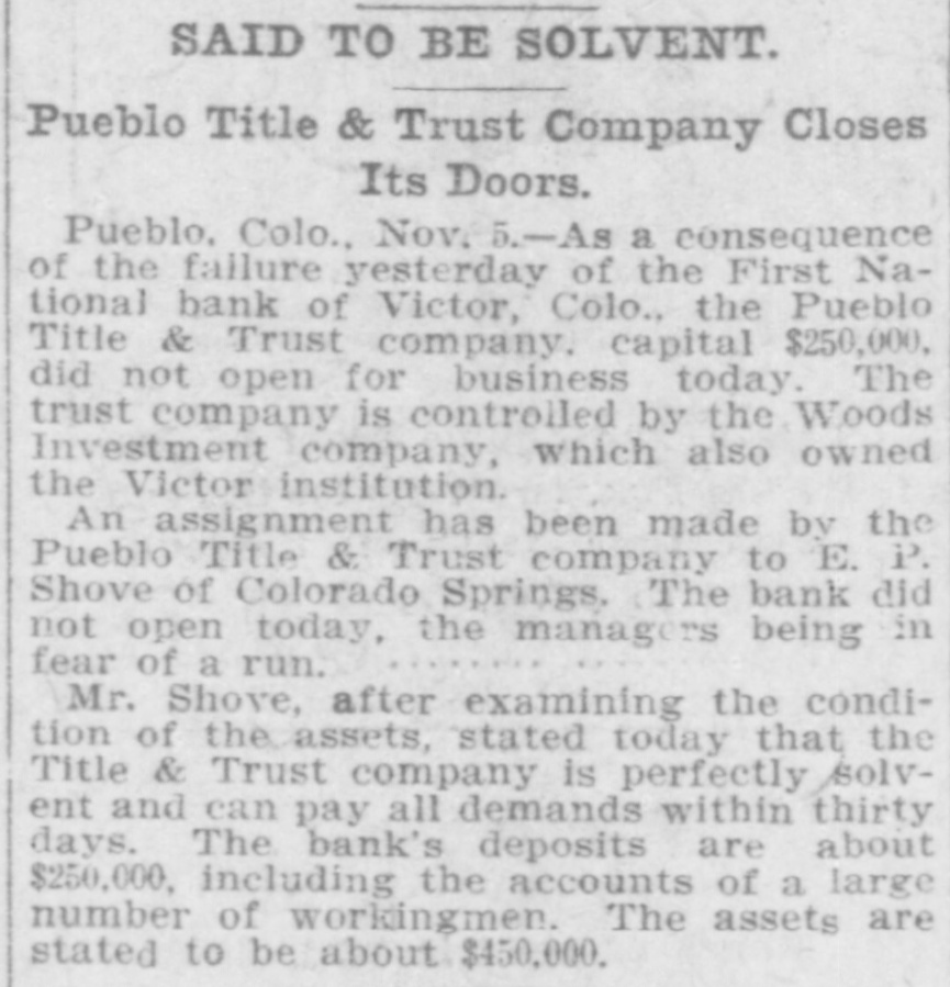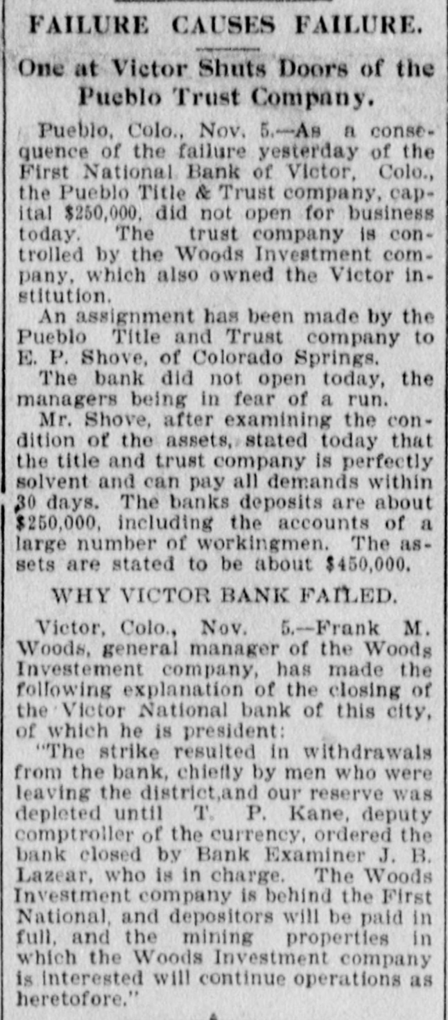 BANKS FAIL. A Trust Company Follows at Pueblo, Col. First National of Victor Closes Its Doors. Bi-Metallic at Cripple Creek Joins the Procession. DUE TO MINERS STRIKE Bank Officiais Were Interested in the Mines. Institution at Sheldon, Iowa, in Hands of Receiver. Colorado Springs, Col., Nov. 5.-A special to the Gazette from Victor states that the First National bank of Victor has closed its doors by order of Bank Examiner Lazear. Shrinkage of deposits as a result of the long continued miners' strike is given as the reason for suspending business. President F. M. Woods states that all depositors will be paid in full. The closing of the bank caused no apprehension in financial circles, either in Cripple Creek or Colorado Springs. TRUST COMPANY QUITS. Pueblo, Col., Nov. 5.-As a consequence of the failure of the First National bank of Victor, Col., the Pueblo Title and Trust company, capital $250,000, will not open for business today. The trust company is controlled by. the Woods Investment company which also owned the Victor institution. Small of the company anthat the deposits are nounce Secretary $250,000 and the assets are $450,000. An assignment has been made by the Pueblo Title and Trust company to E. P. Shove, of Colorado Springs. The bank did not open today, the managers being in fear of a run. Mr. Shove, after examining the condition of the assets stated today that the Title and Trust company is perfectly solvent and can pay all demands within 30 days. The bank's deposits are about a $250,000 including the accounts of aslarge number of working men. The sets are stated to be about $450,000. WOODS MAKES STATEMENT. Victor, Colo., Nov. 5.-Frank M. Woods, general manager of the Woods folInvestment company, has made the the lowing statement of the closing of of Victor National bank of this city, which "The he strike is president: resulted in withdrawals from the bank, chiefly by men who were leaving the district, and our reserve was depleted until T. P Kane, deputy the comptroller of the currency, ordered bank closed by Bank Examiner J. B. Lazear, who is in charge. The Woods First Investment company is behind the in National and depositors will be paid with full and the mining properties which the Woods Investment company is interested will continue operations as heretofore. DUE TO MINERS' STRIKE. Washington, Nov. 5.-The First Nabank of Victor, Col., has been tional closed by direction of the acting comptroller of the currency, the examiner James reporting the bank to be insolvent. B. Lazear, national bank examiner, was has been appointed receiver. The bank organized in September, 1900. The failure, the acting comptroller by is due to losses sustained states, of excessive accommodations extended reason to mining interests with which the officers of the bank were connected. The statement of the reand liabilities of the bank on September sources 9, 1903, the date of the last of condition made to the comp- of report troller shows loans and discounts $231,742: cash and cash items, $63,514; deposits, $304,346. FARMERS RESPONSIBLE. Ia., Nov. 5.-The Sheldon bank Sheldon, closed its doors and will go into the hands of a receiver. Officers of the bank assign the cause of the failure to the slow payment of notes by farmers the past two years. RECEIVER NAMED. Ia., Nov. 5.-Judge Gaynor, on application Sibley, of the stockholders, ap- the pointed W. R. Ady receiver of State bank at Sheldon. The assets are about $225,000; liabilities about $175,000.