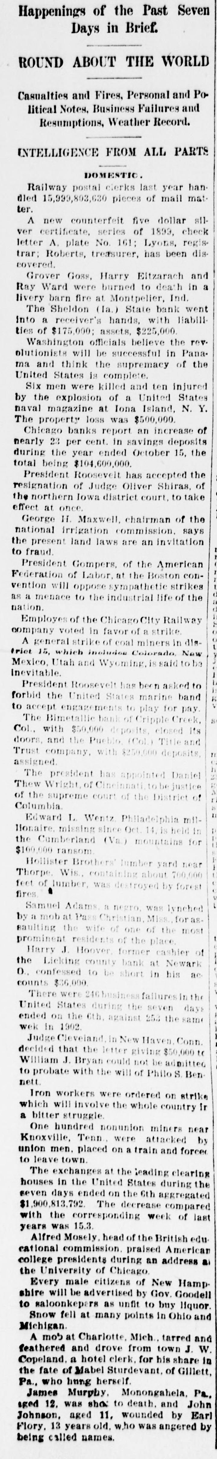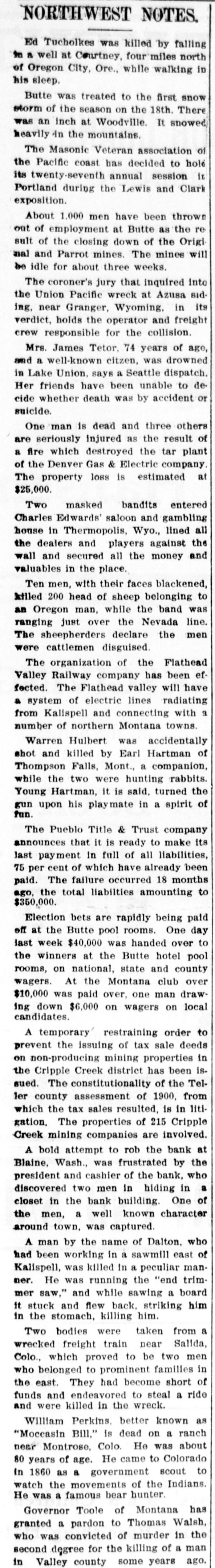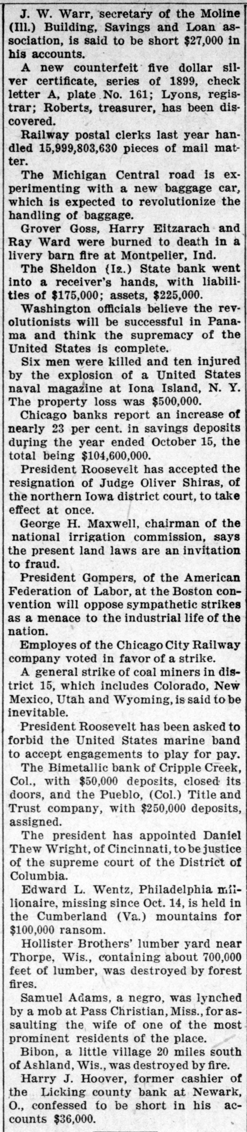 BANKS FAIL. A Trust Company Follows at Pueblo, Col. First National of Victor Closes Its Doors. Bi-Metallic at Cripple Creek Joins the Procession. DUE TO MINERS STRIKE Bank Officiais Were Interested in the Mines. Institution at Sheldon, Iowa, in Hands of Receiver. Colorado Springs, Col., Nov. 5.-A special to the Gazette from Victor states that the First National bank of Victor has closed its doors by order of Bank Examiner Lazear. Shrinkage of deposits as a result of the long continued miners' strike is given as the reason for suspending business. President F. M. Woods states that all depositors will be paid in full. The closing of the bank caused no apprehension in financial circles, either in Cripple Creek or Colorado Springs. TRUST COMPANY QUITS. Pueblo, Col., Nov. 5.-As a consequence of the failure of the First National bank of Victor, Col., the Pueblo Title and Trust company, capital $250,000, will not open for business today. The trust company is controlled by. the Woods Investment company which also owned the Victor institution. Small of the company anthat the deposits are nounce Secretary $250,000 and the assets are $450,000. An assignment has been made by the Pueblo Title and Trust company to E. P. Shove, of Colorado Springs. The bank did not open today, the managers being in fear of a run. Mr. Shove, after examining the condition of the assets stated today that the Title and Trust company is perfectly solvent and can pay all demands within 30 days. The bank's deposits are about a $250,000 including the accounts of aslarge number of working men. The sets are stated to be about $450,000. WOODS MAKES STATEMENT. Victor, Colo., Nov. 5.-Frank M. Woods, general manager of the Woods folInvestment company, has made the the lowing statement of the closing of of Victor National bank of this city, which "The he strike is president: resulted in withdrawals from the bank, chiefly by men who were leaving the district, and our reserve was depleted until T. P Kane, deputy the comptroller of the currency, ordered bank closed by Bank Examiner J. B. Lazear, who is in charge. The Woods First Investment company is behind the in National and depositors will be paid with full and the mining properties which the Woods Investment company is interested will continue operations as heretofore. DUE TO MINERS' STRIKE. Washington, Nov. 5.-The First Nabank of Victor, Col., has been tional closed by direction of the acting comptroller of the currency, the examiner James reporting the bank to be insolvent. B. Lazear, national bank examiner, was has been appointed receiver. The bank organized in September, 1900. The failure, the acting comptroller by is due to losses sustained states, of excessive accommodations extended reason to mining interests with which the officers of the bank were connected. The statement of the reand liabilities of the bank on September sources 9, 1903, the date of the last of condition made to the comp- of report troller shows loans and discounts $231,742: cash and cash items, $63,514; deposits, $304,346. FARMERS RESPONSIBLE. Ia., Nov. 5.-The Sheldon bank Sheldon, closed its doors and will go into the hands of a receiver. Officers of the bank assign the cause of the failure to the slow payment of notes by farmers the past two years. RECEIVER NAMED. Ia., Nov. 5.-Judge Gaynor, on application Sibley, of the stockholders, ap- the pointed W. R. Ady receiver of State bank at Sheldon. The assets are about $225,000; liabilities about $175,000.
