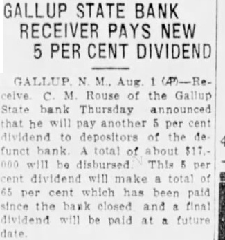 GALLUP STATE BANK RECEIVER PAYS NEW 5 PER CENT DIVIDEND