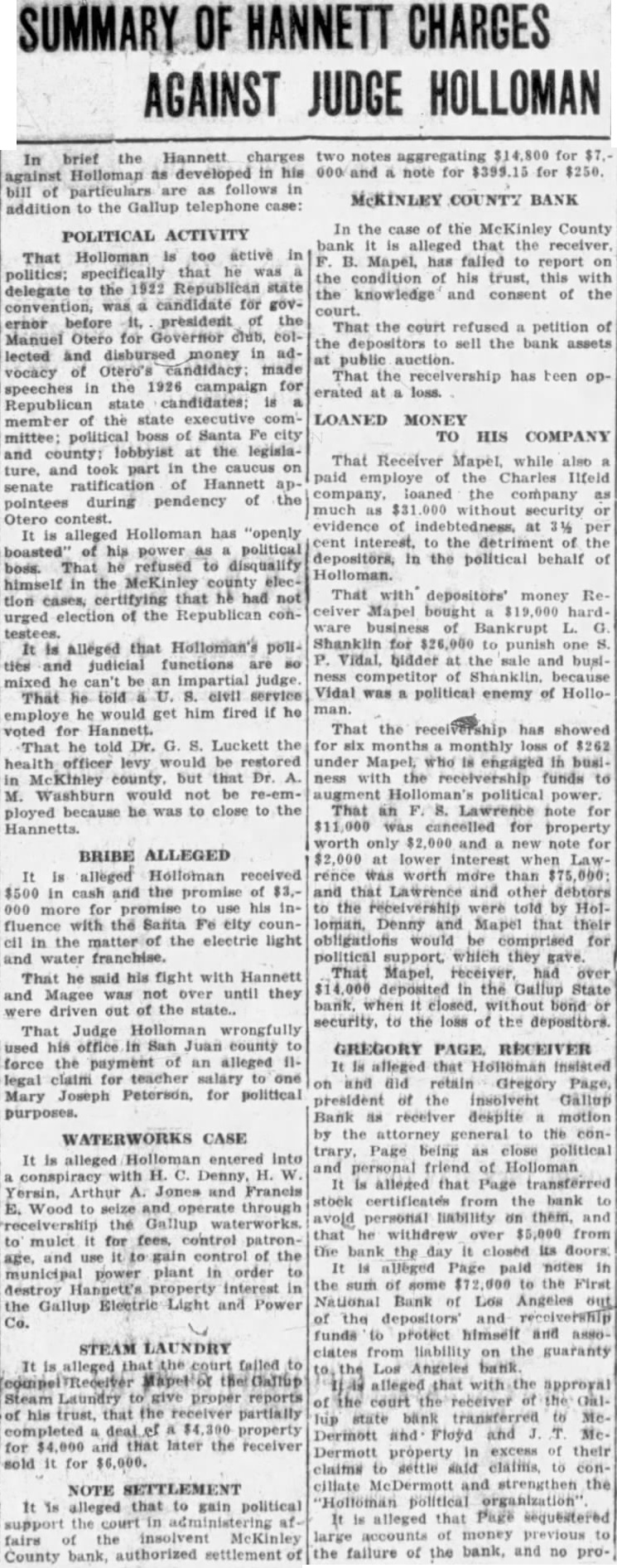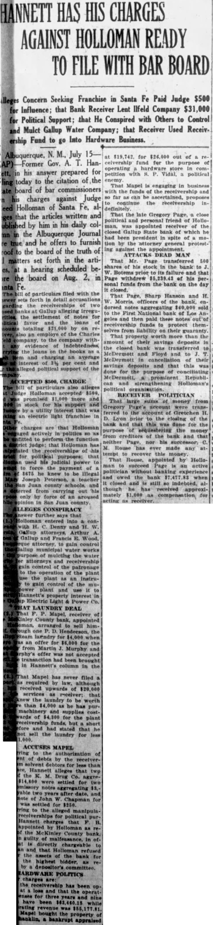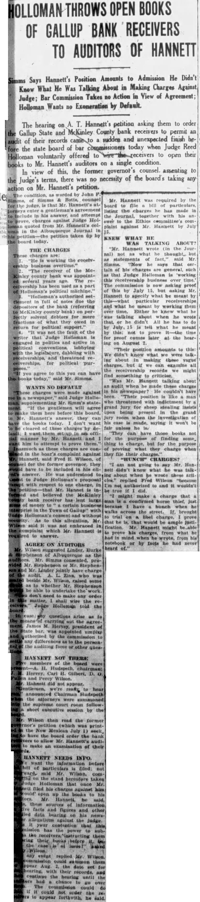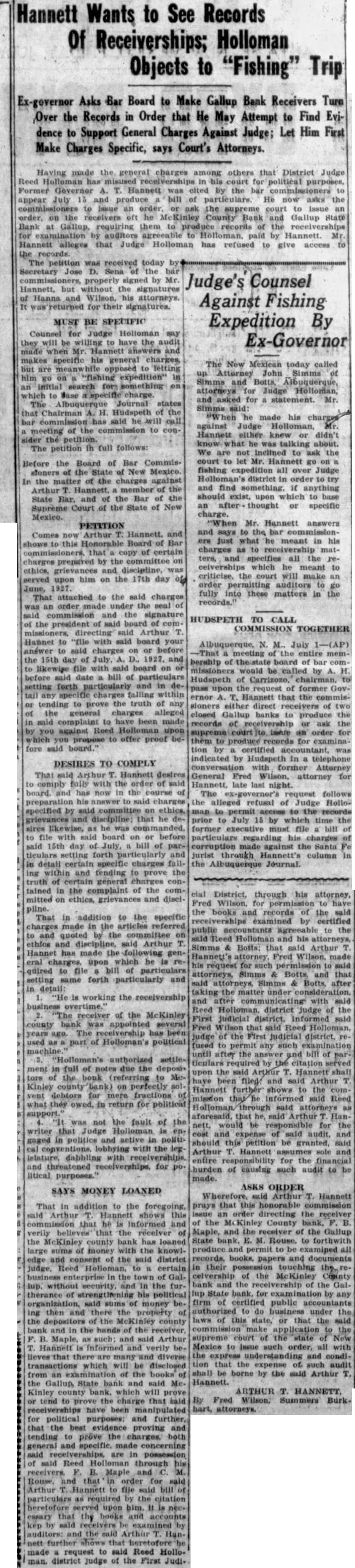 Hannett Wants to See Records Of Receiverships; Holloman Objects to "Fishing" Trip Ex-governor Asks Bar Board to Make Gallup Bank Receivers Turn Over the Records in Order that He May Attempt to Find Evidence to Support General Charges Against Judge; Let Him First Make Charges Specific, says Court's Attorneys. Having made the general charges among others that District Judge Reed Holloman has in his court for political purposes, Former Governor 4. T. Hannett was cited by the bar to appear July 15 and produce bill of particulars. He now asks the commissioners to Issue an order or ask the supreme court to issue an order, on the receivers oft he McKinley County Bank and Gallup State Bank at Gallup, requiring them to produce records of the receiverships for examination by auditors agreeable to Holloman, paid by Hannett. Mr. Hannett alleges that Judge Holloman has refused to give access to the records. The petition was received today by Secretary Jose D. Sena of the bar commissioners, properly signed by Mr. Hannett, but without the signatures of Hanna and Wilson, his attorneys. It was returned for their signatures. MUST BE SPECIFIC Counsel for Judge Holloman say they will be willing to have the audit made when Mr. Hannett and makes specific his general charges, but are meanwhile opposed to letting him go on "fishing expedition" in an initial search for something on which to Base charge. The Journal states that Chairman A. H. Hudspeth of the bar commission has said he will call a meeting of the to consider the petition. The petition in full follows: Before the Board of Bar Commisstoners of the State of New Mexico. In the matter of the charges against Arthur Hannett, a member of the State Bar. and of the Bar of the Supreme Court of the State of New Mexico. PETITION Comes now Arthur T. Hannett. and shows to this Honorable Board of Bar commissioners, that copy of certain charges prepared by the committee on ethics, grievances and discipline, was served upon him on the 17th day of June, 1927. That attached to the said charges was an order made under the seal of said commission and the signature of the president of said board of commissioners, directing said Arthur T. Hannet to "file with said board your answer said charges on or before the 15th day of July, A. D., 1927. and to likewise file with said board on or before said date a bill of particulars setting forth particularly and in detail any specific charges falling within or tending to prove the truth of any of the general charges alleged in said complaint to have been made by you against Reed Holloman upon which propose to offer proof before said board. DESIRES TO COMPLY That said Arthur T. Hannett desires to comply fully with the order of said board. and has now in the course of preparation his answer to said charges specified by said committee on ethics, grievances and discipline; that he desires likewise, as he was commanded, to file with said board on or before said 15th day of July, bill of particulars setting forth particularly and in detail certain specific charges falling within and tending to prove the truth of general contained in the complaint of the committed on ethics, grievances and discipline. That in addition to the specific charges made in the articles referred to and quoted by the committee on ethics and discipline, said Arthur T. Hannet has made the following general upon which he is required to file bill of particulars setting same forth particularly and in detail: is working the receivership overtime.' 2. "The receiver of the McKinley county bank was appointed several years ago. The receivership has been used as part of Holloman's political machine "Holloman's authorized settlement in full of notes due the deposit tors of the bonk (referring to MeKinley county bank) on perfectly solvent debtors for mere fractions of what they owed, in return for political "It was not the fault of the writer that Judge Holloman is engaged in politics and active in political lobbying with the leg islature, dabbling with receiverships, and threatened receiverships, for political purposes." SAYS MONEY LOANED That in addition to the foregoing, said Arthur T. Hannett shows this that he is informed and verily believes that the réceiver of the McKinley county bank has loaned large sums of money with the knowledge and consent of the said district judge, Reed Holloman, to certain business in the town of Gallup. without security. and in the furtherance of strengthening his political organization, said sums of money be. ing then and there the property of the of the McKinley county bank and in the hands of the receiver, F. B. Maple, as such; and said Arthur T. Hannett is Informed and verily believes that there are many and diverse transactions which will be disclosed from an of the books of the Gallup, State bank and said Me. Kinley county bank, which will prove or tend to prove the charge that said receiverships have been manipulated for political purposes: and further, that the best evidence proving and tending to prove the charges. both general and specific. made concerning said are in possession of said Reed Holloman through his receivers. F. B. Maple and C. M. Rouse, and that in order for said Arthur T. Hannett to fije said bill of particulars as required by the citation heretofore served upon him, it is necessary that the books and accounts kep by said examined by auditors: and the said Arthur T. Hannett further that heretofore made a request to said Reed Holloman. district judge of the First Judi- clal District, through his attorney, Fred Wilson, for permission to have the books and records of the said receiverships examined by certified public accountants agreeable to the said Reed Holloman and his attorneys, Simms & Botts: that said Arthur T. Hannett's attorney, Fred Wilson, made his request for such permission to said attorneys, Simms & Botts and that said Simms & Botts, after taking the matter under and after communicating with said Reed Holl