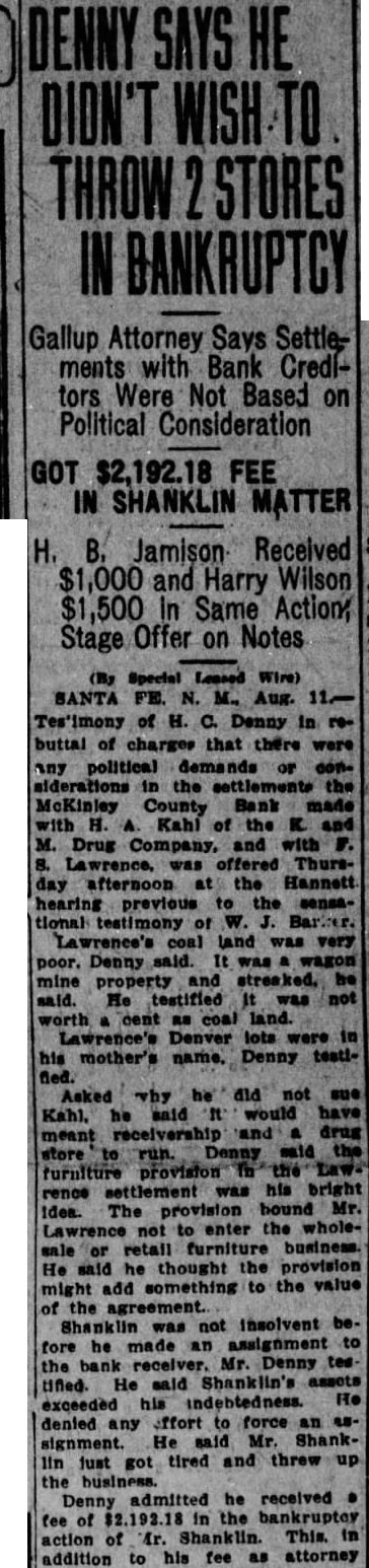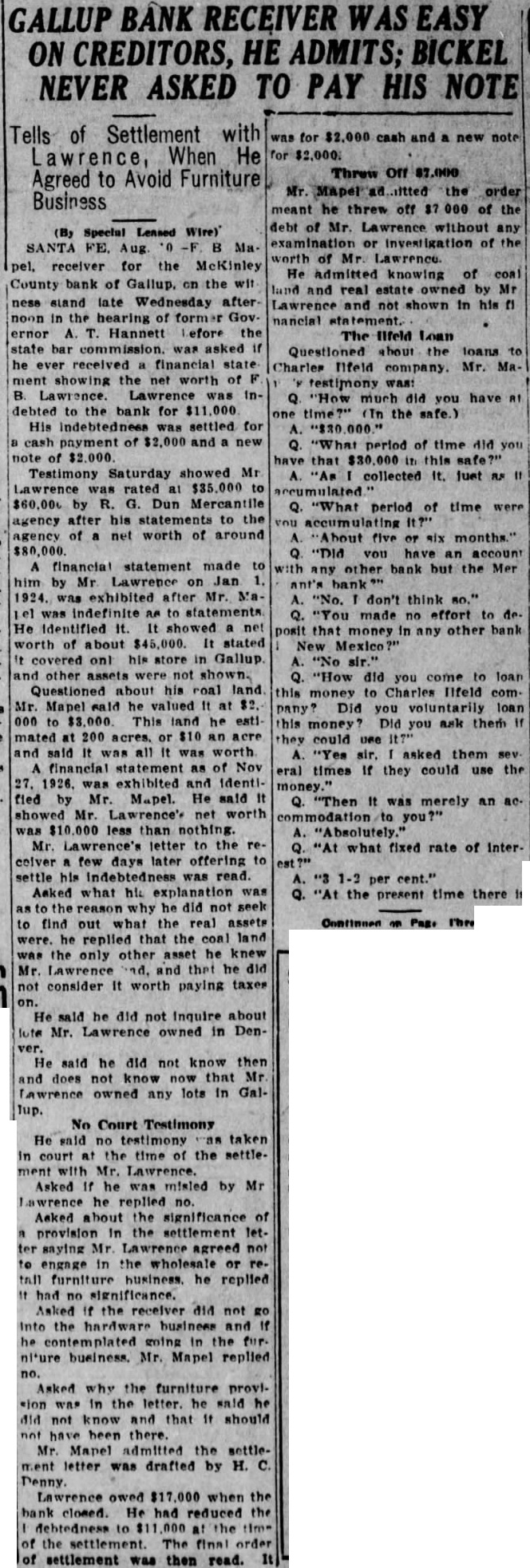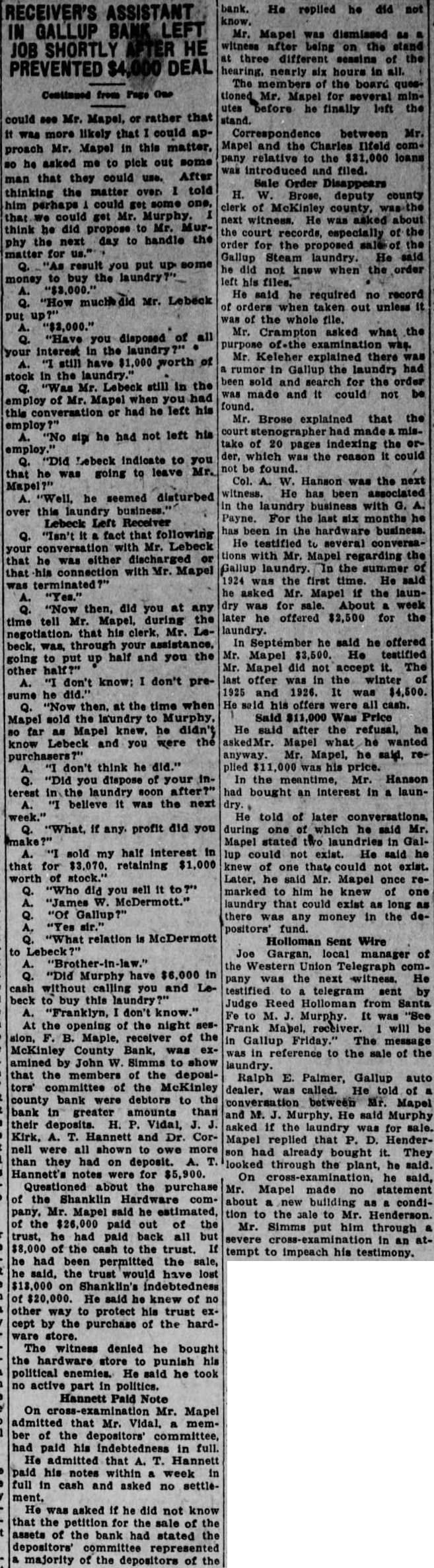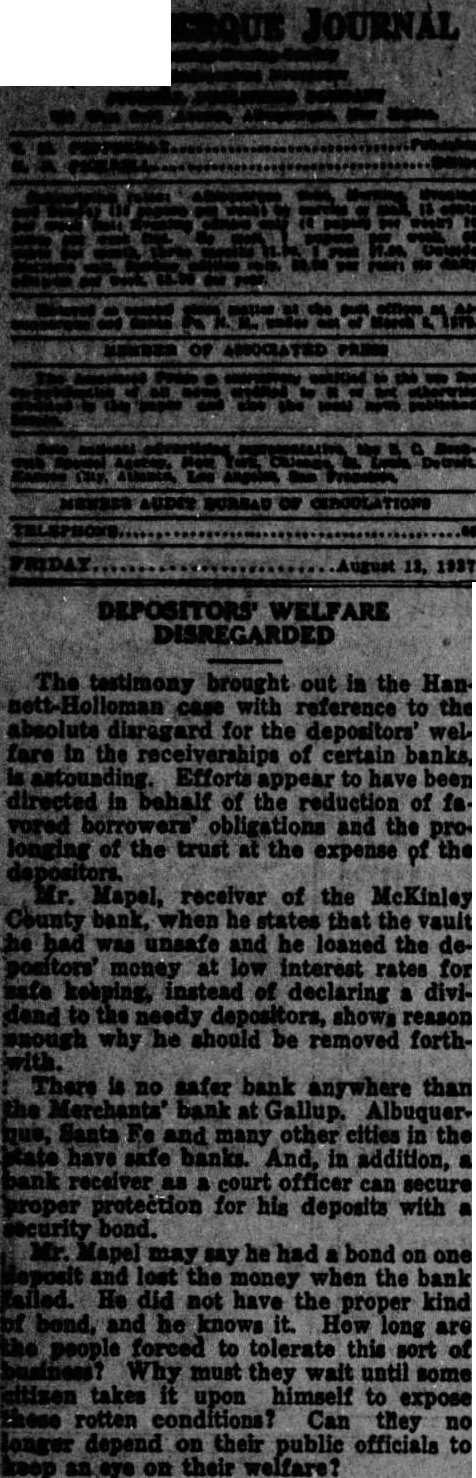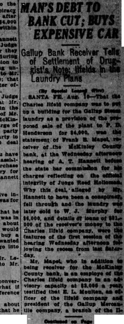 Hannett Wants to See Records Of Receiverships; Holloman Objects to "Fishing" Trip Ex-governor Asks Bar Board to Make Gallup Bank Receivers Turn Over the Records in Order that He May Attempt to Find Evidence to Support General Charges Against Judge; Let Him First Make Charges Specific, says Court's Attorneys. Having made the general charges among others that District Judge Reed Holloman has in his court for political purposes, Former Governor 4. T. Hannett was cited by the bar to appear July 15 and produce bill of particulars. He now asks the commissioners to Issue an order or ask the supreme court to issue an order, on the receivers oft he McKinley County Bank and Gallup State Bank at Gallup, requiring them to produce records of the receiverships for examination by auditors agreeable to Holloman, paid by Hannett. Mr. Hannett alleges that Judge Holloman has refused to give access to the records. The petition was received today by Secretary Jose D. Sena of the bar commissioners, properly signed by Mr. Hannett, but without the signatures of Hanna and Wilson, his attorneys. It was returned for their signatures. MUST BE SPECIFIC Counsel for Judge Holloman say they will be willing to have the audit made when Mr. Hannett and makes specific his general charges, but are meanwhile opposed to letting him go on "fishing expedition" in an initial search for something on which to Base charge. The Journal states that Chairman A. H. Hudspeth of the bar commission has said he will call a meeting of the to consider the petition. The petition in full follows: Before the Board of Bar Commisstoners of the State of New Mexico. In the matter of the charges against Arthur Hannett, a member of the State Bar. and of the Bar of the Supreme Court of the State of New Mexico. PETITION Comes now Arthur T. Hannett. and shows to this Honorable Board of Bar commissioners, that copy of certain charges prepared by the committee on ethics, grievances and discipline, was served upon him on the 17th day of June, 1927. That attached to the said charges was an order made under the seal of said commission and the signature of the president of said board of commissioners, directing said Arthur T. Hannet to "file with said board your answer said charges on or before the 15th day of July, A. D., 1927. and to likewise file with said board on or before said date a bill of particulars setting forth particularly and in detail any specific charges falling within or tending to prove the truth of any of the general charges alleged in said complaint to have been made by you against Reed Holloman upon which propose to offer proof before said board. DESIRES TO COMPLY That said Arthur T. Hannett desires to comply fully with the order of said board. and has now in the course of preparation his answer to said charges specified by said committee on ethics, grievances and discipline; that he desires likewise, as he was commanded, to file with said board on or before said 15th day of July, bill of particulars setting forth particularly and in detail certain specific charges falling within and tending to prove the truth of general contained in the complaint of the committed on ethics, grievances and discipline. That in addition to the specific charges made in the articles referred to and quoted by the committee on ethics and discipline, said Arthur T. Hannet has made the following general upon which he is required to file bill of particulars setting same forth particularly and in detail: is working the receivership overtime.' 2. "The receiver of the McKinley county bank was appointed several years ago. The receivership has been used as part of Holloman's political machine "Holloman's authorized settlement in full of notes due the deposit tors of the bonk (referring to MeKinley county bank) on perfectly solvent debtors for mere fractions of what they owed, in return for political "It was not the fault of the writer that Judge Holloman is engaged in politics and active in political lobbying with the leg islature, dabbling with receiverships, and threatened receiverships, for political purposes." SAYS MONEY LOANED That in addition to the foregoing, said Arthur T. Hannett shows this that he is informed and verily believes that the réceiver of the McKinley county bank has loaned large sums of money with the knowledge and consent of the said district judge, Reed Holloman, to certain business in the town of Gallup. without security. and in the furtherance of strengthening his political organization, said sums of money be. ing then and there the property of the of the McKinley county bank and in the hands of the receiver, F. B. Maple, as such; and said Arthur T. Hannett is Informed and verily believes that there are many and diverse transactions which will be disclosed from an of the books of the Gallup, State bank and said Me. Kinley county bank, which will prove or tend to prove the charge that said receiverships have been manipulated for political purposes: and further, that the best evidence proving and tending to prove the charges. both general and specific. made concerning said are in possession of said Reed Holloman through his receivers. F. B. Maple and C. M. Rouse, and that in order for said Arthur T. Hannett to fije said bill of particulars as required by the citation heretofore served upon him, it is necessary that the books and accounts kep by said examined by auditors: and the said Arthur T. Hannett further that heretofore made a request to said Reed Holloman. district judge of the First Judi- clal District, through his attorney, Fred Wilson, for permission to have the books and records of the said receiverships examined by certified public accountants agreeable to the said Reed Holloman and his attorneys, Simms & Botts: that said Arthur T. Hannett's attorney, Fred Wilson, made his request for such permission to said attorneys, Simms & Botts and that said Simms & Botts, after taking the matter under and after communicating with said Reed Holl