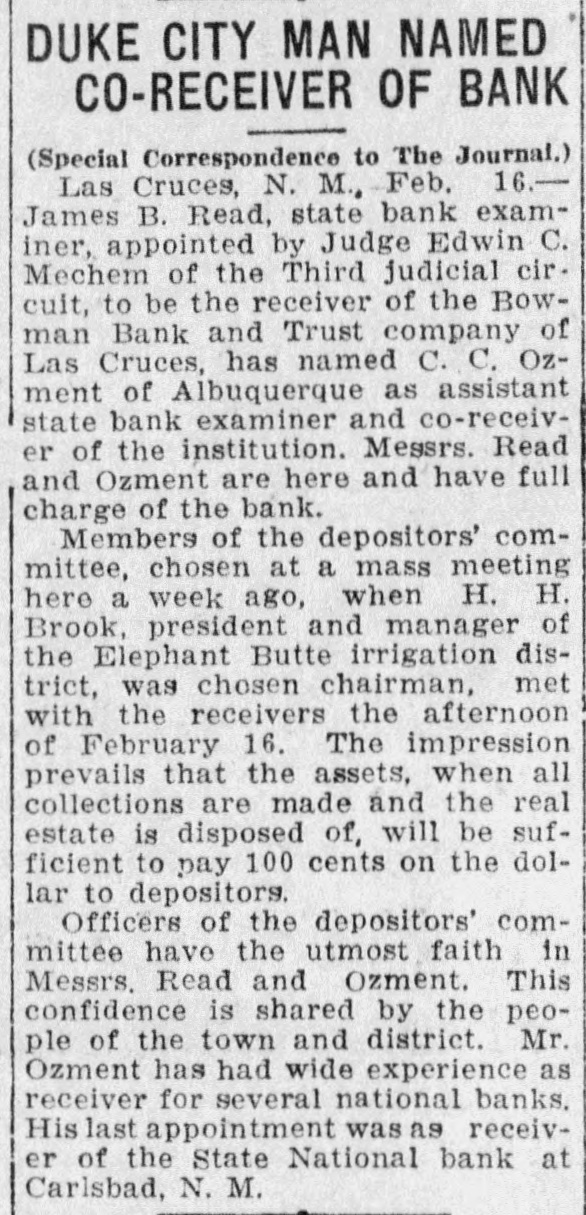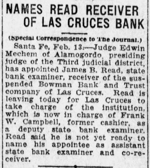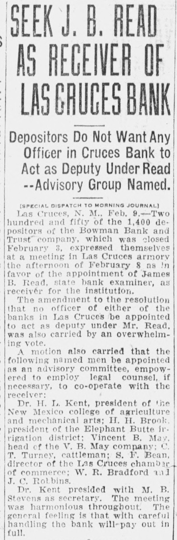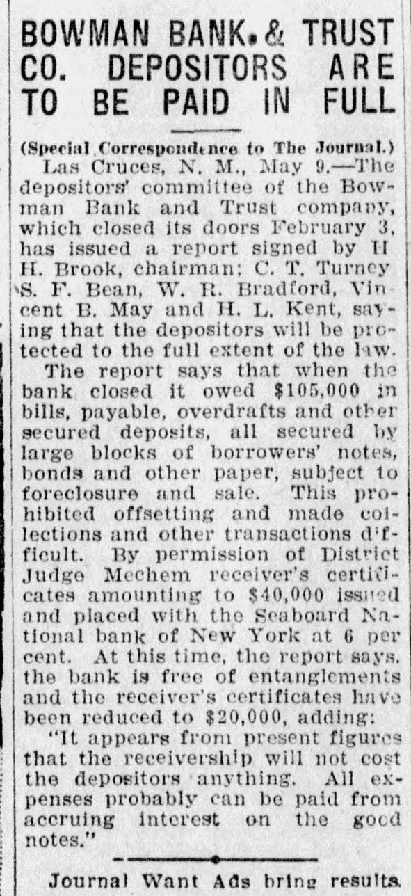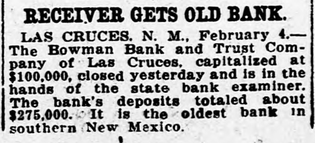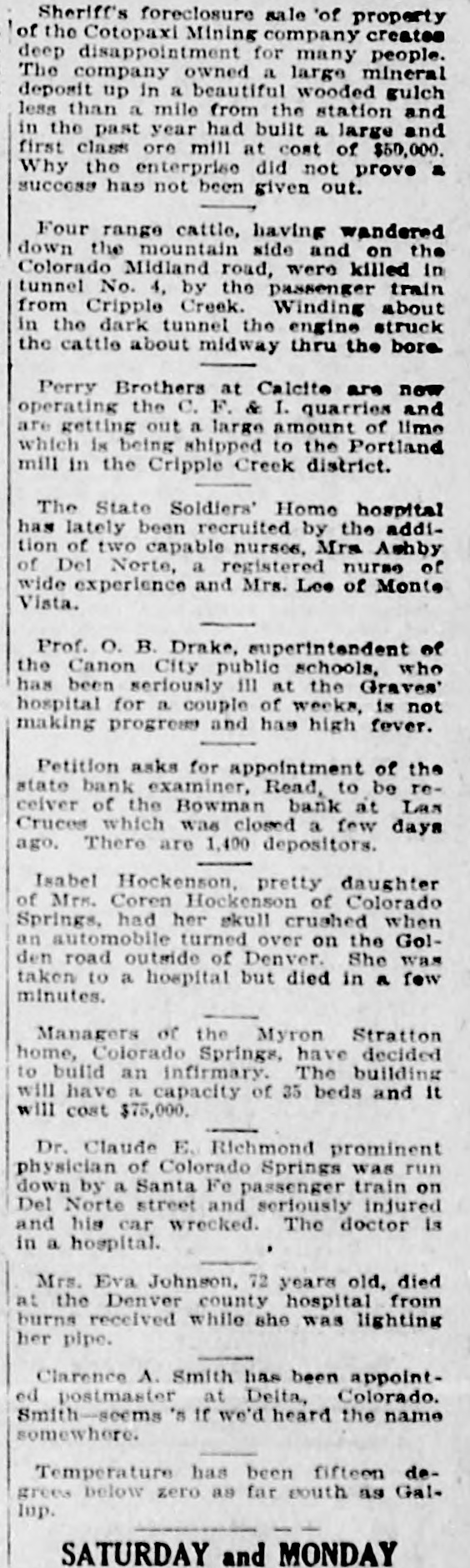 Sheriff's foreclosure sale 'of property of the Cotopaxi Mining company creates deep disappointment for many people. The company owned a large mineral deposit up in a beautiful wooded gulch less than a mile from the station and in the past year had built a large and first class ore mill at cost of $60,000. Why the enterprise did not prove a success has not been given out. Four range cattle, having wandered down the mountain side and on the Colorado Midland road, were killed in tunnel No. 4, by the passenger train from Cripple Creek. Winding about in the dark tunnel the engine struck the cattle about midway thru the bore Perry Brothers at Calcite are now operating the C. F. & I. quarries and are getting out a large amount of lime which is being shipped to the Portland mill in the Cripple Creek district. The State Soldiers' Home hospital has lately been recruited by the addition of two capable nurses, Mrs. Ashby of Del Norte, a registered nurse of wide experience and Mrs. Lee of Monte Vista. Prof. O. B. Drake, superintendent of the Canon City public schools. who has been seriously ill at the Graves' hospital for a couple of weeks, is not making progress and has high fever. Petition asks for appointment of the state bank examiner, Read, to be receiver of the Bowman bank at Las Cruces which was closed a few days ago. There are 1,400 depositors. Isabel Hockenson, pretty daughter of Mrs. Coren Hockenson of Colorado Springs, had her skull crushed when an automobile turned over on the Go!den road outside of Denver. She was taken to a hospital but died in a few minutes. Managers or the Myron Stratton home, Colorado Springs, have decided to build an infirmary. The building will have a capacity of 35 beds and It will cost $75,000. Dr. Claude E. Richmond prominent physician of Colorado Springs was run down by a Santa Fe passenger train on Del Norte street and seriously injured and his car wrecked. The doctor is . in a hospital. vorume Mrs. Eva Johnson, 72 years old, died at the Denver county hospital from burns received while she was lighting her pipe. Clarence A. Smith has been appointed postmaster at Delta, Colorado. Smith-seems 's If we'd heard the name somewhere. Temperature has been fifteen degrees below zero as far eouth as GalIup. SATURDAY and MONDAY