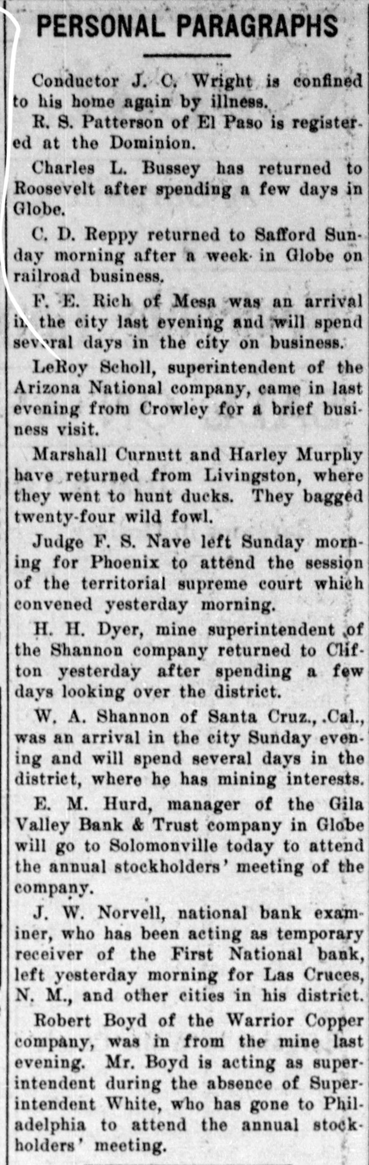 # PERSONAL PARAGRAPHS Conductor J. C. Wright is confined to his home again by illness. R. S. Patterson of El Paso is registered at the Dominion. Charles L. Bussey has returned to Roosevelt after spending a few days in Globe. C. D. Reppy returned to Safford Sunday morning after a week in Globe on railroad business. F. E. Rich of Mesa was an arrival in the city last evening and will spend several days in the city on business. LeRoy Scholl, superintendent of the Arizona National company, came in last evening from Crowley for a brief business visit. Marshall Curnutt and Harley Murphy have returned from Livingston, where they went to hunt ducks. They bagged twenty-four wild fowl. Judge F. S. Nave left Sunday morning for Phoenix to attend the session of the territorial supreme court which convened yesterday morning. H. H. Dyer, mine superintendent of the Shannon company returned to Clifton yesterday after spending a few days looking over the district. W. A. Shannon of Santa Cruz., Cal., was an arrival in the city Sunday evening and will spend several days in the district, where he has mining interests. E. M. Hurd, manager of the Gila Valley Bank & Trust company in Globe will go to Solomonville today to attend the annual stockholders' meeting of the company. J. W. Norvell, national bank examiner, who has been acting as temporary receiver of the First National bank, left yesterday morning for Las Cruces, N. M., and other cities in his district. Robert Boyd of the Warrior Copper company, was in from the mine last evening. Mr. Boyd is acting as superintendent during the absence of Superintendent White, who has gone to Philadelphia to attend the annual stockholders' meeting.
