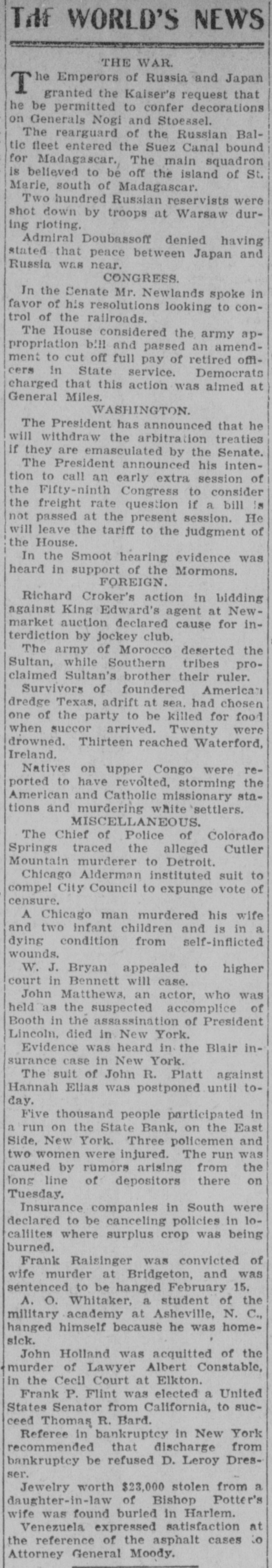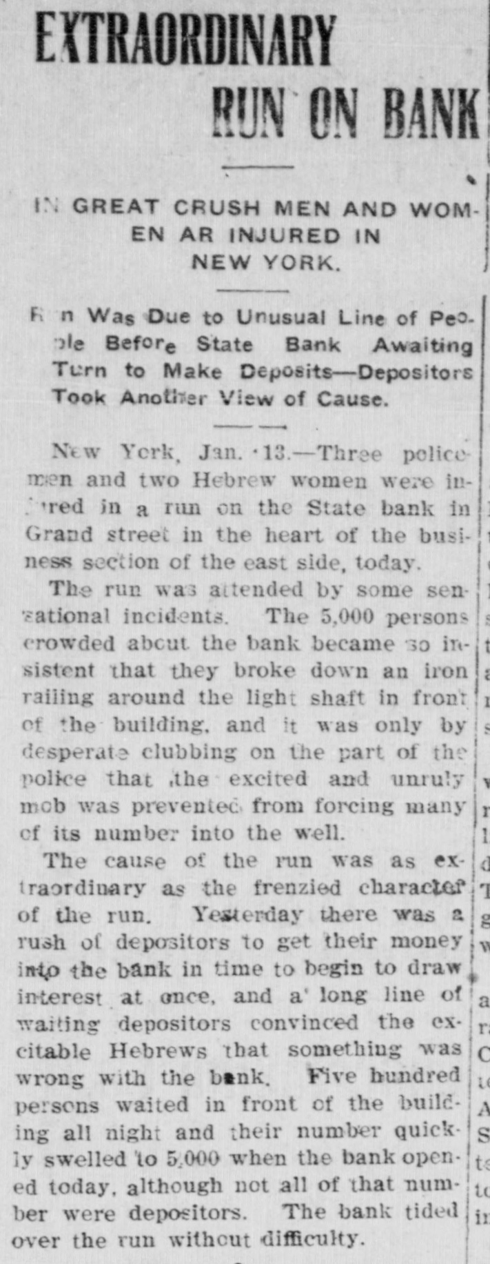 RUN ON NEW YORK BANK State POLICEMEN AND DEPOSITORS INJURED IN THE CRU It Was a Senseless Rush and Caused Great Excitement on the East SideDepositors Carried Away Loads of Silver. New York, Jan. 12.-Three policemen and two Hebrew women were injured in a run on the State Bank on Grand Street, in the heart of the business section of the east side. The run was attended by some sensational incidents. The 5,000 persons crowded about the bank became so insistent that they broke down an iron railing around a light well in front of the building and it was only by desperate clubbing on th part of the police that the excited and unruly mob was prevented from forcing many of its number into the well. The policemen and women were hurt at tha point. The emergency police detail o the Delancey Street station was finally called out, and policemen were stationed at intervals of five or six feet for two blocks on either side of the bank. The cause of the run was as extraordinary as the frenzied condition of the crowd. Yesterday there was a rush of depositors to get their money into the bank i time to begin to draw interest at once and the long line of waiting depositors convinced the excitable Hebrews that something was wrong with the institution. Five hundred persons waited in front of the building all last night and their number quickly swelled to 5,000 when the bank opened today, though not all of the number were depositors. The bank which has deposits of $10, 500,000, and a cash reserve of $4,000,000 and which, Cashier A. A. Vorhis said, earned 224 per cent profits last year, sent down street for money early today and $250,000 was brought by the wagon load, largely in specie. At the sight of money the people waiting only became more impatient to get at it. The bank officials paid depositors off as fast as the operation could be conducted. In all, the bank paid out today $55,000 and received in deposits $440,000. Remarkable scenes attended the paying off within the bank. The officers paid off in specie and small bills and some of the depositors were fairly overwhelmed by the amount of currency passed to them when they passed in their books. Immediately upon 'getting their modey into their hands and becoming