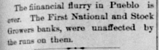 THE CRISIS IS PASSED. The run on Four Pueblo Banks has Ceased and the Three now Closed Will Shortly Resume. The financial flurry now agitating every portion of the United States reached Pueblo last Wednesday. It was bound to come. Men had been talking about it for weeks and BO when the crash came it was no surprise, and people having unbounded confidence in the soundness of the banks but little apprehension was felt as to the result. of the seven banks in Pueblo three closed their doors Wednesday, the American National Bank leading and followed by the Western National Bank and the Central National Bank. Soon runs were made by small depositors on the First National Bank, the Pueblo National Bank, The Pueblo Savings Bank and the Stockgrowers Bank, which continued throughout the day and up to Thursday noon when the depositors who presented checks were paid off in full. The four banks nobly weathered the storm and proved themselves strong. The Pueblo National especially received much praise and President D. R. Greene has made for himself and his bank a good name. Chris Wilson of the Savings bank smilingly paid out deposits but many turned away without drawing their money when assured by Mr. Wilson that the bank was all right. The banks which closed their doors were obliged to do so on account of the quiet run of depositors for several weeks past who have been withdrawing their money and placing it in safty deposit boxes, $280,000 having been taken from the American National and $175,000 from the Western National bank in this way. The suspension is only temporary and the three banks will open up for business in a very short time, probably some time next week. There is not a failure among them. Each 18 perfectly solvent and will satisfy every depositor as soon as their loans are collected and they can obtain money on their securities. To the credit of the citizens at large it must be said that they behaved magnanimously in not withdrawing their deposits from the suspended banks while they could nor from the open banks while therun was going on. They realized that they owed a debt to the community and stood aloof from further cramping the banks. The class of Bohemians, Chinese, dagoes, negroes and such like who went wild were scarcely responsible for what they did, although some good people were obliged to draw their money from necessity. Pueblo has had its "object lesson" in finance as the inevitable result of the debasement of silver