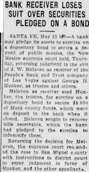 BANK RECEIVER LOSES SUIT OVER SECURITIES PLEDGED ON A BOND SANTA FE, May 21 (P)-A bank may pledge its assets to on depository bond to secure 1eposit of public monies, the New Mexico supreme court held. Thursday, reversing judgment in the suit W. Melaven as receiver of the People's Bank and Trust company of Las Vegas against George H Hunker, as trustee and others. Melaven as sued Hunker, the trustee, for sureties on depository bond to secure $8 000 of Mora funds, which were on deposit in the bank when It closed. Melaven sought to recover bills receivable, which the bank had pledged to the sureties to indemnify them. Reversing the decision for Melthe court ren.anded the case to San Miguel county with instructions to district court to enter judgment in favor of Hunker. and the other appellants.
