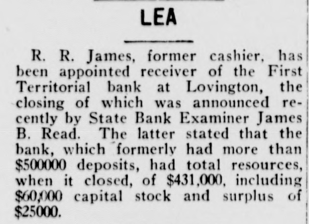 LOVINGTON BANK SUSPENDS. SPECIAL TO THE HERALD SANTA FE. Nov. 1.-R. R. James. former cashier, has been designated by the state bank examiners's office as receiver for the First Territorial bank. of Lovington, which has suspended business.