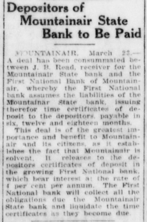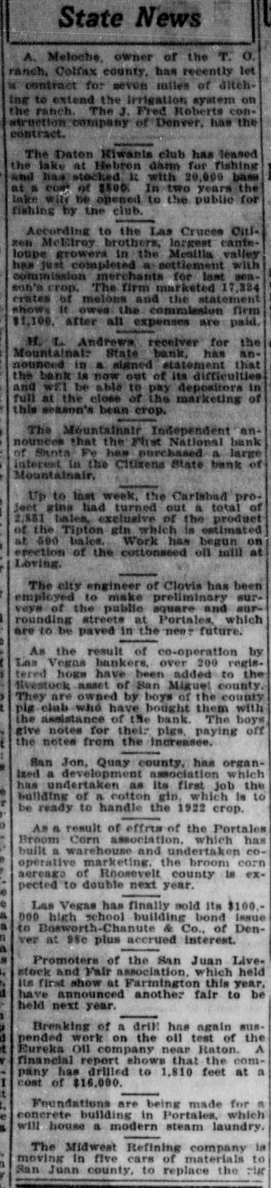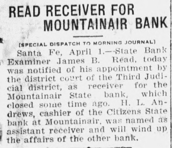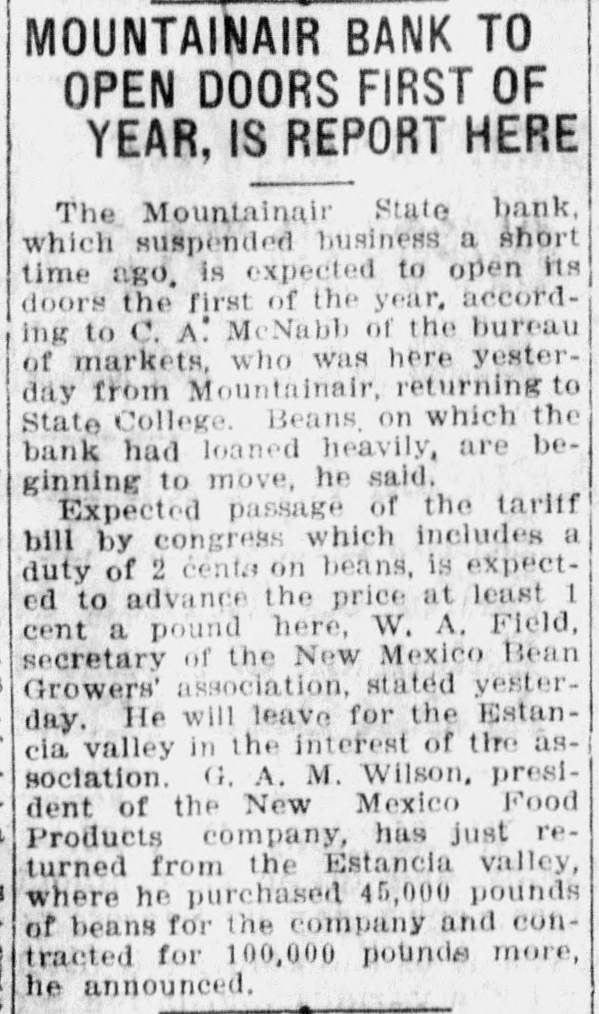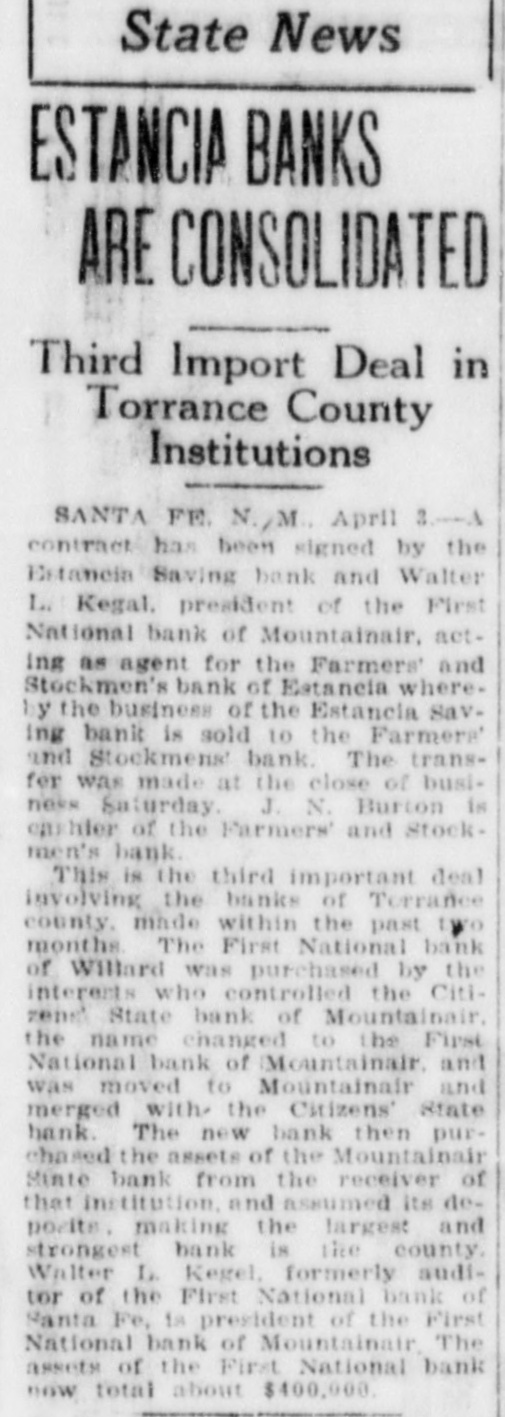 STATE HAVE S IN CARRIEDARE s (By Smith) Guthrie t business , unfavorable In spite New of Mexico make gains through in de have total 1920. e posits report condition and encouraging to resources of features This of is f state just been by James o one the shown calendar of in the the banking sixth department. annual filed with Gov The re B e - has Mechem the report the Merritt state C. bank account practical- The of d port trade has o Read, that stagnationen on coming general no shows new money This has resulted unlavorable 0 ly the state. extremelybut this confor the been into condition has state banks, dealt with banks in a cred sus, the the year 1 : pended charters were became itable dition Only manner. two business of during issued state members to 10 new of i while eight system. : banks and reserve was created, banks the federal the department state There are now When 1915, there were of 429,909. and on Nov. under the in having resources 78 state call banks, of the comptro 17, 1920, of the currency, total of $27,295,325. the had ler reached New Charters fol were Ten issued to The Bank Charters institutions: the First new Roswell Loving lowing of Commerce, bank, Loving; Grenville Bank the the Farmers of Roy, Las State bank, the bank, : State bank, Vegas and Roy; State the the Las Clovis; Farmers the State Citizens Farmers Stockmens State State bank, Mountainair, the bank, Moriarty; Vegas; Clayton; the Home State have bank, Mt. Dora. state banks federal reThe bank, The following members of the Citizens Santa bank, become system Capital City bank, and Saving: Aztec serve the Trust Stockmens Fe; State the the First Term bank, bank, Corona Lovington the Mount the State torial bank. State bank; bank, Mountainair Portales: the tainair Security State bank, at become in First The State Bank of the SpringeNational First bank the of has Springer. reference to report changes says: several With banks, the Applications have been banks to sys There Other Reserve state filed reserve several becom. anas plications of the federal has been taken State members of no final action federal reserve whose under tem, but yet by the banks on $25,000. their authorities capital stock 1920, was have in January stock 1, to at section least 8 of amend the New compliance capital Mexico with banking act, Savings as bank ed. The increased Roy Trust its and capital stock Stockmens from bank, of $15,000 Roy, to Farmers $50,000. and nded its arand ticles stock to Bank "The of incorporation. Estandation, increasing Trust its art capital The Farmers Maxwell, amended its company, incorporation, and Merchant State Vegas icles name of bank to the of Farmers Maxwell Savings articles bank "The Las amended its commercial Las Vegas, to do Originally, a under bank banking incorpora business. the business accounts. of the its charter, to savings was limited Two Suspinsions Only the Columbus time State at the "On bank Nov. is 4, Columbus, 1920. present A closed Wield doors, and of Mr. bank examiner hands yet been the state not will special deputy it has bank determined reopen At this writing whether whether the it shall be able to to liquidate the Mountainsir be required 16. 1920, closed On Dec. Mountaination the bank State bank the affairs a crecial deput doors and hands of I believe the ban are in bank examiner time this its affairs state within a short straighten out be able to the state bank in and During reopen." the increase year of There $4 094,767 is an in showed an of resources. decreases 17 10 items of $301,333 The in principal bonds item offset other items. was in liberty three decreases to $186,153. almns $20,000,000. of and amounts banks had on as deposit follows: De de- t These divided time deposits, in The was $2,250. deposits 000. posits. mard $6,505,Septroximately y Banks leads in Counties in number, is next with county Torance Socortr seven in with Union six, state Colfax, each, banks, while Mora and Miguel Dona have Ana, t to have five and San and Vafour each. Lincoln. none. Taos newspaper. has no o ti R lencia have kind. nor a and finan- t cial bank As conditions to of general any of the the business report state says: have difficult dur et to banks many credit of S the year it is to problems ing problems "The and that faced these the During the in managements so well met. liberally of their va- of s war money funds have been banks gave making the to the in success51 time and drives for the production the at rious war supporting same time de ful. and At the severe sea P of of foodsturienced foodstuffs. experienced and a very unustial the winter livein state son of drought which crippled disastronely in conditions most 1920 has V stock growers The year growers; and to crops many their Lee nmost stock, instanavatable bring and good various returns to relieve later the bid on ta th c1 w pa fair to could be used stood behind them during which which had seasone S banks winfavorable Not Maxine Products