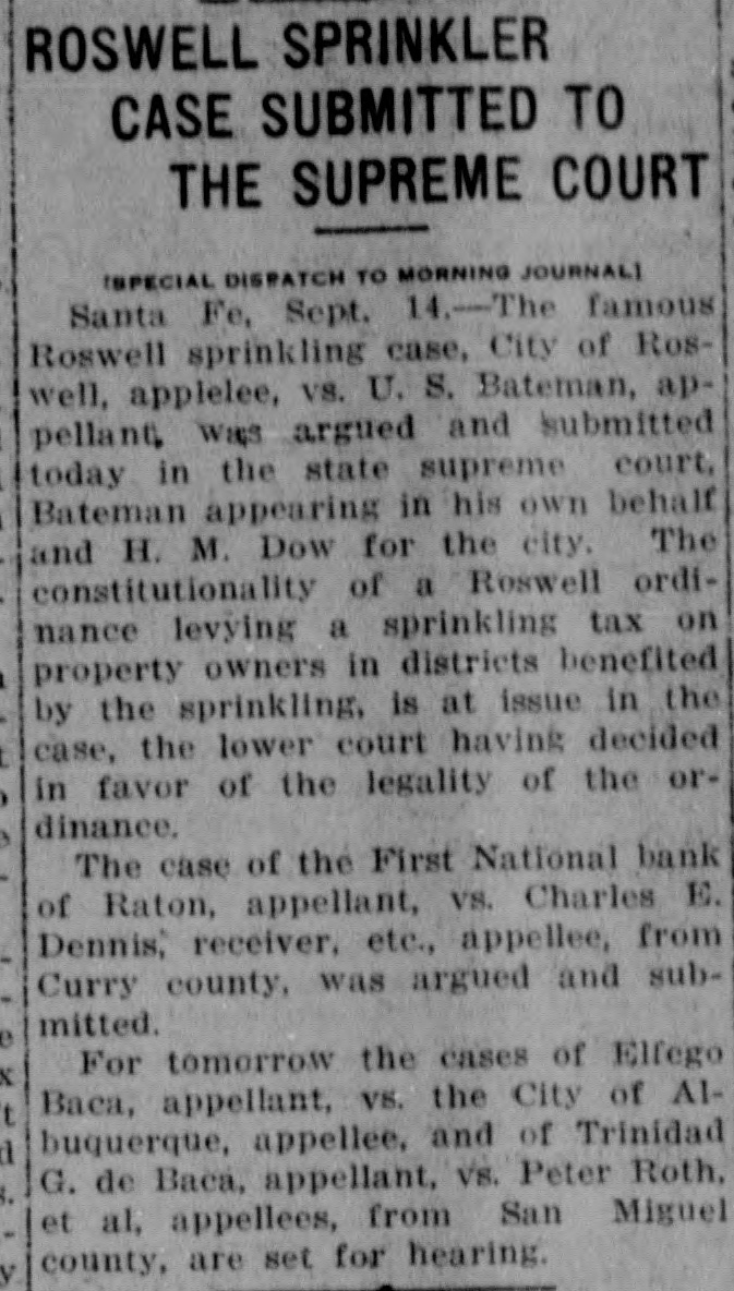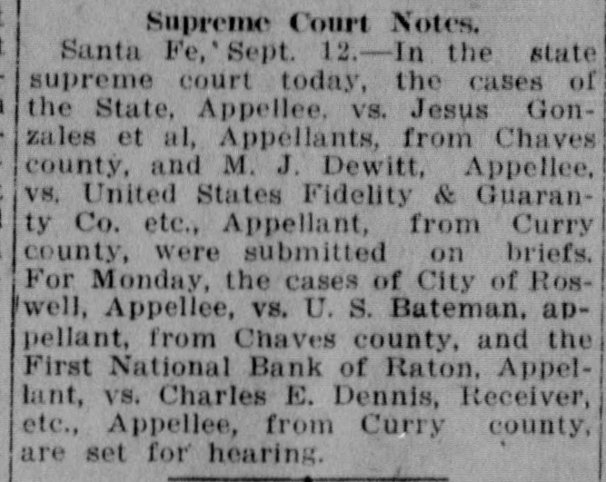Supreme Court Notes. Santa Fe,'Sept. 12.-In the state supreme court today, the cases of the State, Appellee, VS. Jesus Gonzales et al, Appellants, from Chaves county, and M. J. Dewitt, Appellee, vs, United States Fidelity & Guaranty Co. etc., Appellant, from Curry county, were submitted on briefs. For Monday, the cases of City of Roswell, Appellee, vs. U. S. Bateman, appellant, from Chaves county, and the First National Bank of Raton, Appellant, vs. Charles E. Dennis, Receiver, etc., Appellee, from Curry county, are set for hearing.
