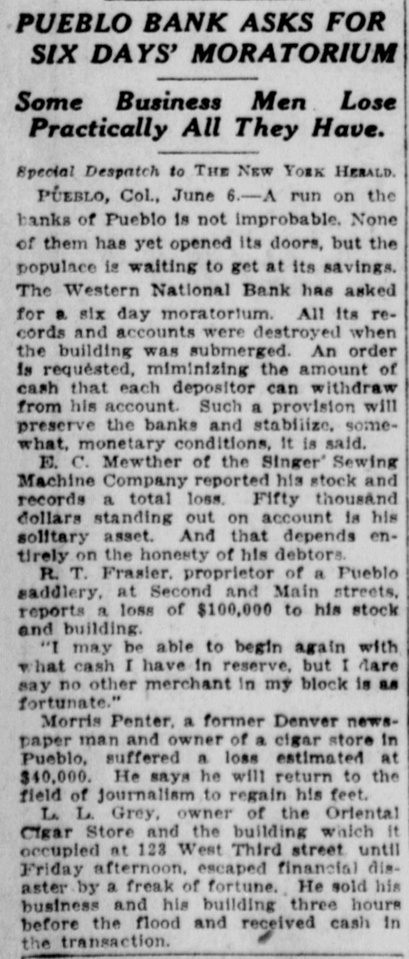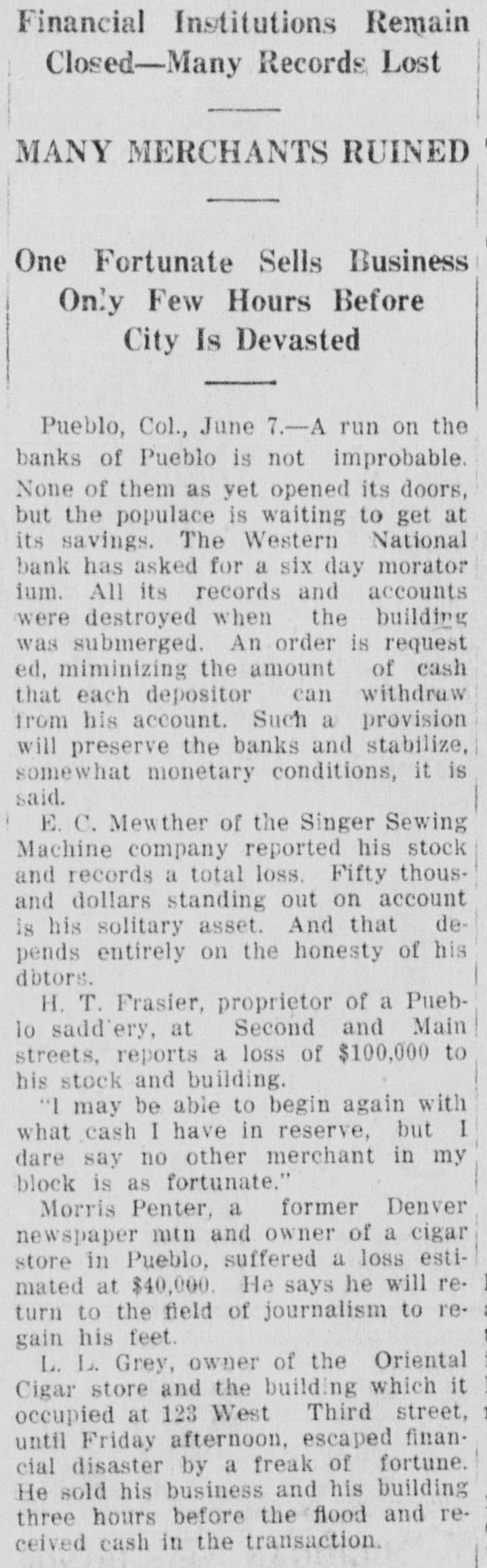 Financial Institutions Remain Closed-Many Records Lost MANY MERCHANTS RUINED One Fortunate Sells Business Only Few Hours Before City Is Devasted Pueblo, Col., June 7.-A run on the banks of Pueblo is not improbable. None of them as yet opened its doors, but the populace is waiting to get at its savings. The Western National bank has asked for a six day morator ium. All its records and accounts were destroyed when the building was submerged. An order is request ed, miminizing the amount of cash that each depositor can withdraw from his account. Such a provision will preserve the banks and stabilize, somewhat monetary conditions, it is said. E. C. Mewther of the Singer Sewing Machine company reported his stock and records a total loss. Fifty thousand dollars standing out on account is his solitary asset. And that depends entirely on the honesty of his dbtors. H. T. Frasier, proprietor of a Pueblo sadd'ery, at Second and Main streets, reports a loss of $100,000 to his stock and building. "I may be able to begin again with what cash I have in reserve, but I dare say no other merchant in my block is as fortunate." Morris Penter, a former Denver newspaper mtn and owner of a cigar store in Pueblo, suffered a loss estimated at $40,000. He says he will return to the field of journalism to regain his feet. L. L. Grey, owner of the Oriental Cigar store and the building which it occupied at 123 West Third street, until Friday afternoon, escaped financial disaster by a freak of fortune. He sold his business and his building three hours before the flood and received cash in the transaction.