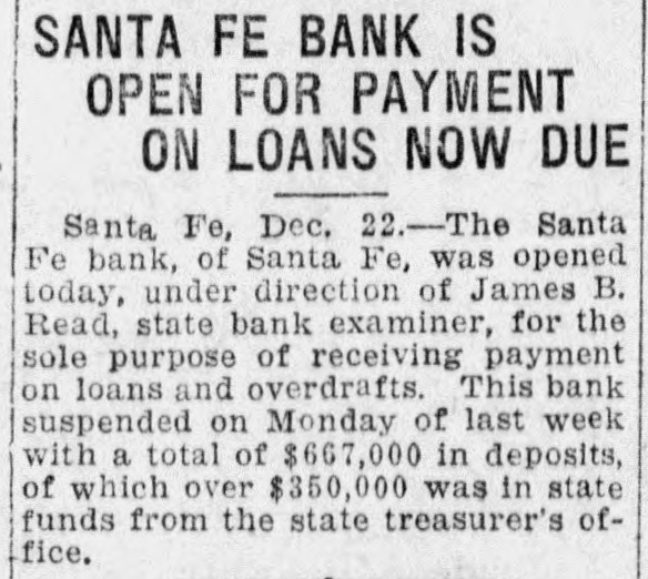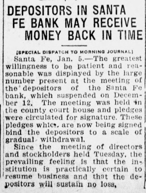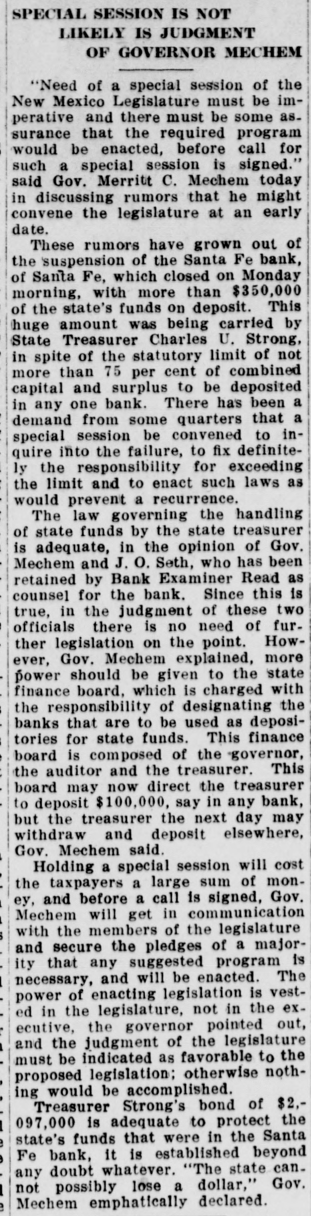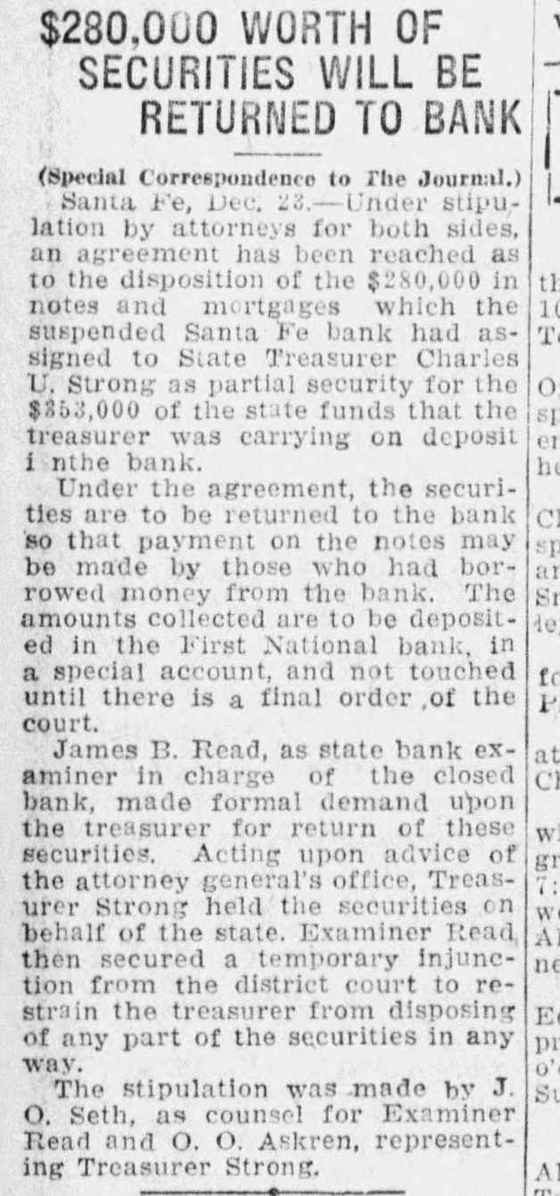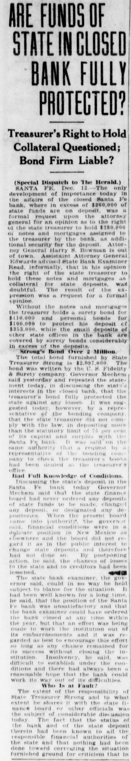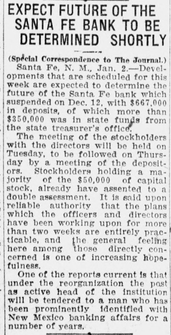 SANTA FE BANK CLOSES HOL LOING STATE DEPOSITS OF $367 000.00 Governor and State Treasurer Declare State Will Not Lose Cent, Owing to Securities Held, TREASURER'S BOND MAY PREVENT ANY LOSSES Other Officers of State Have Small Accounts in Institution; Rest of Santa Fe Banks Are Solvent. (SPECIAL DISPATCH TO MORNING JOURNAL} Santa Fe, Dec. 12.-Holding a total of about $367,000 in state funds, the Santa Fe bank, a state bank of this city, was closed today and was placed in the hands of the state bank examiner, J. B. Read. Mr. Read's only statement with to its was it "on account reference was closing condition of that deDr. of the sanapleted Mera, head resources." Sunmount Frank of the E. here, is president and Robert torium institution $50,000 W. Lynn and is cashier. Its capital is its surplus is $15,000. There is a statutory provision in Mexico restricting the state in single deposits New any capital institution and sur- to 75 cent of its That would have to about plus. per $48,000 remain however, allowed in the Santa Fe bank. It had, about $367,000 in state money, the great bulk of which came from the checking account of the state treasurer. The checking account of the treasurer was about $263,000. His account was $43,500, in The of stationary round numbers. certificate had totaled deposit which he in from the $356,500 $50,000, making treasurer. all reached around The total deposits in the bank $667,000. This fund was safeguarded by a bond, a bond from personal $110,000 surety the directors $100,000 notes of and and totaling the mortgages, bank, $280,000 $490,000. the in other state officials, land office $2,000 bond. $15,000 Of had surety secured The attorney by a had about secrestate about augeneral tary of $550, $6,000, $2,000, the the less than and general ditor the attorney slightly under funds $400. was The total of state slightly over $367.000. There was no demonstration in over the of the A few Santa bank. Fe today depositors closing came great and saw the sign but paid no it. was Santa Fe attention on the other to There banks, no since run it is known that both are entirely solvent. Governor M. C. Mechem stated that in the state deposits cent the since bank have been reduced 40 per That on January cate he took a total office. would 1 of indi- this Mr. Strong, state also had been reduced, year treasurer, of $600,000. indicated although that he they did not exceed If specify the deposits the amount. the state of that may be Treasurer law, it is possible Strong the liable. bond It He is under bond for $1,800,000. is possible that the amount over $48,000 which the treasurer deposited in the Santa Fe bank may be recovered in that manner. The following list shows the funds which the treasurer has had (Continued on Page Two.)