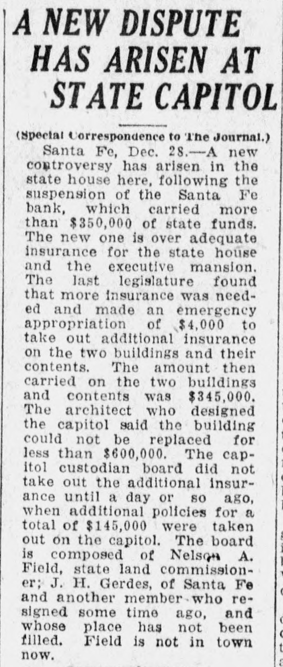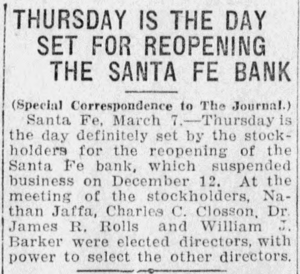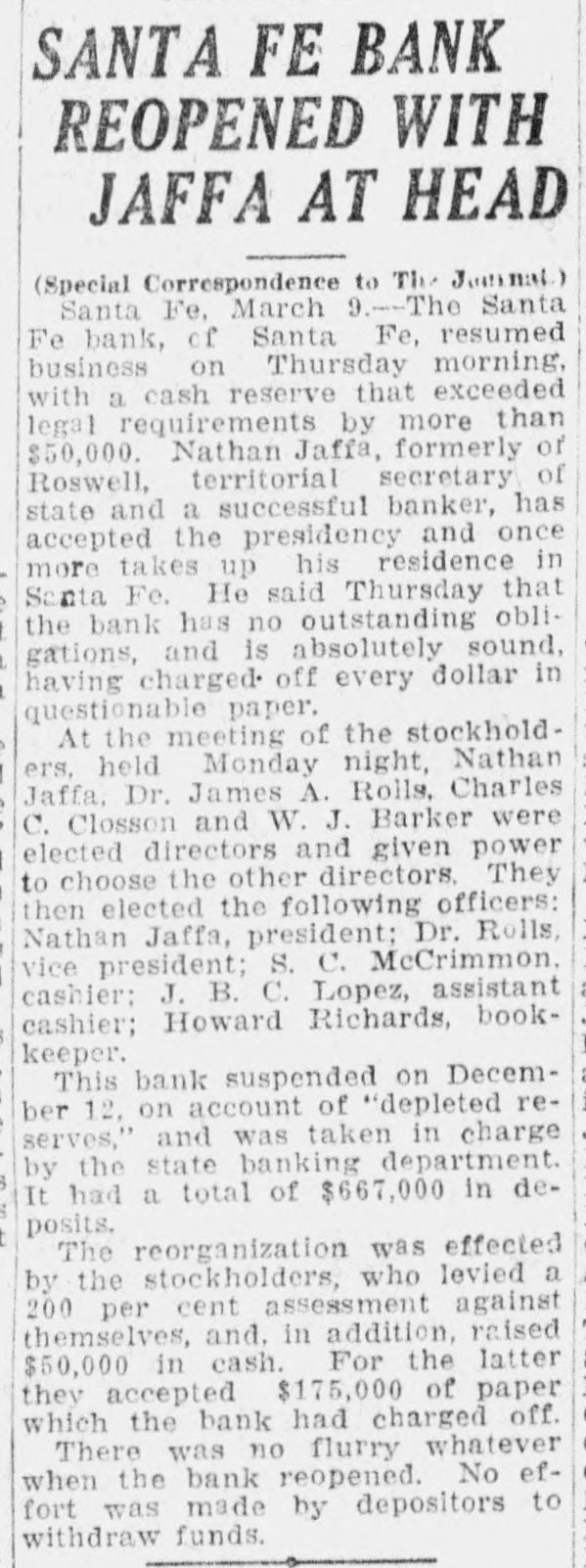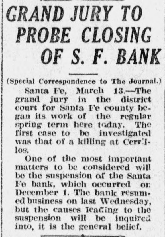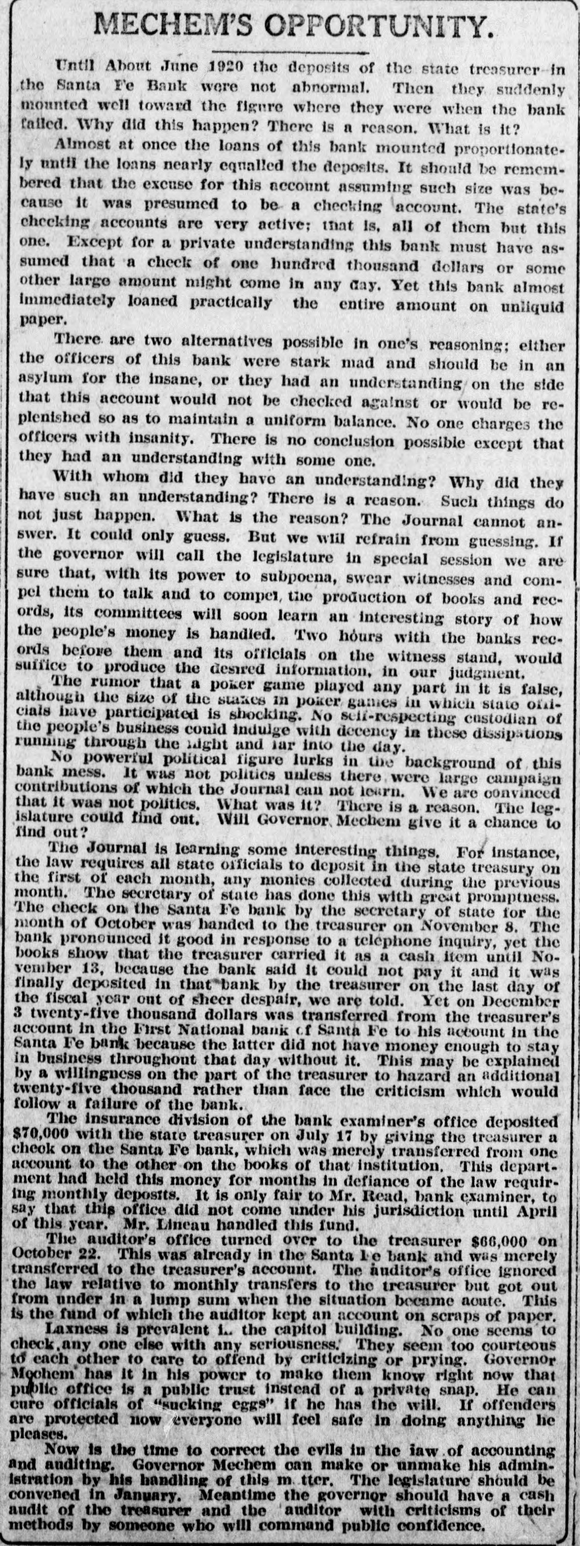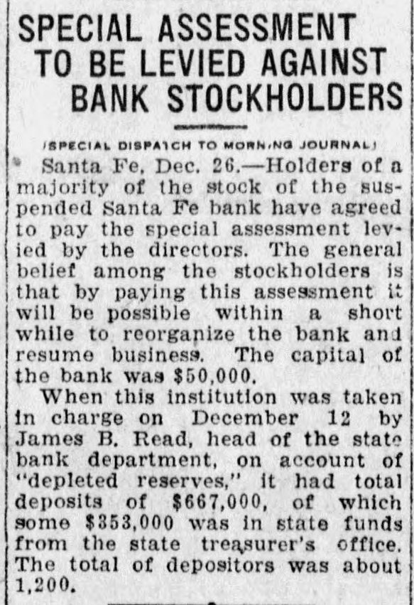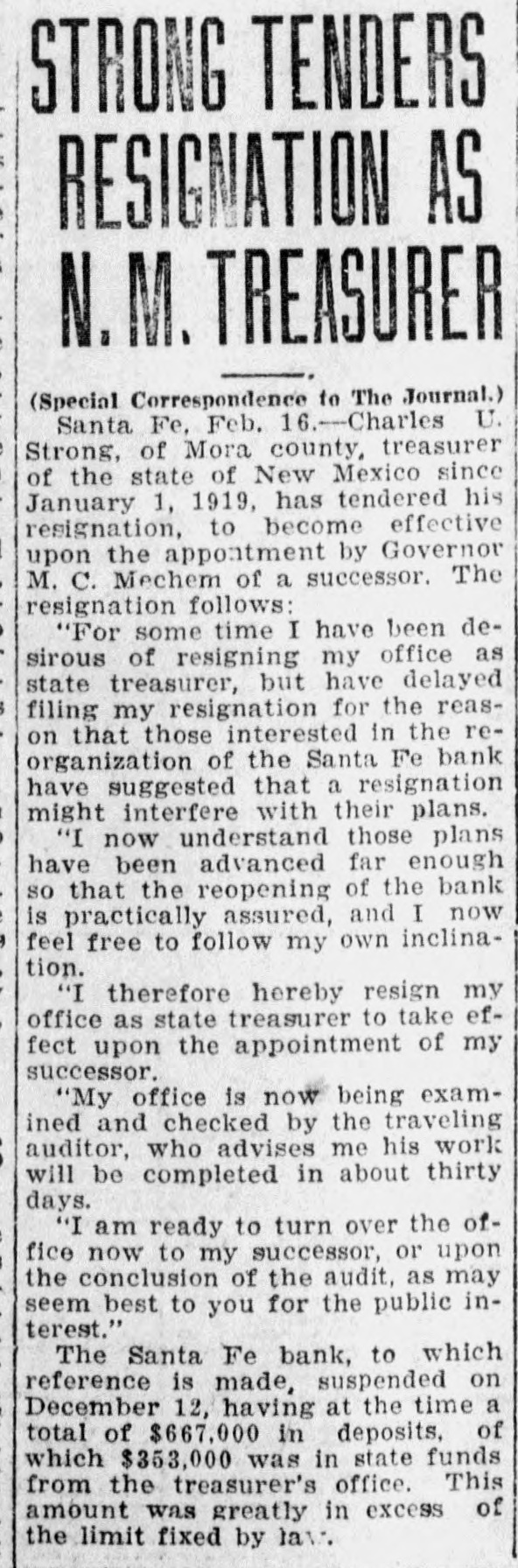 SANTA FE BANK CLOSES HOL LOING STATE DEPOSITS OF $367 000.00 Governor and State Treasurer Declare State Will Not Lose Cent, Owing to Securities Held, TREASURER'S BOND MAY PREVENT ANY LOSSES Other Officers of State Have Small Accounts in Institution; Rest of Santa Fe Banks Are Solvent. (SPECIAL DISPATCH TO MORNING JOURNAL} Santa Fe, Dec. 12.-Holding a total of about $367,000 in state funds, the Santa Fe bank, a state bank of this city, was closed today and was placed in the hands of the state bank examiner, J. B. Read. Mr. Read's only statement with to its was it "on account reference was closing condition of that deDr. of the sanapleted Mera, head resources." Sunmount Frank of the E. here, is president and Robert torium institution $50,000 W. Lynn and is cashier. Its capital is its surplus is $15,000. There is a statutory provision in Mexico restricting the state in single deposits New any capital institution and sur- to 75 cent of its That would have to about plus. per $48,000 remain however, allowed in the Santa Fe bank. It had, about $367,000 in state money, the great bulk of which came from the checking account of the state treasurer. The checking account of the treasurer was about $263,000. His account was $43,500, in The of stationary round numbers. certificate had totaled deposit which he in from the $356,500 $50,000, making treasurer. all reached around The total deposits in the bank $667,000. This fund was safeguarded by a bond, a bond from personal $110,000 surety the directors $100,000 notes of and and totaling the mortgages, bank, $280,000 $490,000. the in other state officials, land office $2,000 bond. $15,000 Of had surety secured The attorney by a had about secrestate about augeneral tary of $550, $6,000, $2,000, the the less than and general ditor the attorney slightly under funds $400. was The total of state slightly over $367.000. There was no demonstration in over the of the A few Santa bank. Fe today depositors closing came great and saw the sign but paid no it. was Santa Fe attention on the other to There banks, no since run it is known that both are entirely solvent. Governor M. C. Mechem stated that in the state deposits cent the since bank have been reduced 40 per That on January cate he took a total office. would 1 of indi- this Mr. Strong, state also had been reduced, year treasurer, of $600,000. indicated although that he they did not exceed If specify the deposits the amount. the state of that may be Treasurer law, it is possible Strong the liable. bond It He is under bond for $1,800,000. is possible that the amount over $48,000 which the treasurer deposited in the Santa Fe bank may be recovered in that manner. The following list shows the funds which the treasurer has had (Continued on Page Two.)