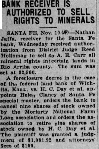 BANK RECEIVER IS AUTHORIZED TO SELL RIGHTS TO MINERALS SANTA FE, Nov. 10 Nathan Jaffa, receiver for the Santa Fe bank, Wednesday authorization from District Judge Reed Holloman to sell to E. Carr all mineral rights intertain lands in Rio Arriba county. The sum was set at $2,500. foreclosure decree in the case of the federal land bank of Wichita. Kans., vs. H. C. Day et al, appoints Helen Clancy of Santa Fe special master. orders the bank to cancel nine shares stock owned by the Moriarty National Farm Loan and orders the association to retire nine shares of stock owned by H. C. Day et al. The plaintiff was granted judgment of $1,081.92 and attorneys' of $100.