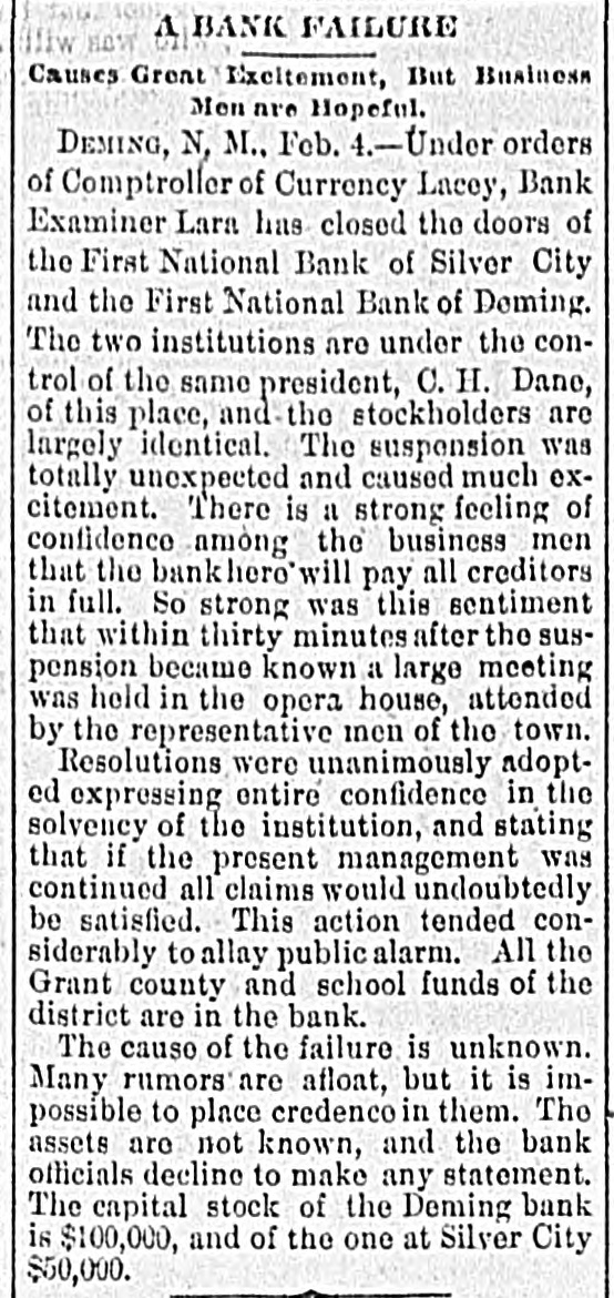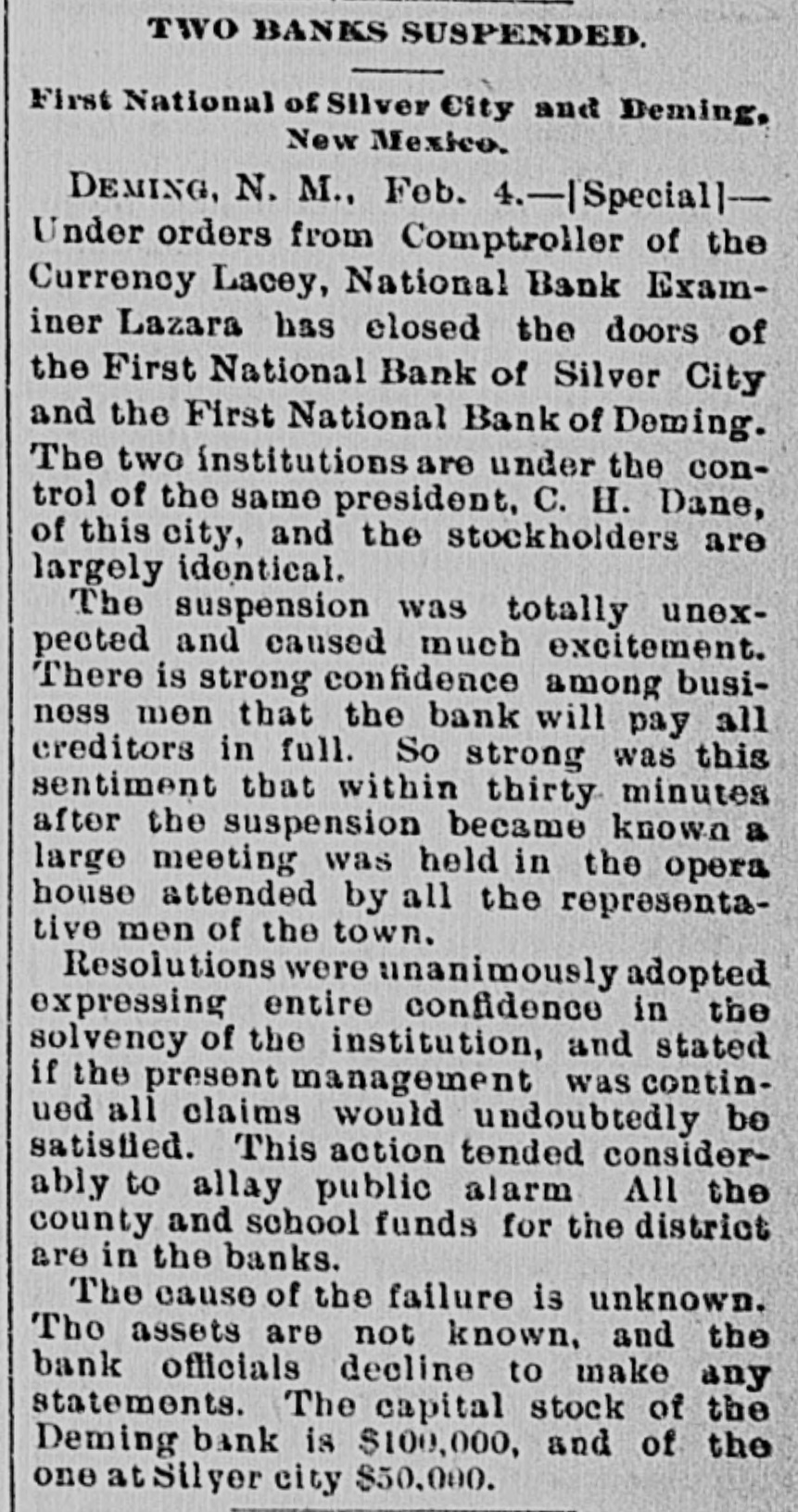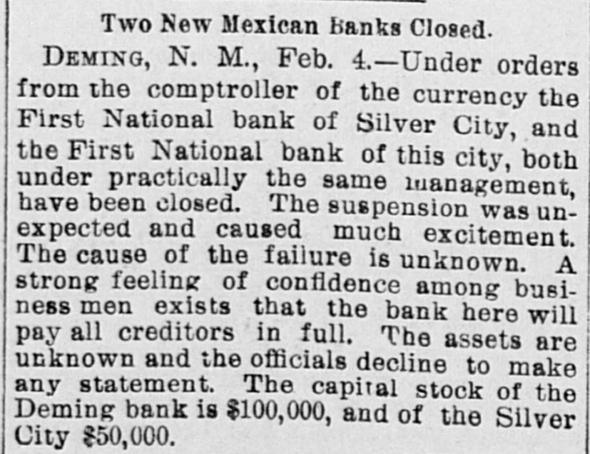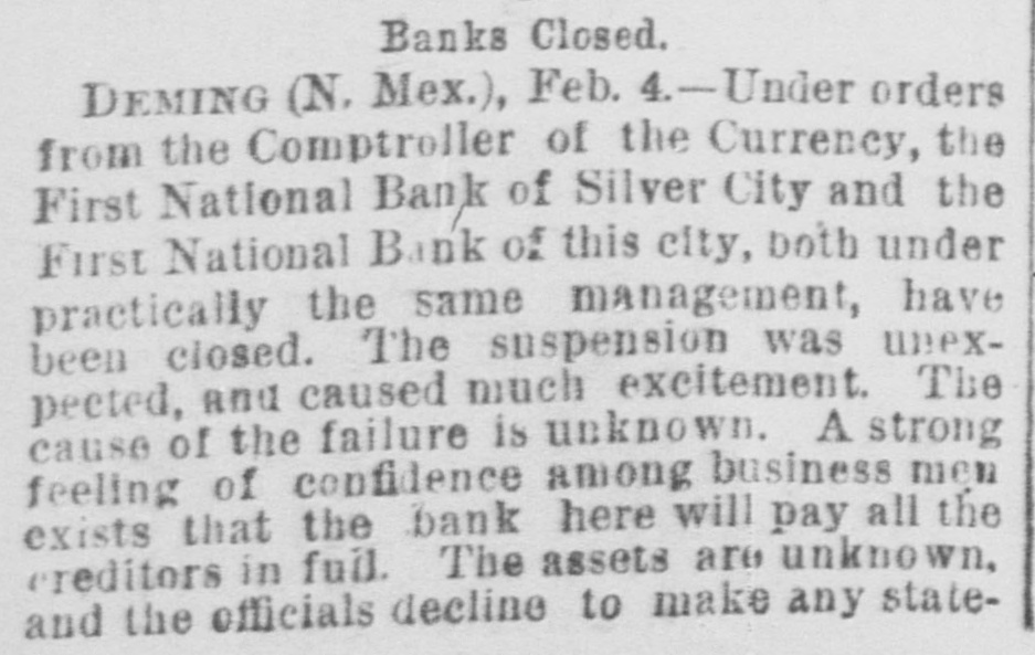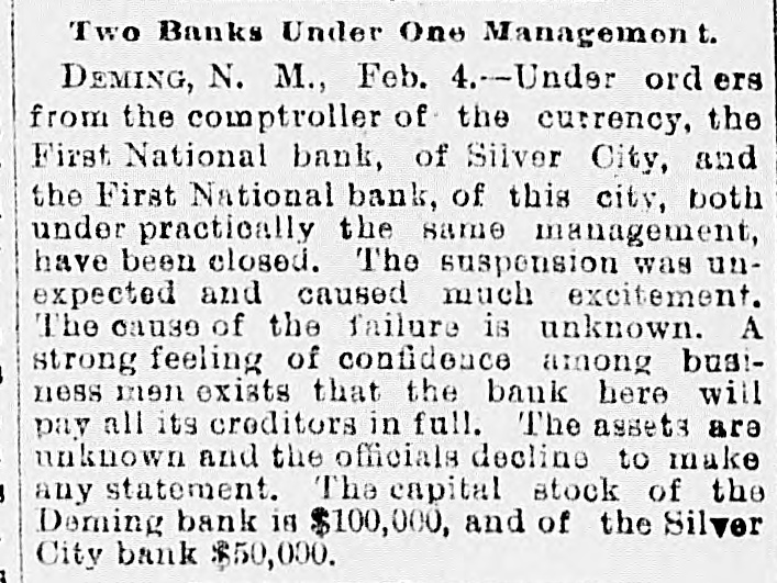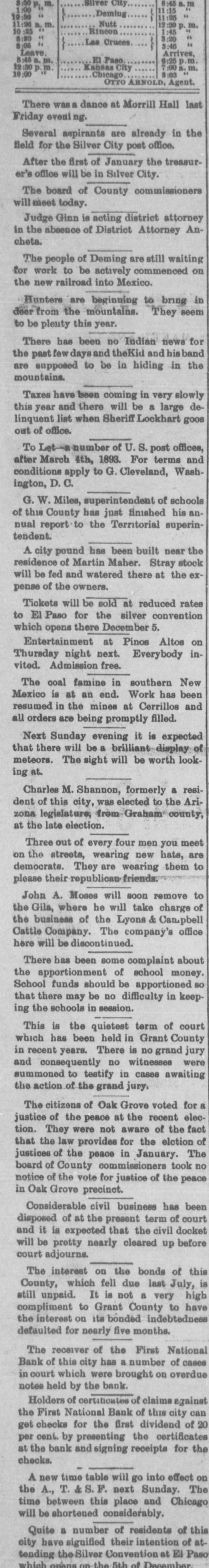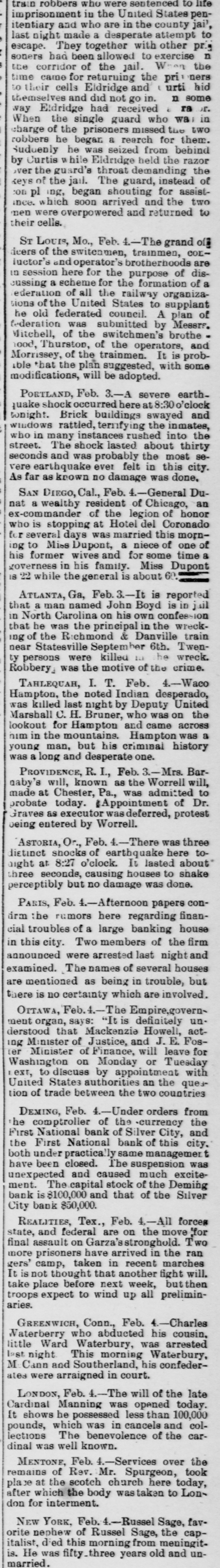 eur ou OUM SJ0000J imprisonment in the United States penitentiary and who are in the county jai', last night made a desperate attempt to escape. They together with other pr., soners bad been allowed to exercise n the corridor of the jail. When the time came for returning the pri ners to their cells Eldridge and 1 urti hid some u 'UI 08 you pip pur requested way Eldridge had received ra .Γ. When the single guard who wa in charge of the prisoners missed the two robbers he began a rearch for them. Suduenly he was seized from behind by Curtis и hile Eldridge held the razor ,ver the guard's throat demanding the keys of the jail. The guard, instead of on pl ing, began shouting for assistince. which soon arrived and the two to peanner pue релемодлело erem new their cells. ST LOUIS, Mo., Feb. 4.-The grand of dicers of the switchmen, trainmen, corluctor's and operator's brotherhoods are 10 session here for the purpose of disB JO the for scheme 8 Buissne ederation of all the railway organizaMons of the United States to supplant he old federated council. A plan of federation was submitted by Messrs. Mitchell, of the switchmen's brothe nood, Thurston, of the operators, and Morrissey, of the trainmen. It is probible that the plan suggested, with some modifications, will be adopted. PORTLAND, Feb. 3.-A severe earthquake shock occurred here at 8:30 o clock tonight. Brick buildings swayed and windows rattled, terrifying the inmates, who in many instances rushed into the street. The shock lasted about thirty seconds and was probably the most severe earthquake ever felt in this city. *euop was demand ou UMOUR SB far As SAN DIEGO, Cal., Feb. 4.-General Dunat a wealthy resident of Chicago, an ex-commander of the legion of honor who is stopping at Hotel del Coronado for several days was married this morning to Miss Dupont, a niece of one of his former wives and for some time a governess in his family. Miss Dupont 09 about SI Reneral the while 7.7 SI ATLANTA, Ga, Feb. 3.-It is reported that a man named John Boyd is in jail in North Carolina on his own confession that he was the principal in the wrecking of the Richmond & Danville train near Statesville September 6th. Twenty persons were killed 10 he wreck. Robbery was the motive of the crime. TAHLEQUAH, I. T. Feb. 4.-Waco Hampton, the noted Indian desperado, was killed last night by Deputy United the uo SUM очм Bruner's H in Varraball lookout for Hampton and came across him in the mountains. Hampton was a young man, but his criminal history was a long and desperate one. PROVIDENCE, R.I., Feb. 3.-Mrs. Barnaby' will, known as the Worrell will, SEM Part Chester, at ервш probate today. &Appointment of Dr. Graves as executor wasdeferred, protest being entered by Worrell. ASTORIA, Or., Feb. 4.-There was three distinct shocks of earthquake here tonight at 8:27 o'clock. It lasted about three seconds, causing houses to shake perceptibly but no damage was done. PARIS, Feb. 4.-Afternoon papers conbere eq: w.p cial troubles of a large banking house in this city. Two members of the firm announced were arrested last night and examined. The names of several houses are mentioned as being in trouble, but there is no certainty which are involved. OTTAWA, Feb.4.-The Empire,govern~ -un SI 4I,, :SABS 'ueSJo quem derstood that Mackenzie Howell, acting Minister of Justice, and J.E. Foster Minister of Finance, will leave for Washington on Monday or Tuesday ext, to discuss by appointment with United States authorities an the question of trade between the two countries DEMING, Feb. 4.-Under orders from the comptroller of the -currency the First National bank of Silver City, and the First National bank of this city. both under practically same managemer t have been closed. The suspension was unexpected and caused much excitement. The capital stock of the Deming bank is $100,000 and that of the Silver City bank $50,000. REALITIES, Tex., Feb. 4,-All forces state, and federal are on the move "for final assault on Garza'sstronghold. Two more prisoners have arrived in the ran gers' camp, taken in recent marches It is not thought that another fight will. take place before next week, but then troops expect to wind up all preliminaries. GREENWICH, Conn., Feb. 4.-Charles Waterberry who abducted his cousin, little Ward Waterbury, was arrested last night This morning Waterbury, M Cann and Southerland, his confederates were arraigned in court. LONDON, Feb. 4.-The will of the late Cardinal Manning was opened today. It shows he possessed less than 100,000 pounds, which was in cancels and collections The benevolence of the cardinal was well known. MENTONE, Feb. 4.-Services over the remains of Rev. Mr. Spurgeon, took pla at the scotch church here today, after which the body wastaken to London for interment. NEW YORK, Feb. 4.-Russel Sage, favorite nephew of Russel Sage, the capitalist, died this morning from meningitis. He was fifty three years old and unmarried.