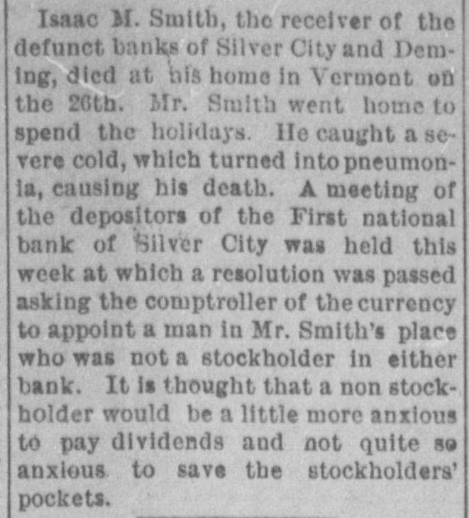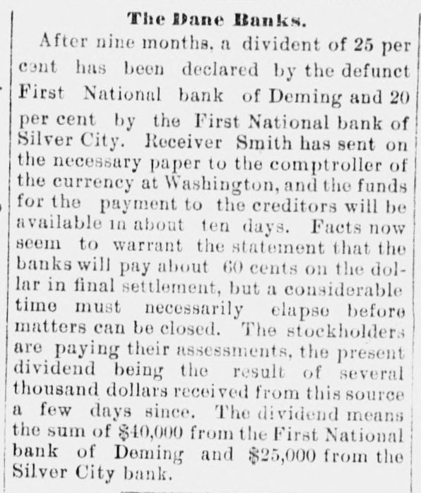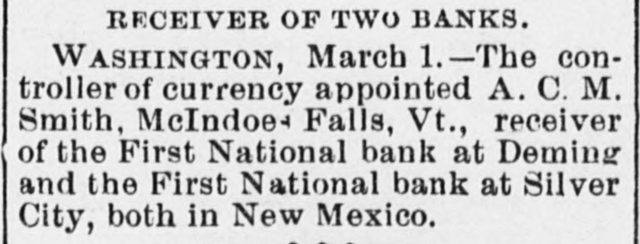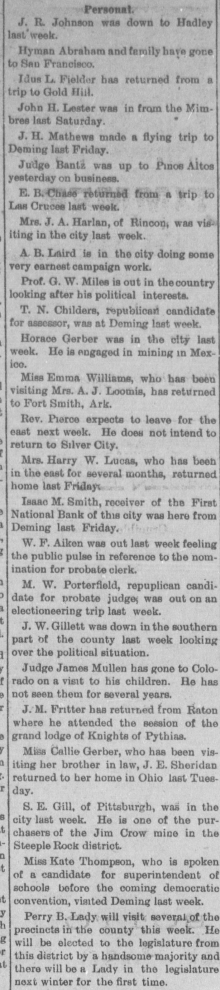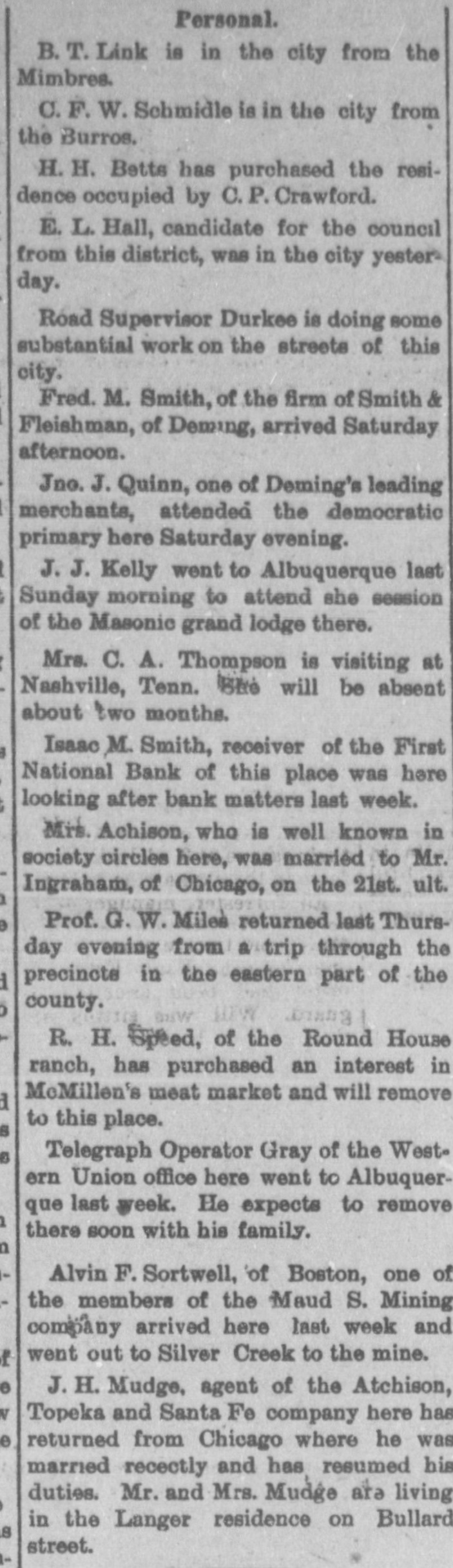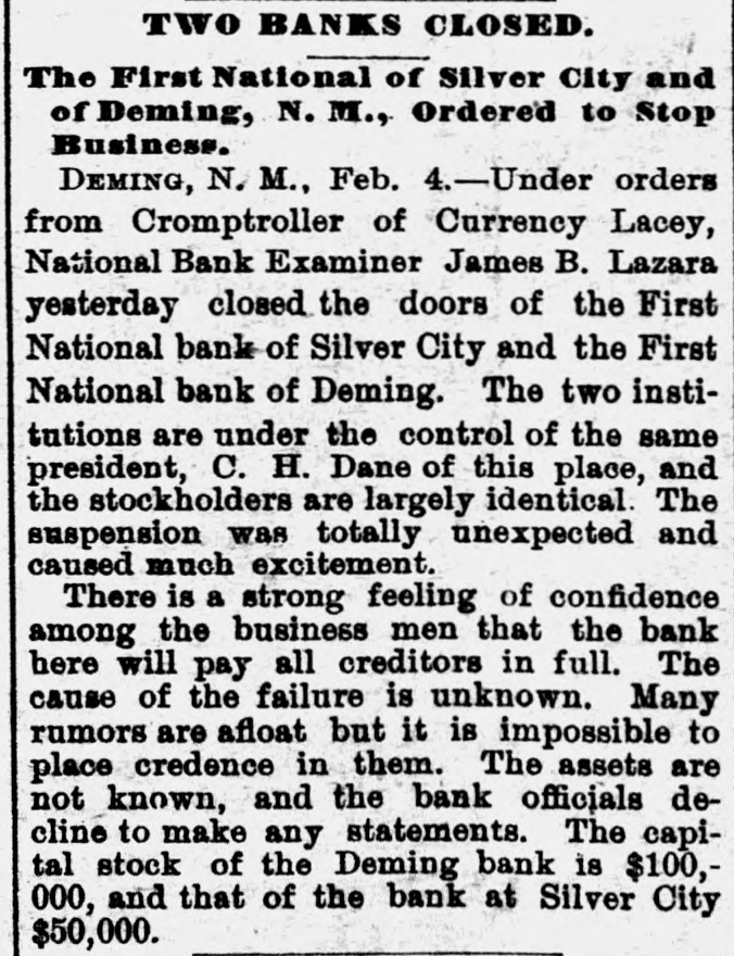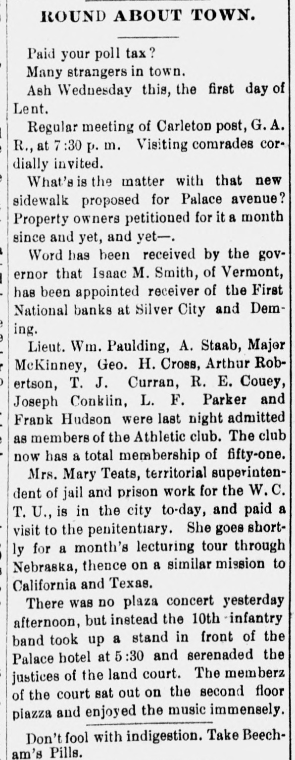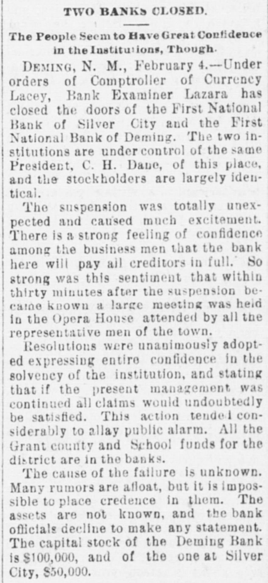eur ou OUM SJ0000J imprisonment in the United States penitentiary and who are in the county jai', last night made a desperate attempt to escape. They together with other pr., soners bad been allowed to exercise n the corridor of the jail. When the time came for returning the pri ners to their cells Eldridge and 1 urti hid some u 'UI 08 you pip pur requested way Eldridge had received ra .Γ. When the single guard who wa in charge of the prisoners missed the two robbers he began a rearch for them. Suduenly he was seized from behind by Curtis и hile Eldridge held the razor ,ver the guard's throat demanding the keys of the jail. The guard, instead of on pl ing, began shouting for assistince. which soon arrived and the two to peanner pue релемодлело erem new their cells. ST LOUIS, Mo., Feb. 4.-The grand of dicers of the switchmen, trainmen, corluctor's and operator's brotherhoods are 10 session here for the purpose of disB JO the for scheme 8 Buissne ederation of all the railway organizaMons of the United States to supplant he old federated council. A plan of federation was submitted by Messrs. Mitchell, of the switchmen's brothe nood, Thurston, of the operators, and Morrissey, of the trainmen. It is probible that the plan suggested, with some modifications, will be adopted. PORTLAND, Feb. 3.-A severe earthquake shock occurred here at 8:30 o clock tonight. Brick buildings swayed and windows rattled, terrifying the inmates, who in many instances rushed into the street. The shock lasted about thirty seconds and was probably the most severe earthquake ever felt in this city. *euop was demand ou UMOUR SB far As SAN DIEGO, Cal., Feb. 4.-General Dunat a wealthy resident of Chicago, an ex-commander of the legion of honor who is stopping at Hotel del Coronado for several days was married this morning to Miss Dupont, a niece of one of his former wives and for some time a governess in his family. Miss Dupont 09 about SI Reneral the while 7.7 SI ATLANTA, Ga, Feb. 3.-It is reported that a man named John Boyd is in jail in North Carolina on his own confession that he was the principal in the wrecking of the Richmond & Danville train near Statesville September 6th. Twenty persons were killed 10 he wreck. Robbery was the motive of the crime. TAHLEQUAH, I. T. Feb. 4.-Waco Hampton, the noted Indian desperado, was killed last night by Deputy United the uo SUM очм Bruner's H in Varraball lookout for Hampton and came across him in the mountains. Hampton was a young man, but his criminal history was a long and desperate one. PROVIDENCE, R.I., Feb. 3.-Mrs. Barnaby' will, known as the Worrell will, SEM Part Chester, at ервш probate today. &Appointment of Dr. Graves as executor wasdeferred, protest being entered by Worrell. ASTORIA, Or., Feb. 4.-There was three distinct shocks of earthquake here tonight at 8:27 o'clock. It lasted about three seconds, causing houses to shake perceptibly but no damage was done. PARIS, Feb. 4.-Afternoon papers conbere eq: w.p cial troubles of a large banking house in this city. Two members of the firm announced were arrested last night and examined. The names of several houses are mentioned as being in trouble, but there is no certainty which are involved. OTTAWA, Feb.4.-The Empire,govern~ -un SI 4I,, :SABS 'ueSJo quem derstood that Mackenzie Howell, acting Minister of Justice, and J.E. Foster Minister of Finance, will leave for Washington on Monday or Tuesday ext, to discuss by appointment with United States authorities an the question of trade between the two countries DEMING, Feb. 4.-Under orders from the comptroller of the -currency the First National bank of Silver City, and the First National bank of this city. both under practically same managemer t have been closed. The suspension was unexpected and caused much excitement. The capital stock of the Deming bank is $100,000 and that of the Silver City bank $50,000. REALITIES, Tex., Feb. 4,-All forces state, and federal are on the move "for final assault on Garza'sstronghold. Two more prisoners have arrived in the ran gers' camp, taken in recent marches It is not thought that another fight will. take place before next week, but then troops expect to wind up all preliminaries. GREENWICH, Conn., Feb. 4.-Charles Waterberry who abducted his cousin, little Ward Waterbury, was arrested last night This morning Waterbury, M Cann and Southerland, his confederates were arraigned in court. LONDON, Feb. 4.-The will of the late Cardinal Manning was opened today. It shows he possessed less than 100,000 pounds, which was in cancels and collections The benevolence of the cardinal was well known. MENTONE, Feb. 4.-Services over the remains of Rev. Mr. Spurgeon, took pla at the scotch church here today, after which the body wastaken to London for interment. NEW YORK, Feb. 4.-Russel Sage, favorite nephew of Russel Sage, the capitalist, died this morning from meningitis. He was fifty three years old and unmarried.