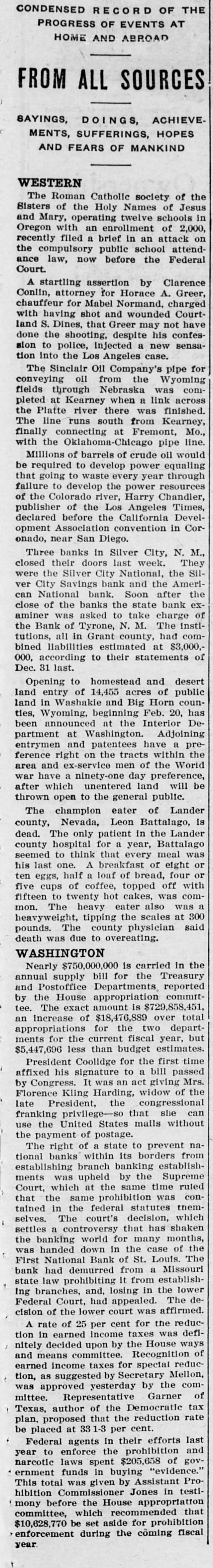 CONDENSED RECORD OF THE PROGRESS OF EVENTS AT HOME AND ABROAD FROM ALL SOURCES < SAYINGS, DOINGS, ACHIEVEMENTS, SUFFERINGS, HOPES AND FEARS OF MANKIND WESTERN Catholic society of the of the Holy in and operating twelve 2,000, Sisters The Mary, Roman Names schools of of Jesus Oregon with an enrollment attack recently filed a brief in an attend- on compulsory public school Federal ance the law, now before the Court. A startling assertion by Clarence Greer, Conlin, attorney for Horace A. charged chauffeur for Mabel Normand, Courtwith having shot and wounded have land S. Dines, that Greer may not confesdone the shooting, despite his sensasion to police, injected a new tion into the Los Angeles case. The Sinclair Oil Company's pipe for conveying oil from the Wyoming comfields through Nebraska was across at Kearney when a link finished. pleted Platte river there was the line runs south from Kearney, Mo., The connecting at Fremont, line. with finally the Oklahoma-Chicago pipe would Millions of barrels of crude oil equaling required to develop power through be that going to waste every year resources failure to develop the power Chandler, the Colorado river, Harry Times, of of the Los Angeles Develpublisher declared before the California in Coropment Association convention onado, near San Diego. Three banks in Silver City, N. They M., their doors last week. the Silclosed the Silver City National, Ameriwere City Savings bank and the after the ver National bank. Soon bank excan of the banks the state of close was asked to take charge instiaminer Bank of Tyrone, N. M. The had comthe all in Grant county, $3,000,tutions, liabilities estimated at of 000, bined according to their statements Dec. 31 last. to homestead and public desert Opening entry of 14,455 acres of counland in Washakie and Big Horn 20, has land ties, Wyoming, beginning at the Interior Feb. Debeen announced at Washington. Adjoining a prepartment and patentees have within the entrymen right on the tracts World ference and ex-service men of preference, the area have a ninety-one day will be war which unentered land public. after thrown open to the general Lander The champion eater Battalago, of is Nevada, Leon Lander county, The only patient in the Battalago dead. hospital for a year, meal was county to think that every eight or seemed one. A breakfast of four or his last half a louf of bread, off with ten eggs, of coffee, topped was comfive cups to twenty hot cakes, also was a fifteen The heavy eater scales at 300 heavyweight, mon. tipping the said pounds. The county physician death was due to overeating. WASHINGTON the bill for the Nearly $750,000,000 is carried Treasury in and annual Postoffice supply Departments reported commitby the House amount appropriation is $729,858,451 total tee. increase The exact of $18,476,889 over departappropriations an for the two year, but the current fiscal estimates. ments for less than budget time , to a $5,447,696 President Coolidge for the bill first passed affixed Congress. his signature It was an act widow giving of Mrs. the . the President, by Florence Kling Harding, congressional she can franking late privilege-so that mails without use the United States the payment of postage. right of a state to borders prevent from naThe banks within its establishtional branch banking Supreme establishing was upheld by the time ruled , ments which at the same conCourt, the same prohibition was themthat in the federal statutes which tained The court's decision, shaken . settles selves. a controversy that has months, banking world for many case of the the handed down in the Louis. The was National Bank of St. Missouri First demurred from a establishbank had prohibiting it from the lower state branches, law and, losing in The deing Court, had appealed. affirmed. Federal of the lower court was reduccision rate of 25 per cent for the was defiA income taxes tion in earned by the House ways of nitely decided upon Recognition means committee. reducand income taxes for special Mellon, earned suggested by Secretary the comtion, approved as yesterday by Garner of mittee. was Representative the Democratic rate tax proposed that the Texas, plan, author of cent. reduction be placed at 33 1-3 per . last agents in their efforts and Federal the prohibition year narcotic to laws enforce spent buying $205,658 "evidence." of gov- funds in Assistant Proernment This total was given by Jones in testihibition Commissioner House appropriation before the recommended that mony which prohibition , committee, set aside for fiscal $10,628,770 enforcement be during the coming year
