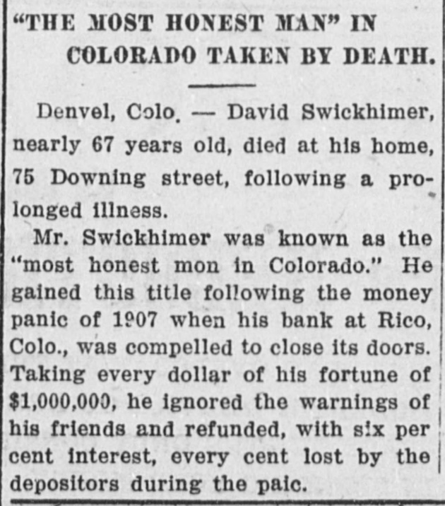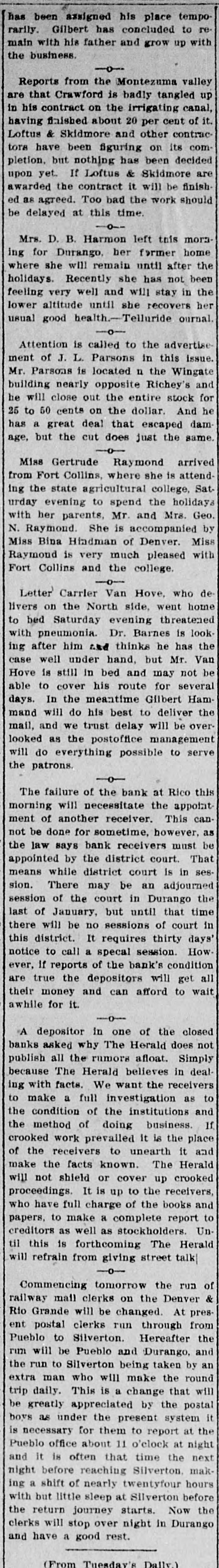 has been assigned his place tempo rarily. Gilbert has concluded to remain with his father and grow up with the business. -0Reports from the Montezuma valley that Crawford is badly tangled up are in his contract on the irrigating canal, it. having fruished about 20 per cent of Loftus & Skidmore and other contractors have been figuring on its completion. but nothing has been decided are yet. If Loftus & Skidmore awarded upon the contract it will be finished as agreed. Too bad the work should be delayed at this time. -0-Mrs. D. B. Harmon left this moraing for Durango, her former home the where she will remain until after holidays. Recently she has not been feeling very well and will stay in the lower altitude until she recovers her usual good ealth.-Telluride ournal. -0Attention is called to the advertise ment of J. L. Parsons in this issue. Mr. Parsons is located n the Wingate building nearly opposite Richey's and for he will close out the entire stock 25 to 50 cents on the dollar. And he has a great deal that escaped damage, but the cut does just the same. -0 Miss Gertrude Raymond arrived from Fort Collins, where she is attending the state agricultural college, Saturday evening to spend the holidaya with her parents, Mr. and Mrs. Geo. N. Raymond. She is accompanied by Miss Bina Hindman of Denver. Miss Raymond is very much pleased with Fort Collins and the college. -0Letter Carrier Van Hove, who de livers on the North side, went home to bed Saturday evening threatened with pneumonia. Dr. Barnes is look- the ing after him and thinks he has case well under hand, but Mr. Van Hove is still in bed and may not be able to cover his route for several days. In the meantime Gilbert Ham mand will do his best to deliver the mail, and we trust delay will be overlooked as the postoffice management will do everything possible to serve the patrons. -0The failure of the bank at Rico this morning will necessitate the appotatment of another receiver. This cannot be done for sometime, however, as the law says bank receivers must be appointed by the district court. That means while district court is in session. There may be an adjourned session of the court in Durango the last of January, but until that time there will be no sessions of court in this district. It requires thirty days' notice to call a specal session. However, if reports of the bank's condition all are true the depositors will get their money and can afford to wait awhile for it. -0A depositor in one of the closed banks asked why The Herald does not publish all the rumors afloat. Simply because The Herald believes in dealing with facts. We want the receivers to make a full investigation as the to condition of the institutions and the method of doing business. If crooked work prevailed it is the place of the receivers to unearth it and make the facts known. The Herald will not shield or cover up crooked proceedings. It is up to the receivers, who have full charge of the books and papers, to make a complete report Un- to creditors as well as stockholders. til this is forthcoming The Herald will refrain from giving street talk -0Commencing tomorrow the run of & railway mail clerks on the Denver Rio Grande will be changed. At present postal clerks run through from Pueblo to Silverton. Hereafter the run will be Pueblo and Durango, and the run to Silverton being taken by an who will make This is a change extra trip daily. man the that round will be greatly appreciated by the postal it boys as under the present system is necessary for them to report at the Pueblo office about 11 o'clock at night and it is often that time the next night before reaching Silverton making a shift of nearly twentyfour hours with but little sleep at Silverton before the the return journey starts. Now clerks will stop over night in Durango and have a good rest. From Tuesday's Dally.)