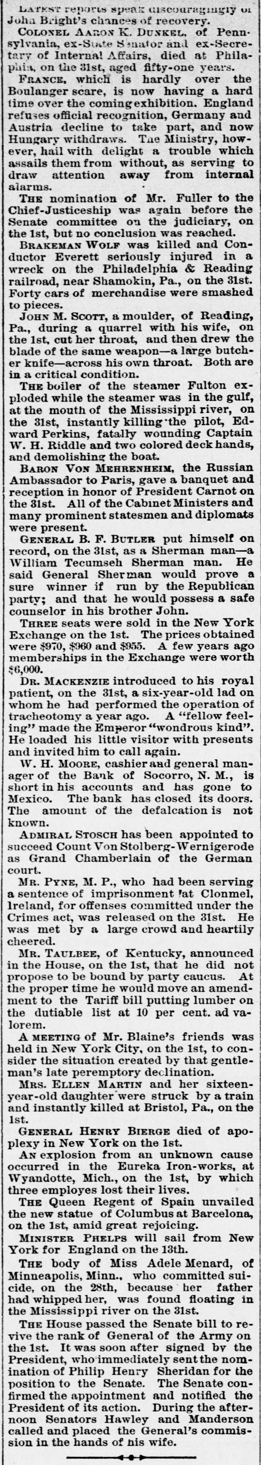 OXFORD, MISS., THURSDAY, JUNE 7, 1888. COLONEL AARON K. DUNKEL of Penn. SOUTHERN GLEANING GENERAL SHERIDAN. sylvania, ex-State Senator and ex-Secretary of Internal Affairs, died at PhilaJoseph Isminger was attested at ville, Tenn., a few days ago for phia, on the 31st, aged fifty-one years. The Gallant Soldier's Ambition tion of the revenue laws. He W/ JOHN M. Scorr, a moulder. of Reading, Gratified on His Deathbed. to Chattanooga and bound over Pa. during a quarrel with his wife, on next term of the United States Co the 1st. cut her throat, and then drew the J. W. Chandler, who shot Pr blade of the same weapon-a large butchThe Grade of General of the Army Reer knife-across own throat. Both are vived to Honor the Brave Soldier rence at Jellico, Te n. was t -His Commission Received in a critical condition. Knoxville to keep him out of th and Accepted mob violence. It is evident th THE boiler of the steamer Fulton ét: rence can not recover. and it wa ploded while the steamer was in the gulf, that if Chandler was allowed to r at the mouth of the Mississippi river, on WASHINGTON, June 1.-The House toJellico he would be lynched. the 31st, instantly killing the pilot, Edday passed the Senate bill to revive the A shooting affray occurred ward Perkins, fatally wounding Captain rank of General of the Army for the one. W. H. Riddle and two colored deck hands, Lick Springs, Ky., a few days fit of General Sheridan. A half hour aft. and demolishing the boat. which J. A. Secrist. proprietor er the passage of the bill It was enBARON Vox MEHRENHEIM, the Russian springs. and B. F. Porter, ex-si grossed, signed by the Speaker and presiPendleton County, were dan Ambassador to Paris, gave a banquet and dent of the Senate and dispatched by shot. Several others were reception in honor of President Carnot on special messenger to the President for his wounded. the 31st. All of the Cabinet Ministers and approval. The bill was at once signed by many prominent statesmen and diplomats The style of the company en the President and the nomination of were present. building a railroad from Knoxvill Philip Henry Sheridan to be General of GENERAL B. F. BUTLER put himself or to Cumberland Gap, sixty-five m of the United States Army was at once record, on the 31st, as a Shermon man-a been changed from the Powell's forwarded to the Senate. That body Im. William Tecumsch Sherman man. He Company to the Knoxville, Cun mediately went into executive session and said General Sher man would prove a Gap & Louisville Company. Wo confirmed the appointment. sure winner if run by the Republican road is progressing favorably. party: and that he would possess a safe Robert Hendricks, who myst counselor in his brother John. disappeared from the Western K BRAKEMAN WOLF was killed and ConLunatic Asylum more than a y ductor Everett seriously injured in a landed in Franklin a few days a wreck on the Philadelphia & Reading arrival produced a profound sens railroad, near Shamokiu, Pa., on the 31st. it was evidently thought by hisfar Forty cars of merchandise were smashed the public that he had either been to pieces. tim of foul play at the asylum or wandered off and died. He ret DR. MACKENZIE introduced to his royal patient, on the 31st, a six-year-old lad on the full possession of his mind, whom he had +performed the operation of hale and hearty. He gives a thril tracheotomy a year ago. A "fellow feelcount of his escape from the asy his adventures since. ing" made the Emperor "wondrous kind". He loaded his little visitor with presents The Supreme Court of Georgia and invited him to call again. affirmed a judgment of $10,000 aw a negro for the loss of a foot in a W. H. MOORE, cashier and general manager of the Bank of Socorro, N. M., is accident, but the negro is missing short in his accounts and has gone to attorneys, who are to get half the Mexico. The bank has closed its doors. are anxiously hunting for him. The amount of the defalcation is not Much excitement has prevailed known. County, Ky., recently by the pre ADMIRAL STOSCH has been appointed to mad dogs. Mrs. James Hancock General Philip H. Sheridan. succeed Count Von Stolberg-Wernigerode ten at Long Hollow by a pet As soon as the Senate in executive as Grand Chamberlain of the German showed all the symptons of hydr session confirmed the nomination of Lieucourt. and a madstone has been applie tenant-General Sheridan to be General, MR. PYNE, M. P., who had been serving wound, which is a painful one. Senators Hawley and Manderson took a a sentence of imprisonment fat Clonmel, was killed, but not until a numbe carriage and were rapidly driven to the Ireland, for offenses committed under the er dogs were bitten by it, some White House. They were immediately Crimes act, was released on the 31st. He were still at large, while oth received by the President, who handed was met by a large crowd and heartily caught and shut up to see if the Senator Hawley the parchment commischeered. oped signs of madness. sion. Five minutes later they were in the MR. TAULBEE, of Kentucky, announced The tobacco firm of J. Simon & drawing-room of the Sheridan home. in the House, on the 1st, that he did not Montgomery, Ala., was sold out Mrs. Sheridan was summoned, and soon propose to be bound by party caucus. At to certain local creditors to satist appeared. Senator Hawley handed her the proper time he would move an amendamounting to $14,000. There ar the commission with a few appropriate ment to the Tariff bill putting lumber on creditors, who will suffer to the words. the dutiable list at 10 per cent. ad vabetween $12,000 and $15,000. Mrs. Sheridan told the Senators that she lorem. Henry Fuller, a young white I thanked them and all others who had asA MEETING of Mr. Blaine's friends was in Pickens County, S. C., was sisted in conferring this great honor on held in New York City, on the 1st, to conand instantly killed a few days a her husband. "If any thing can him, sider the situation created by that gentleler h